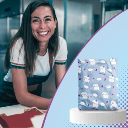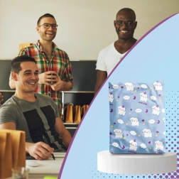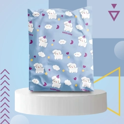 - Štýlový dizajn: modrá potlač so psami a obláčikmi zaujme zákazníkov.