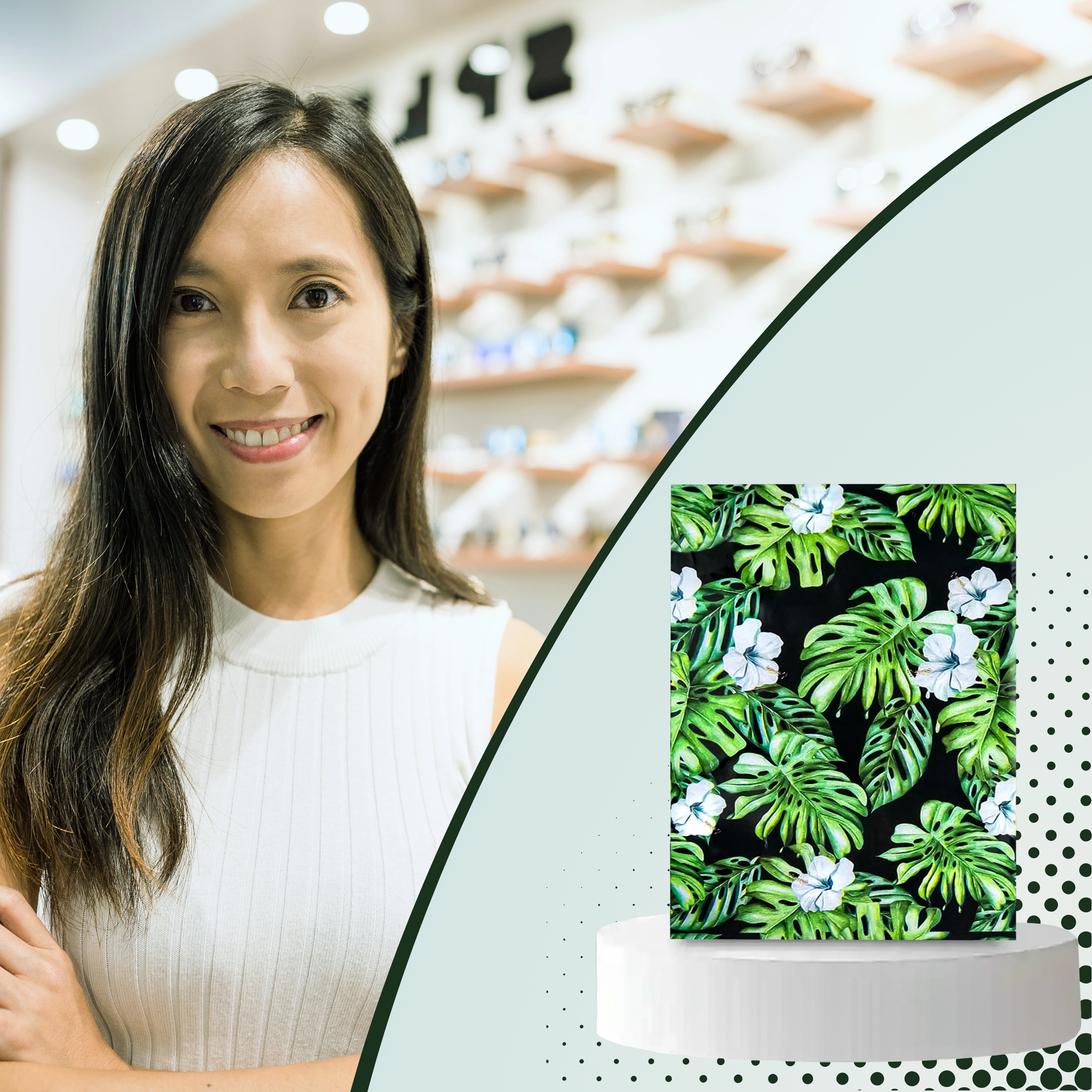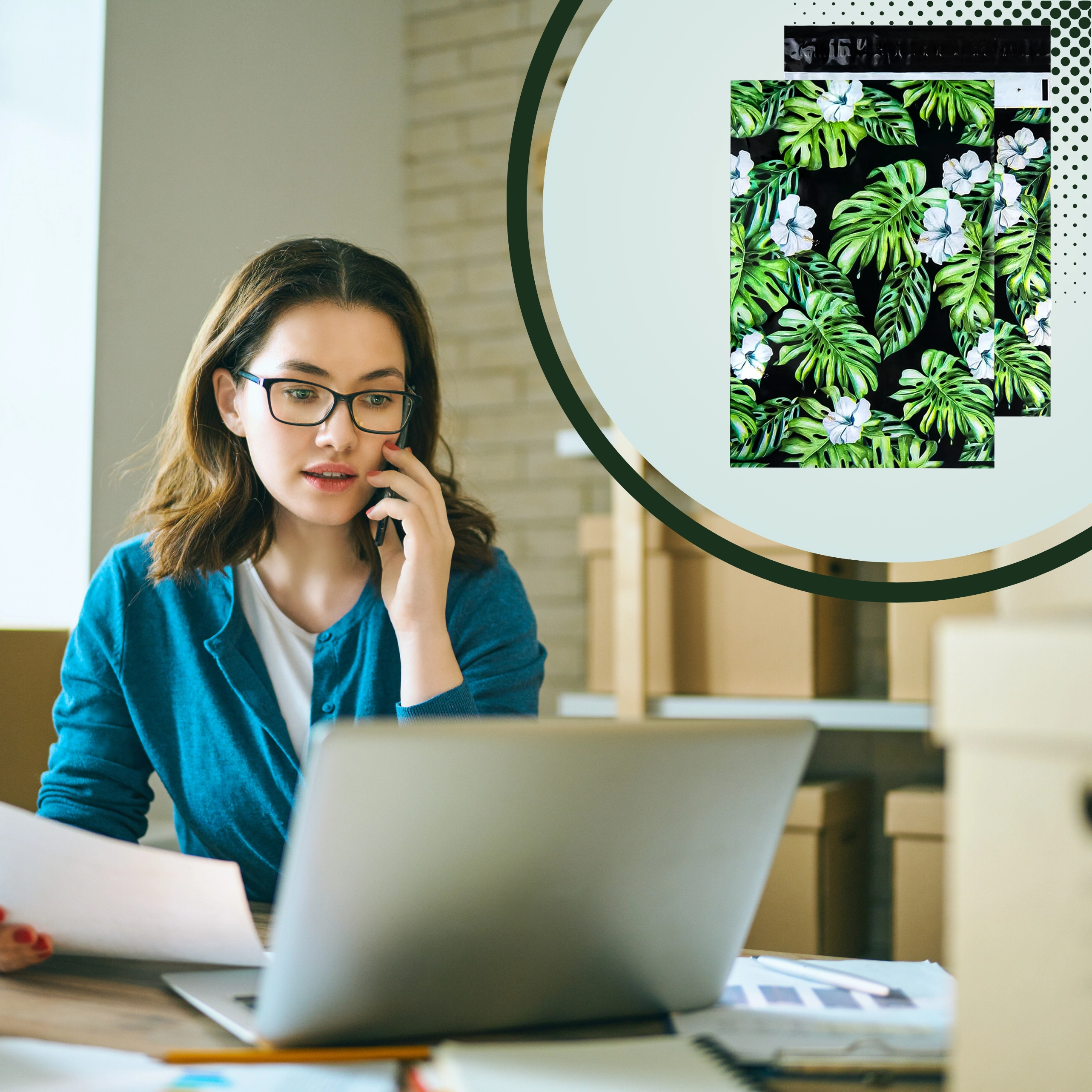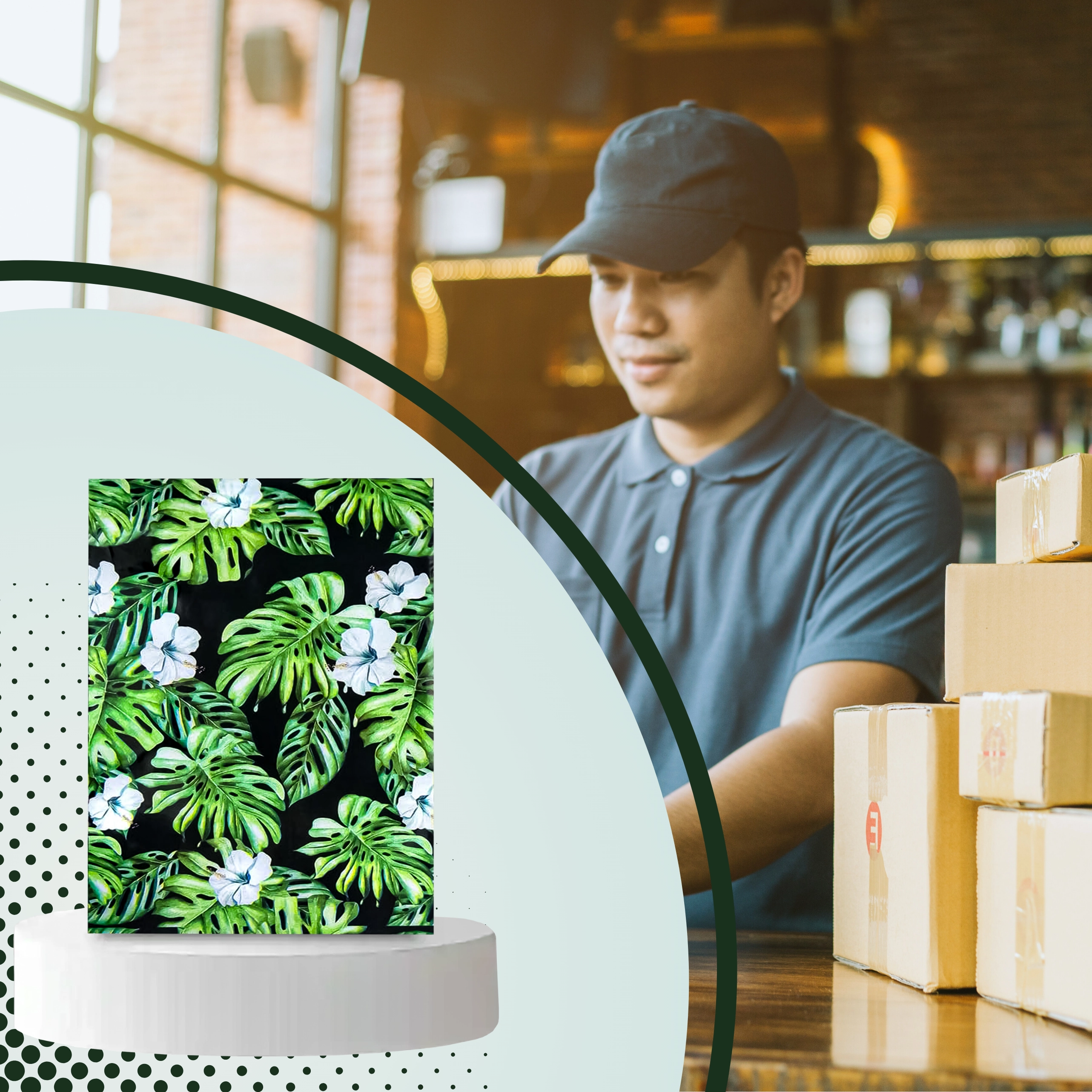 Tlač s motívom listov a kvetov na tmavom podklade dodá vašim zásielkam výrazný vzhľad a posilní brand pri doručení.