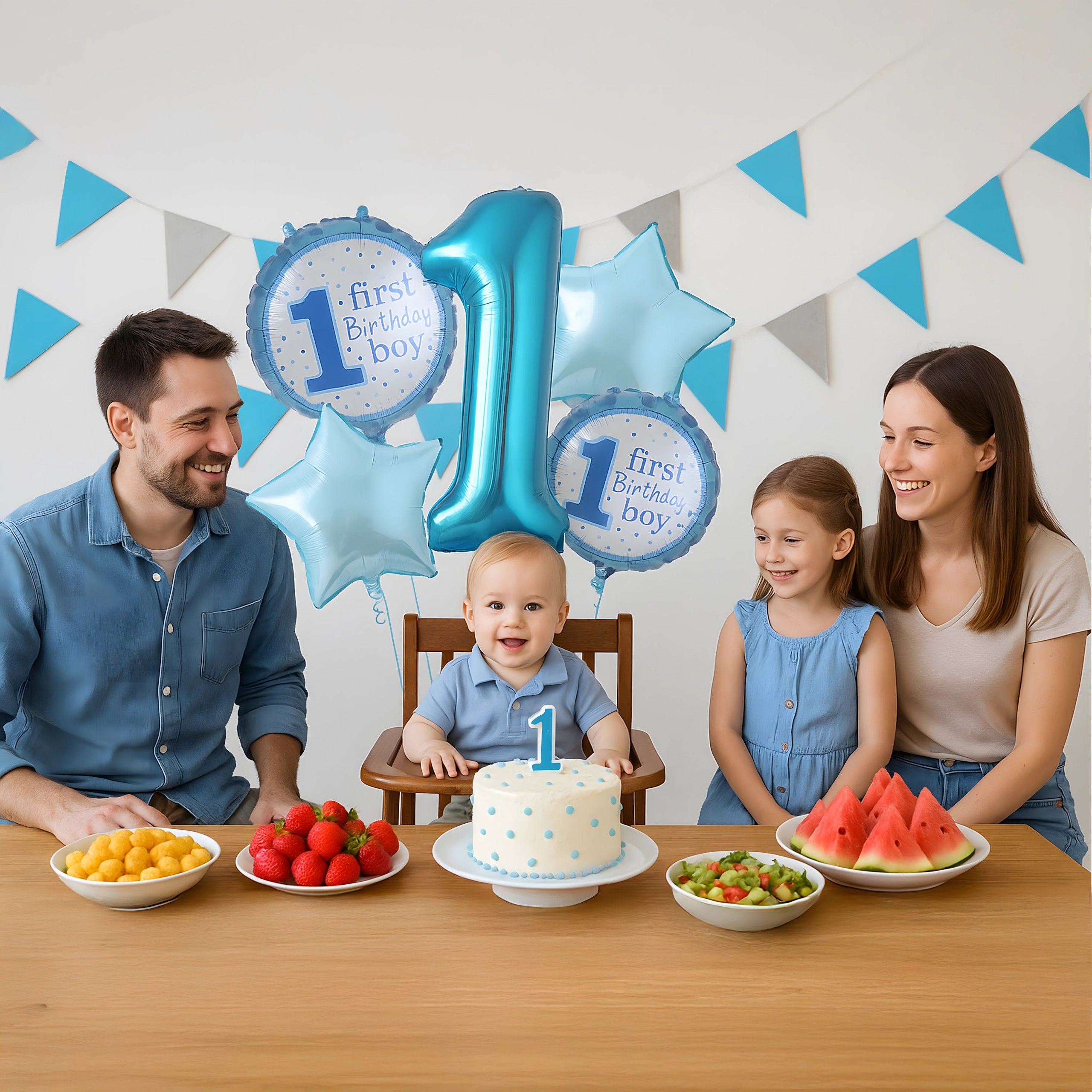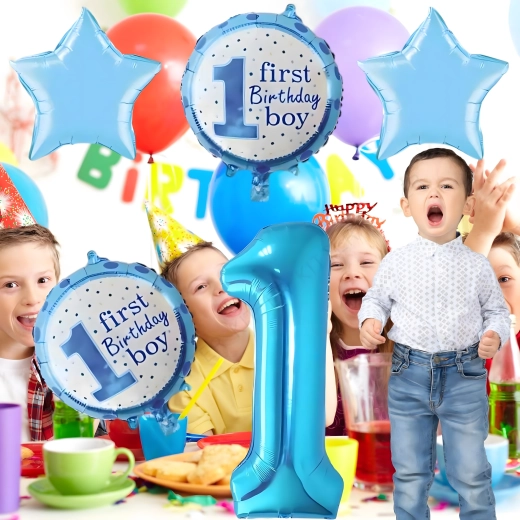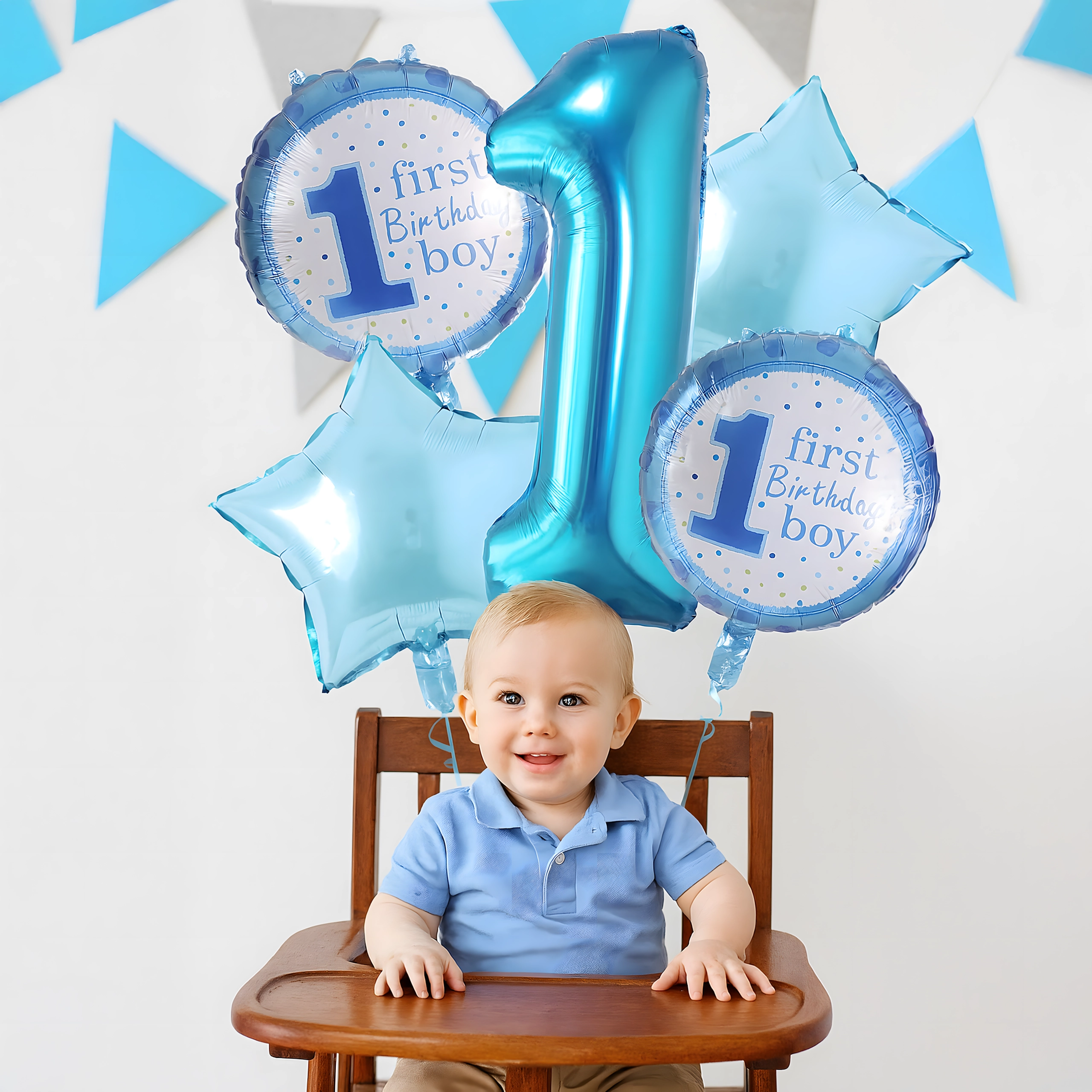 Vytvorte čarovnú atmosféru prvej oslavy! Táto sada balónov pre chlapca kombinuje motív čísla 1, hviezdičky a nápis First Birthday Boy, vďaka čomu je perfektná na narodeninovú párty, fotokútik aj ozdobenie detskej izby.