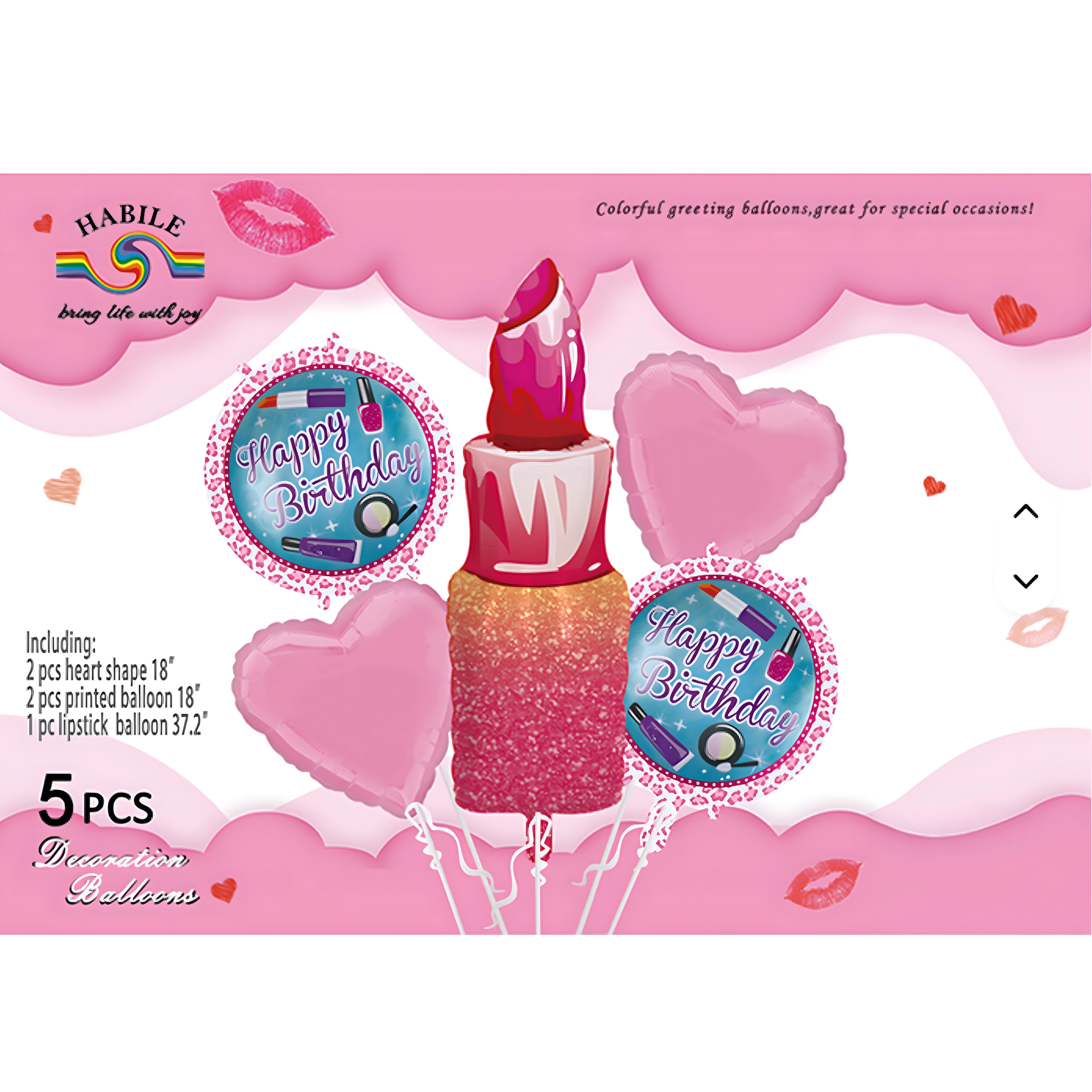 Štýlová sada narodeninových balónikov pre dievčatá obsahuje 5 kusov: rúž, pery, 2 balóniky s nápisom Happy Birthday a srdce. Skvelé na narodeniny, rozlúčku so slobodou a ďalšie dámske oslavy.