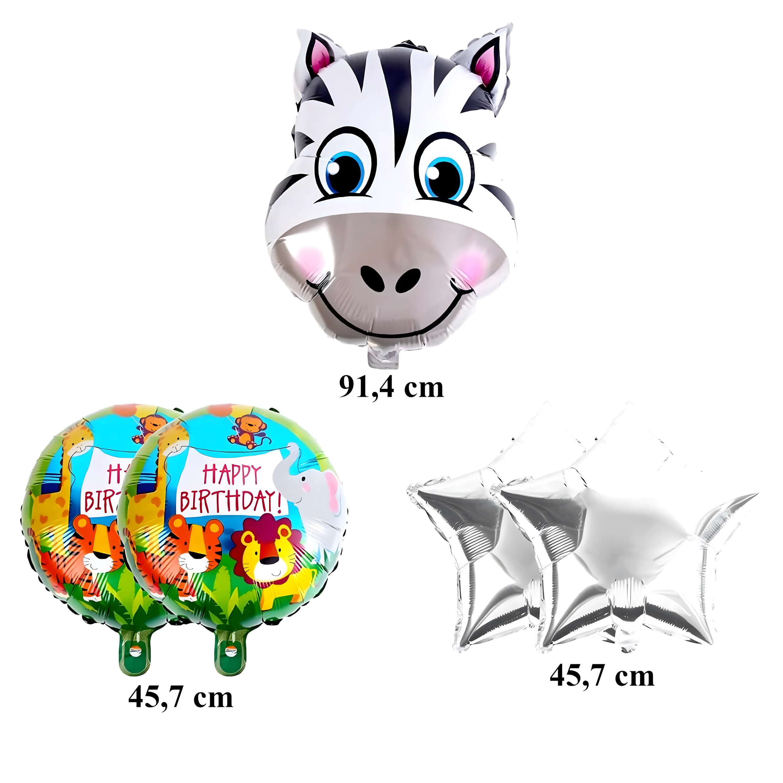 Veselá súprava balónikov so žirafou rozžiari každú detskú oslavu. V balení nájdete 1 fóliový balónik žirafa, 2 balóniky s nápisom HAPPY BIRTHDAY a 2 zlaté hviezdičky – ideálne na narodeniny v štýle zoo/safari.