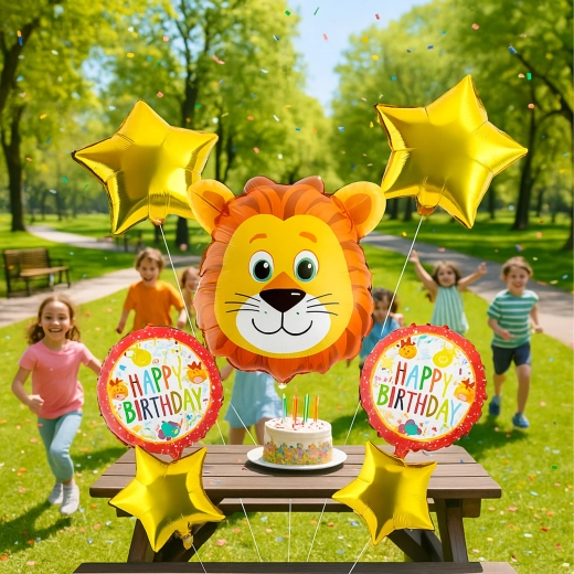 Táto tematická sada prinesie na vašu oslavu atmosféru divokej prírody. Vďaka kombinácii leva, nápisov HAPPY BIRTHDAY a zlatých hviezdičiek ľahko vytvoríte pútavú výzdobu, ktorá zaujme deti aj dospelých.