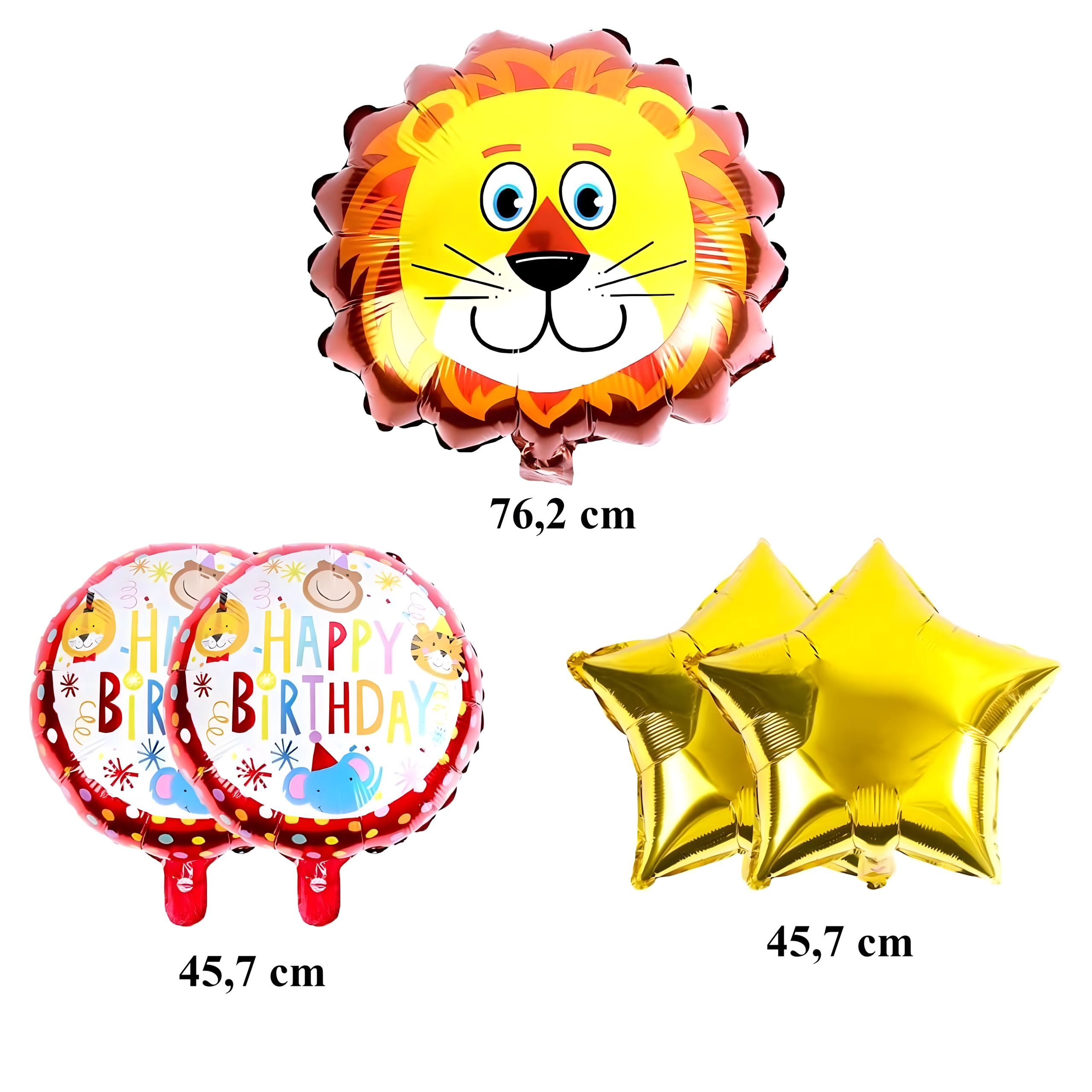 Veselá sada narodeninových balónikov s motívom safari poteší každú detskú oslavu. Obsahuje 1 balónik v tvare leva, 2 balóniky s nápisom HAPPY BIRTHDAY a 2 zlaté hviezdy. Skvelá, farebná dekorácia na detské narodeniny a tematickú zoo/safari párty.