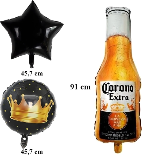 Štýlová sada fóliových balónikov s motívom Corona rozžiari každú párty. Obsahuje balónik v tvare fľaše piva, 2 balóniky s potlačou koruny a 2 čierne hviezdy. Ideálna na narodeniny, rozlúčku so slobodou aj firemný večierok. Jednoduché nafukovanie héliom alebo vzduchom a okamžitý efekt bez zložitej prípravy.