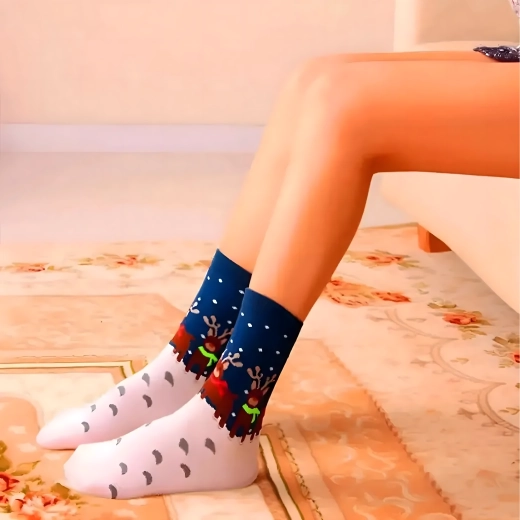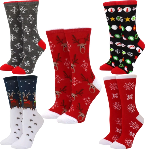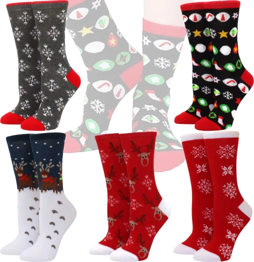 Štýlová sada 5 párov vianočných bavlnených ponožiek pre pohodlie a radosť v zimných dňoch. Z vysokokvalitnej bavlny – mäkké, priedušné a príjemné na dotyk. Veselé motívy ako sobíky, stromčeky a snehové vločky navodia sviatočnú atmosféru. Skvelý darček na Vianoce aj Mikuláša.