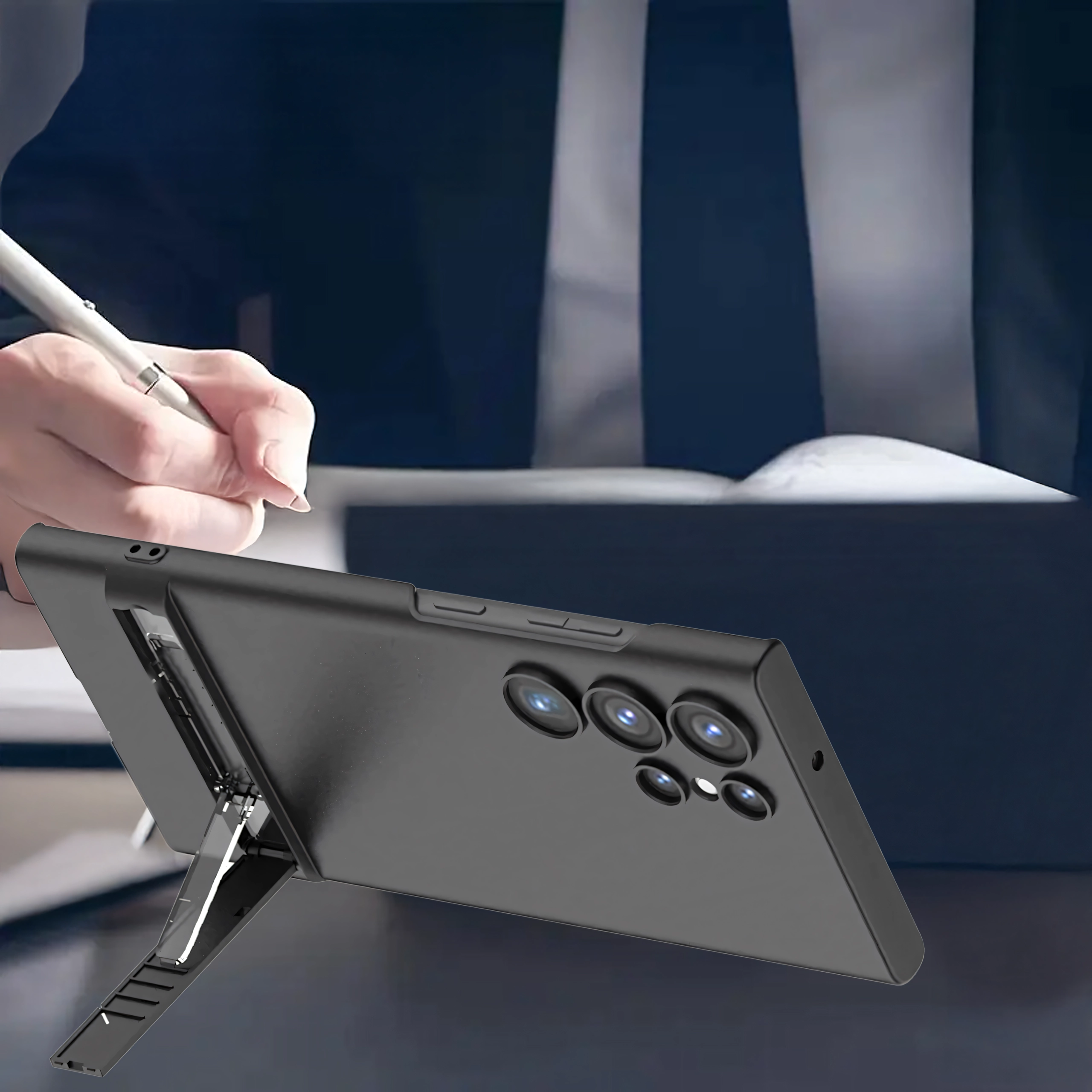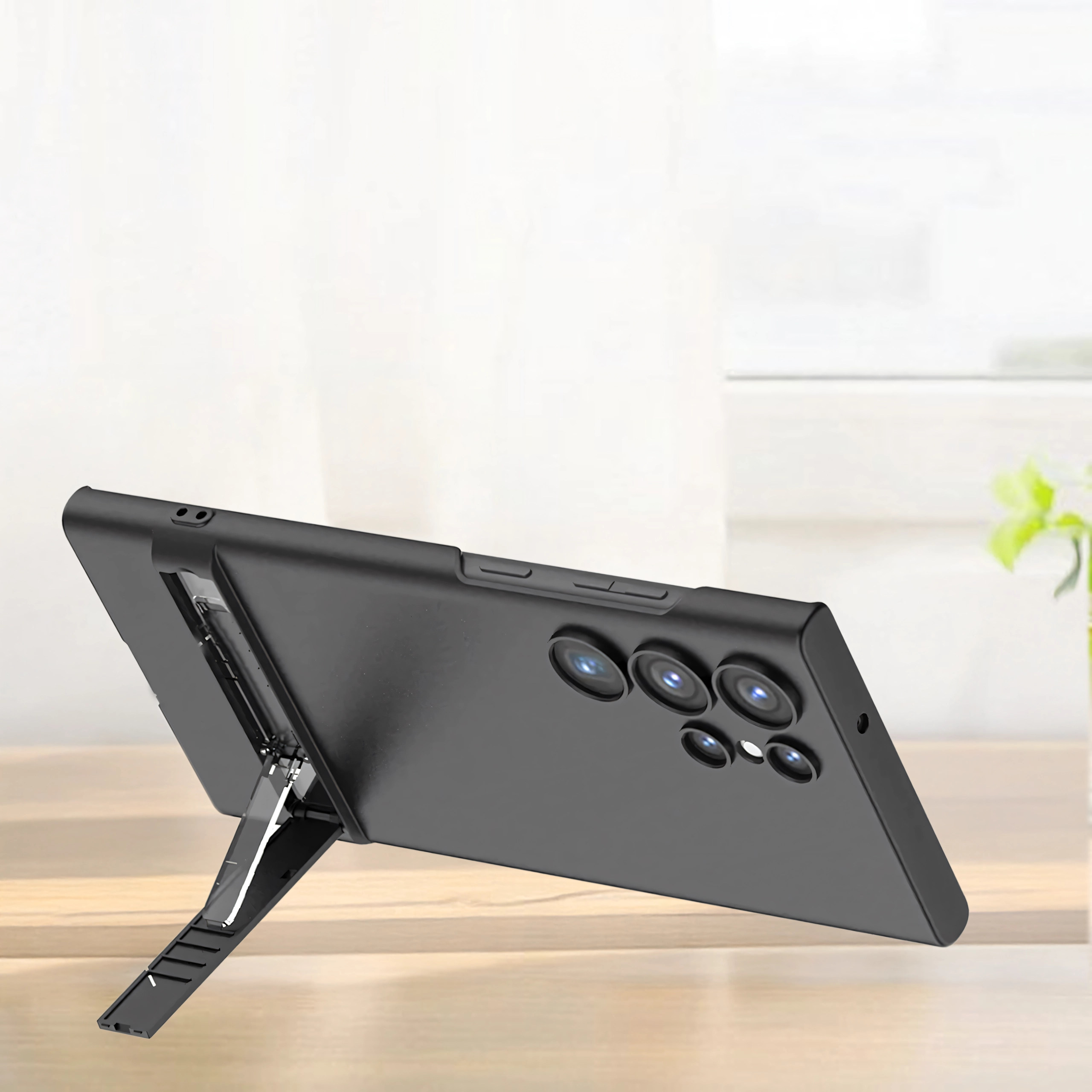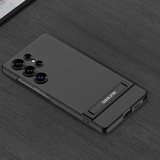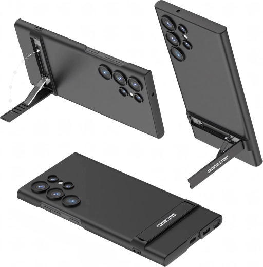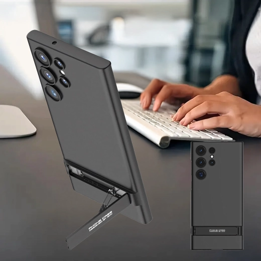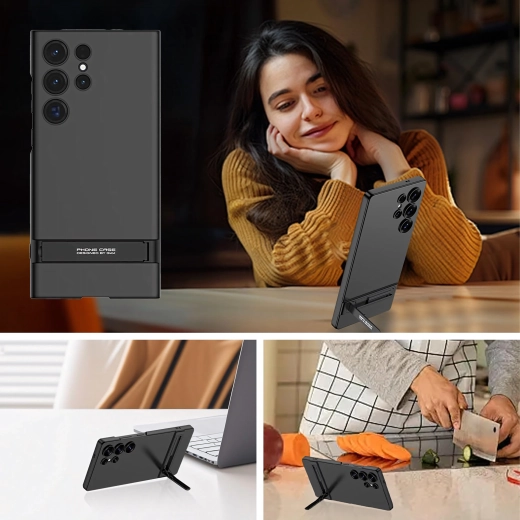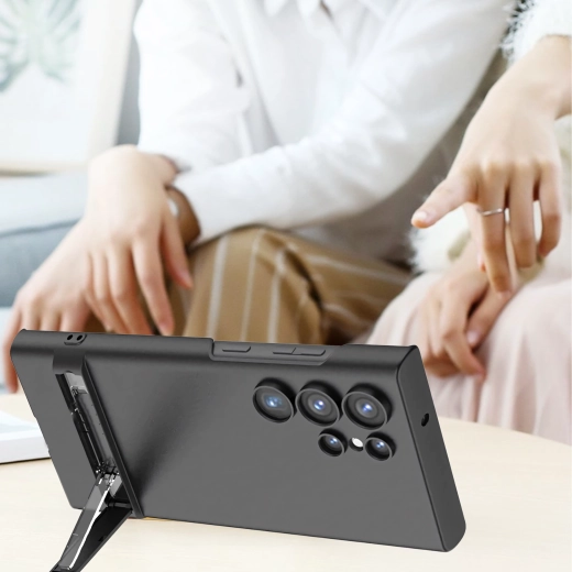 Štýlové a odolné puzdro pre Samsung Galaxy S24 Ultra v elegantnej čiernej farbe. Ponúka štíhly profil, spoľahlivú ochranu proti poškriabaniu a pádom a praktický integrovaný stojan na pohodlné sledovanie videí a videohovory.