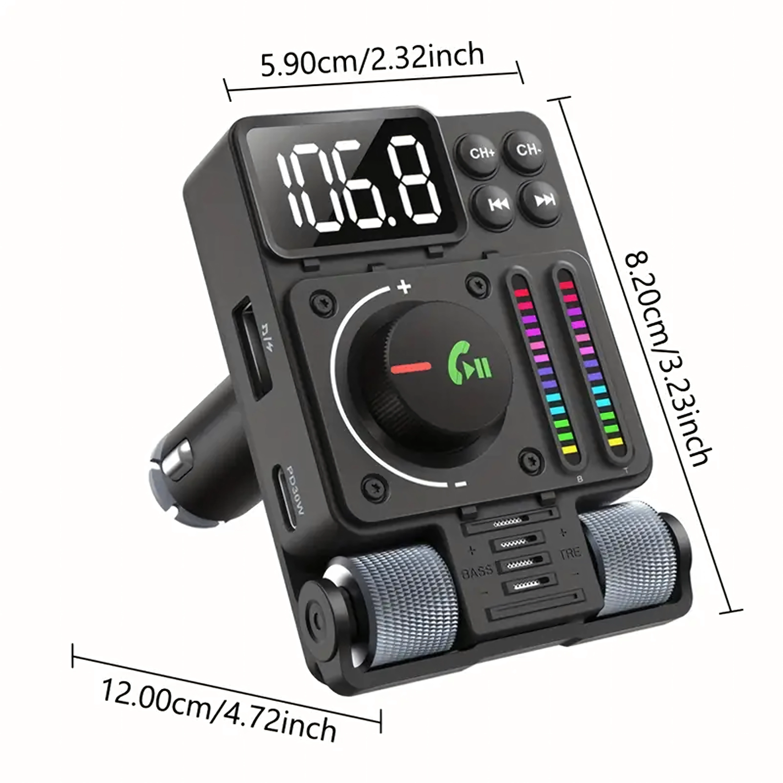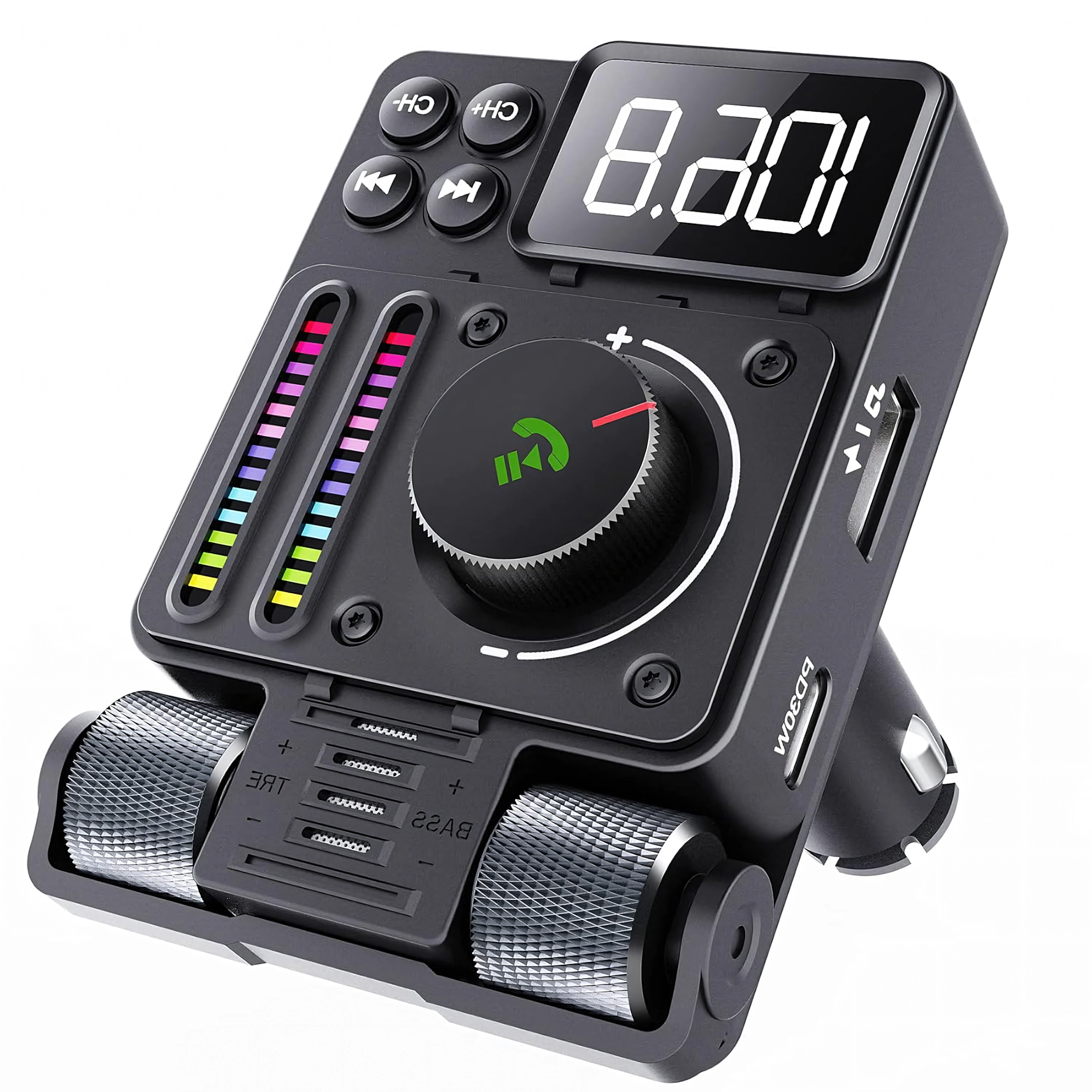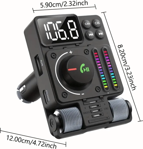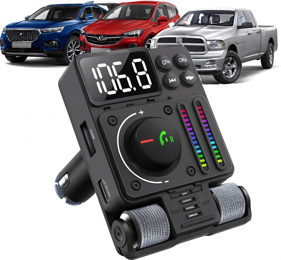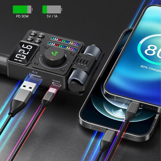 Multifunkčný Bluetooth 5.3 FM transmitter do auta s rýchlym nabíjaním PD 30 W ponúka streamovanie hudby, čisté handsfree hovory a farebné LED podsvietenie. Ideálny pre pohodlné a moderné používanie výbavy vo vašom aute.