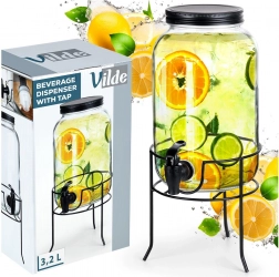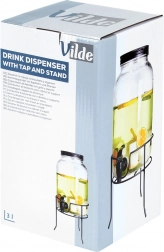 Štýlový sklenený dávkovač s objemom 3,2 l so skrutkovacím viečkom, kohútikom a pevným kovovým stojanom pre pohodlné nalievanie. Ideálny na limonády, punče, ľadové čaje aj vodu s ovocím. Číre sklo krásne zvýrazní obsah, stabilný stojan s nožičkami zaistí komfortné použitie doma, na záhrade aj pri oslavách.