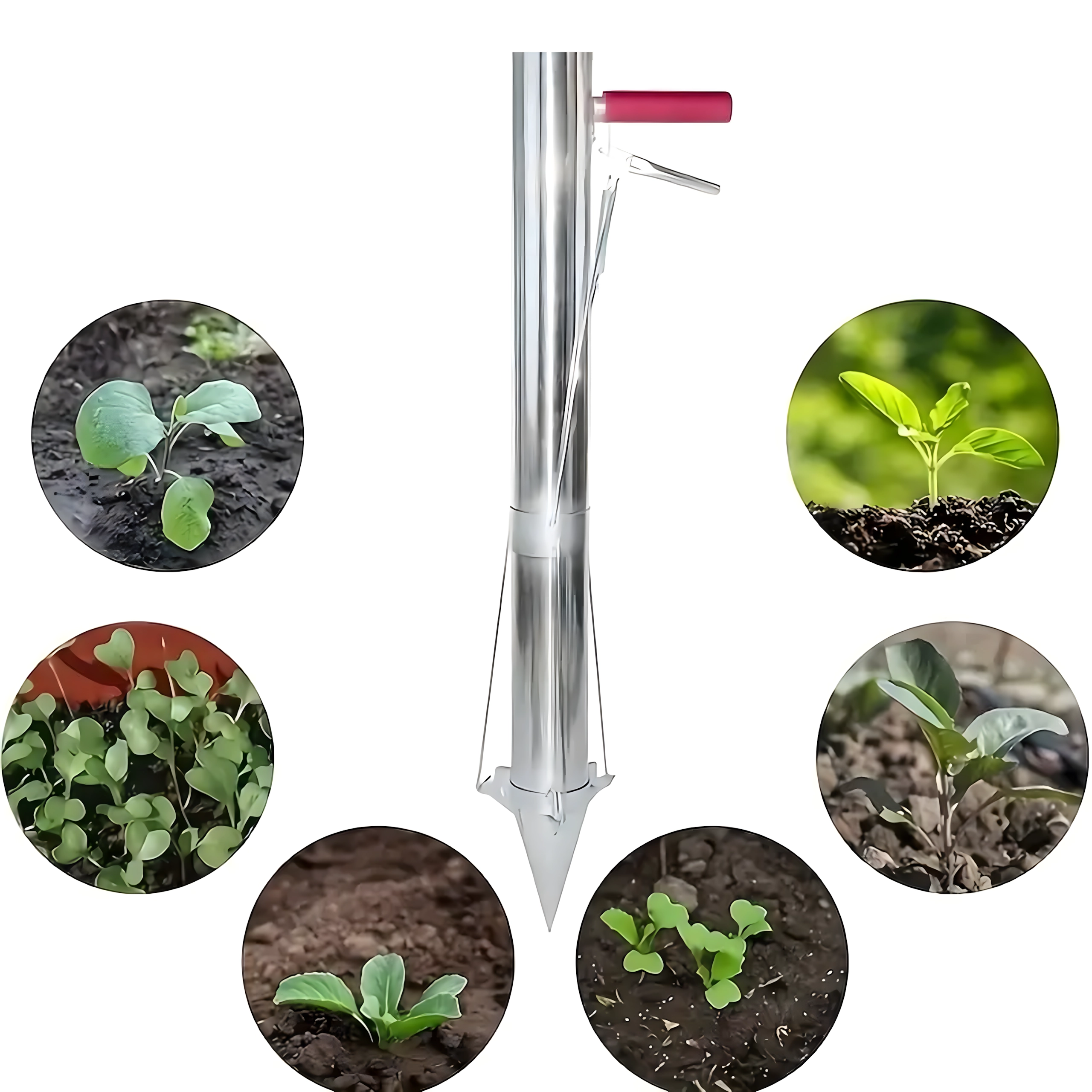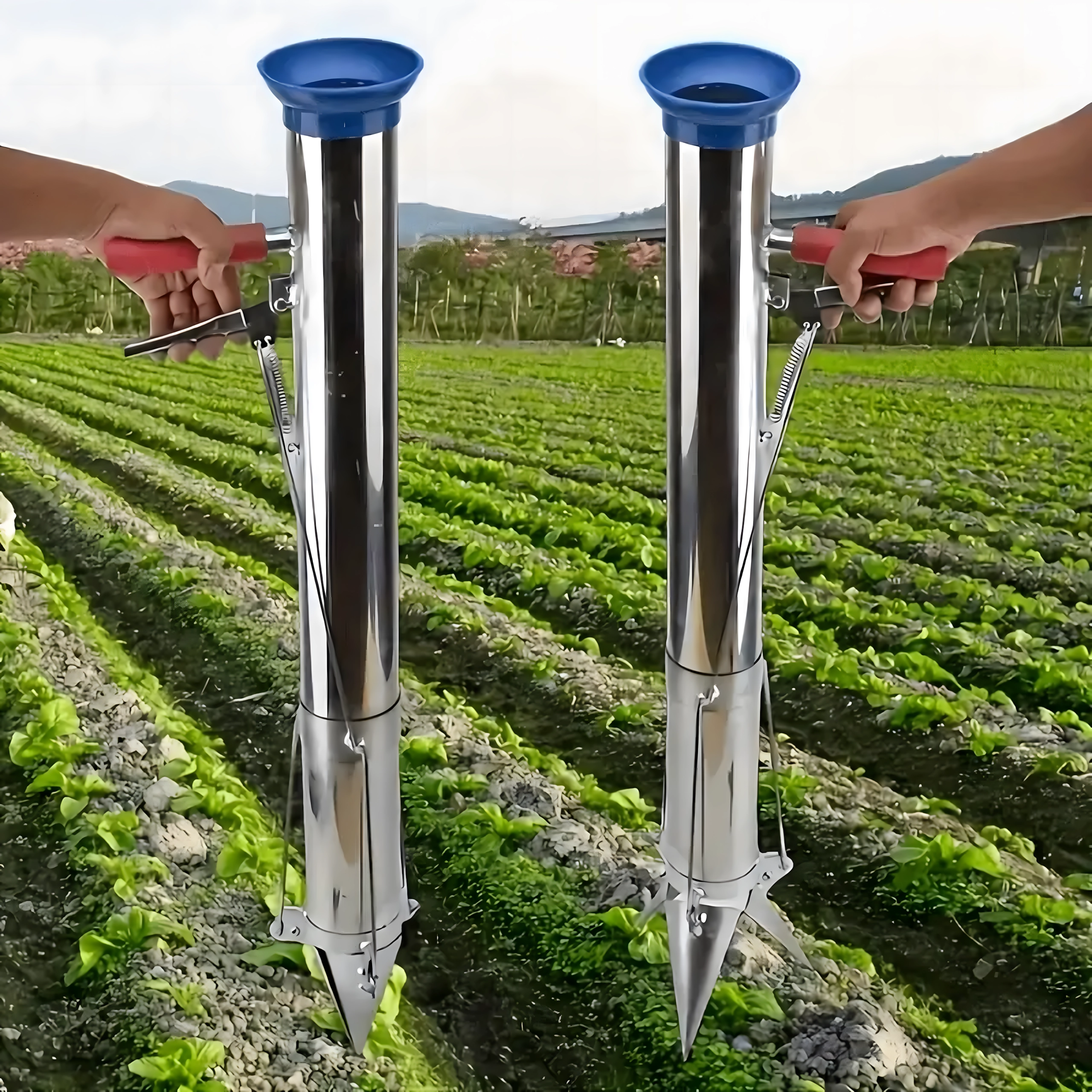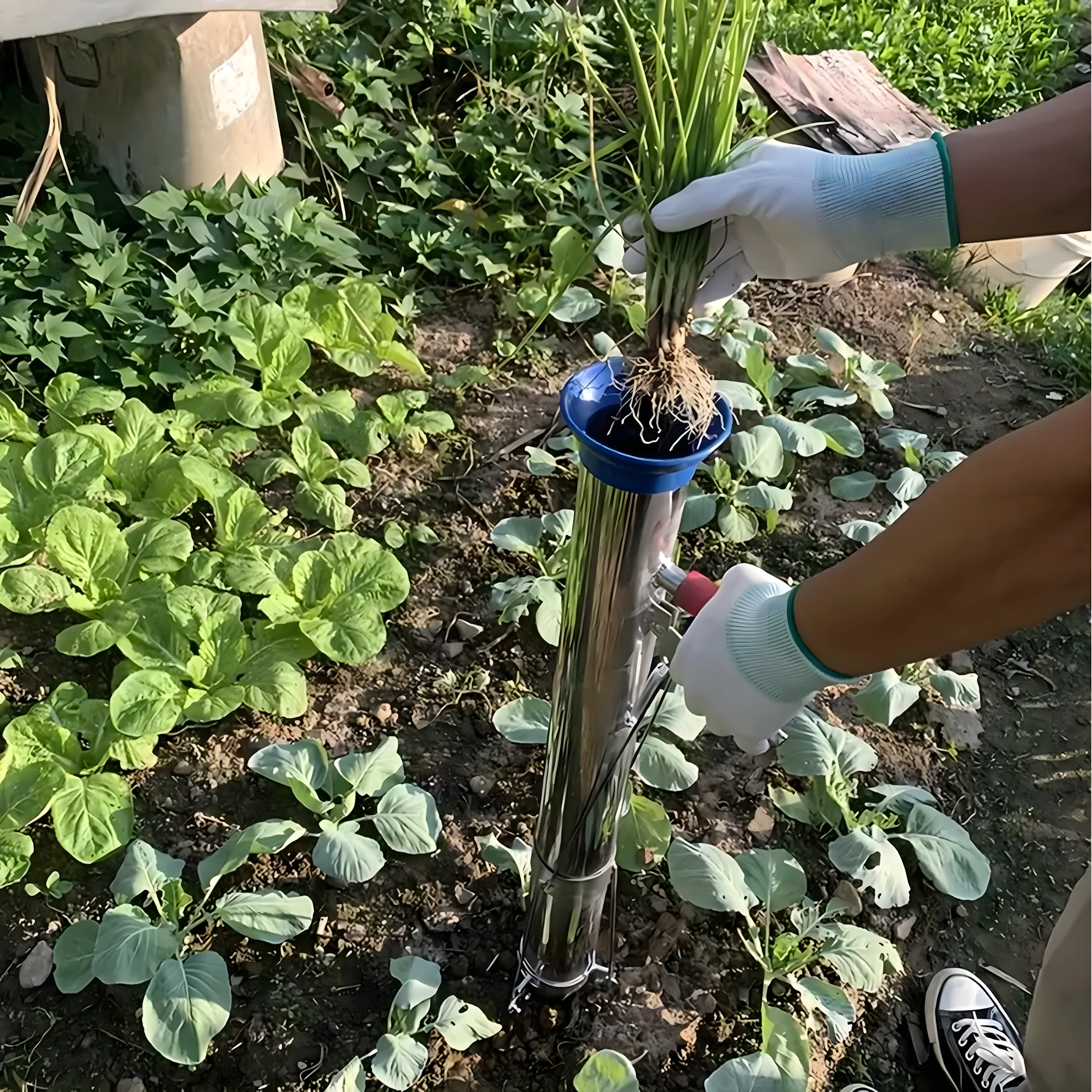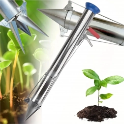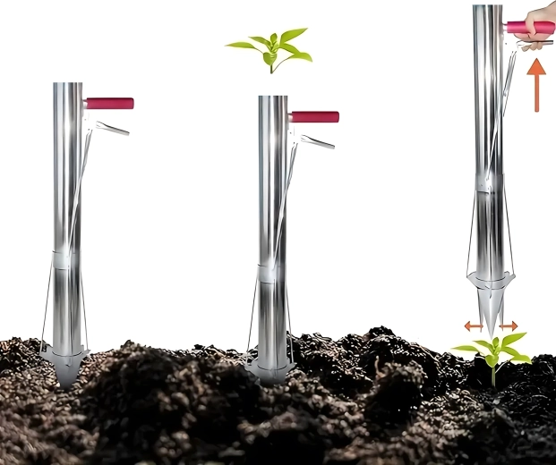 Kužeľovitá špička a valcovité telo vytvoria čistý otvor jediným stlačením, sadenicu vložíte a pákou pôdu jednoducho uvoľníte späť.