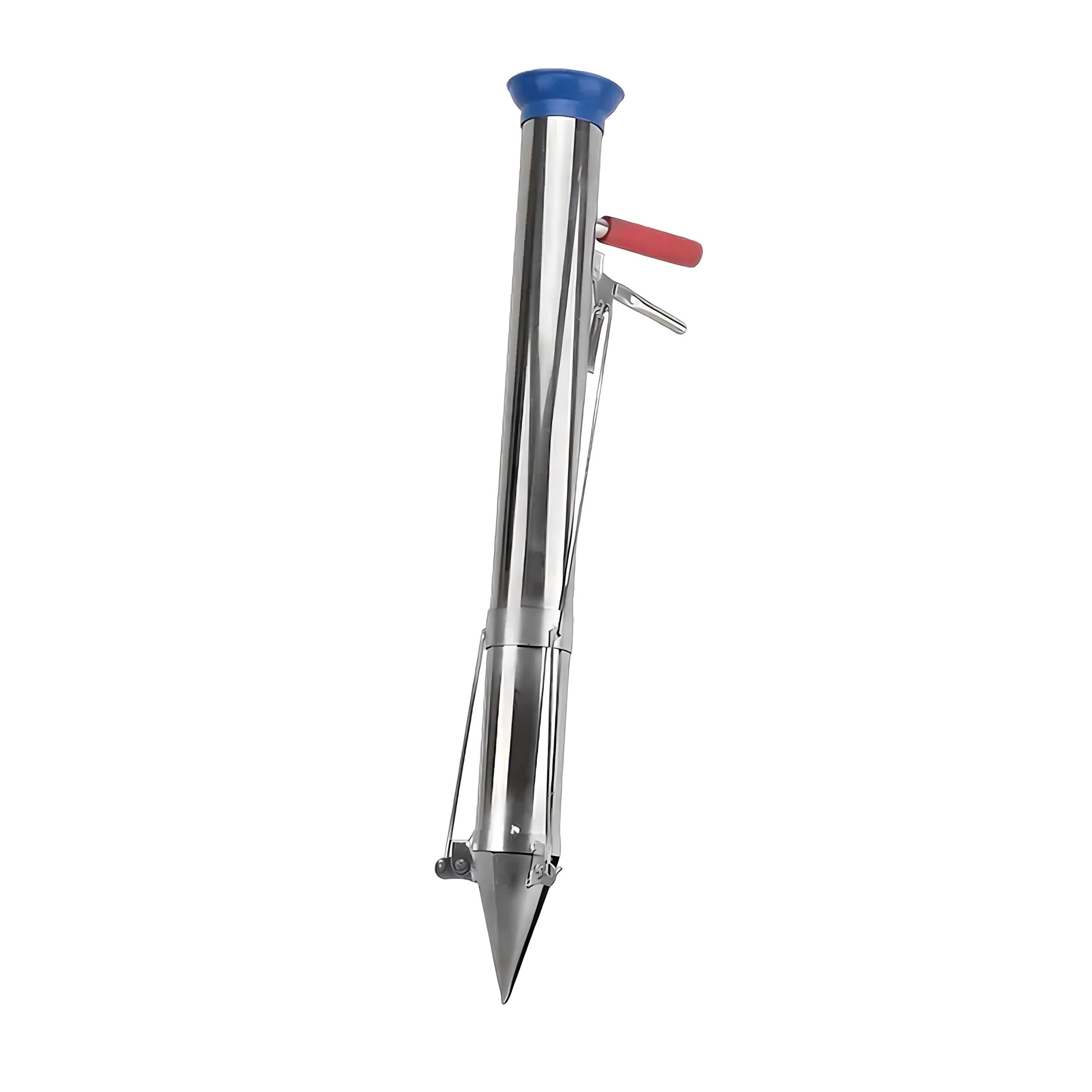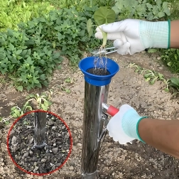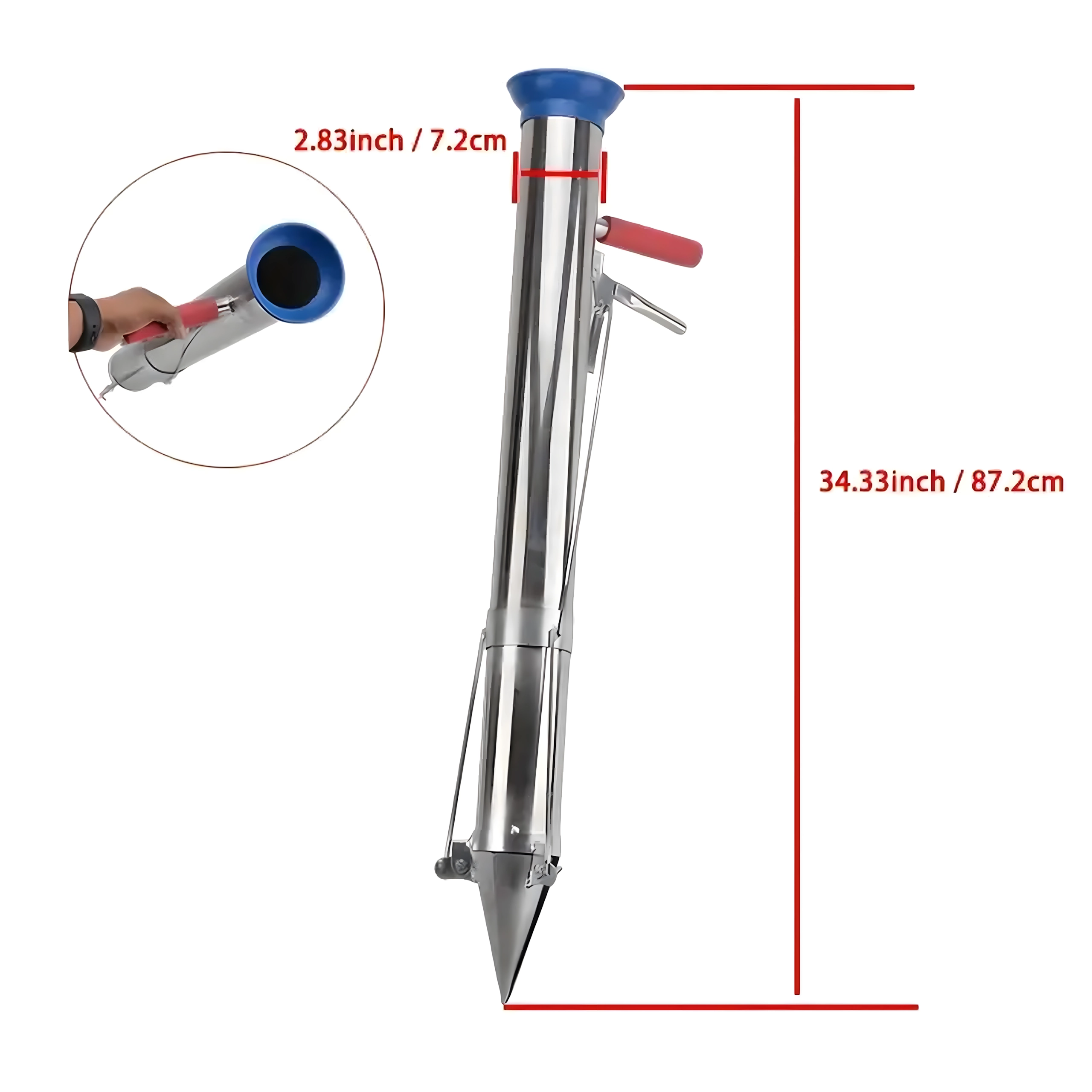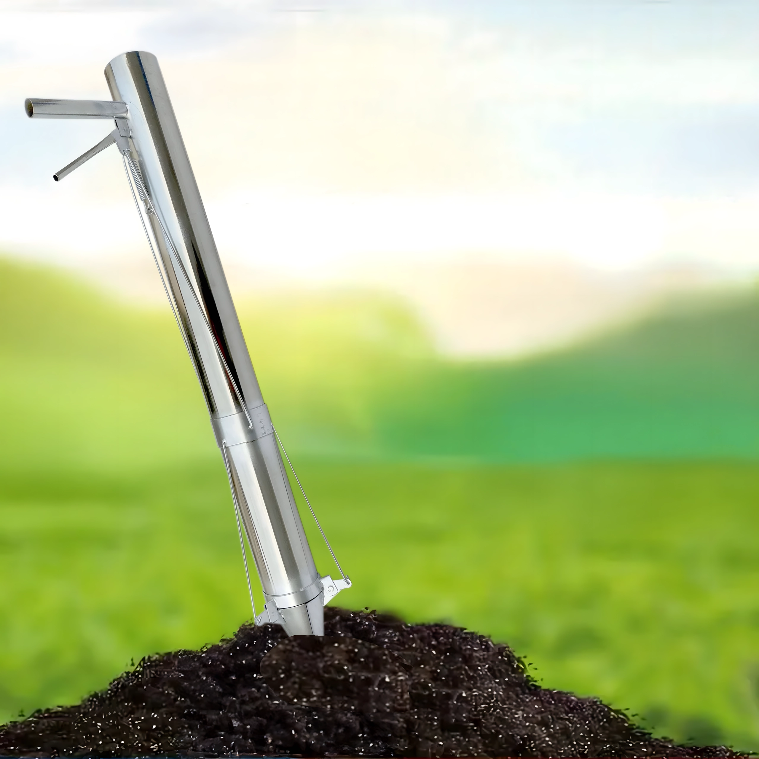 Kužeľovitá špička a valcovité telo vytvoria čistý otvor jediným stlačením, sadenicu vložíte a pákou pôdu jednoducho uvoľníte späť.
