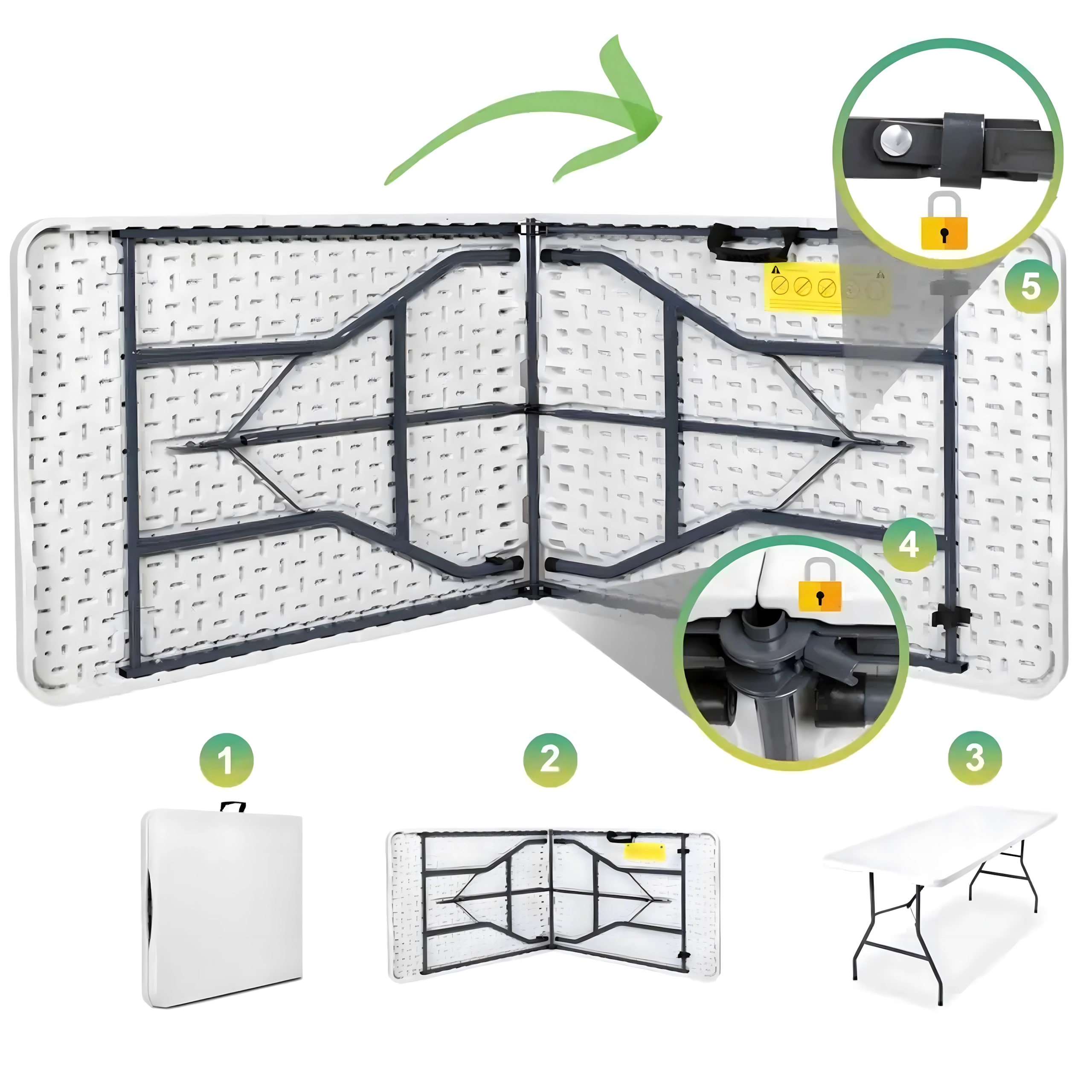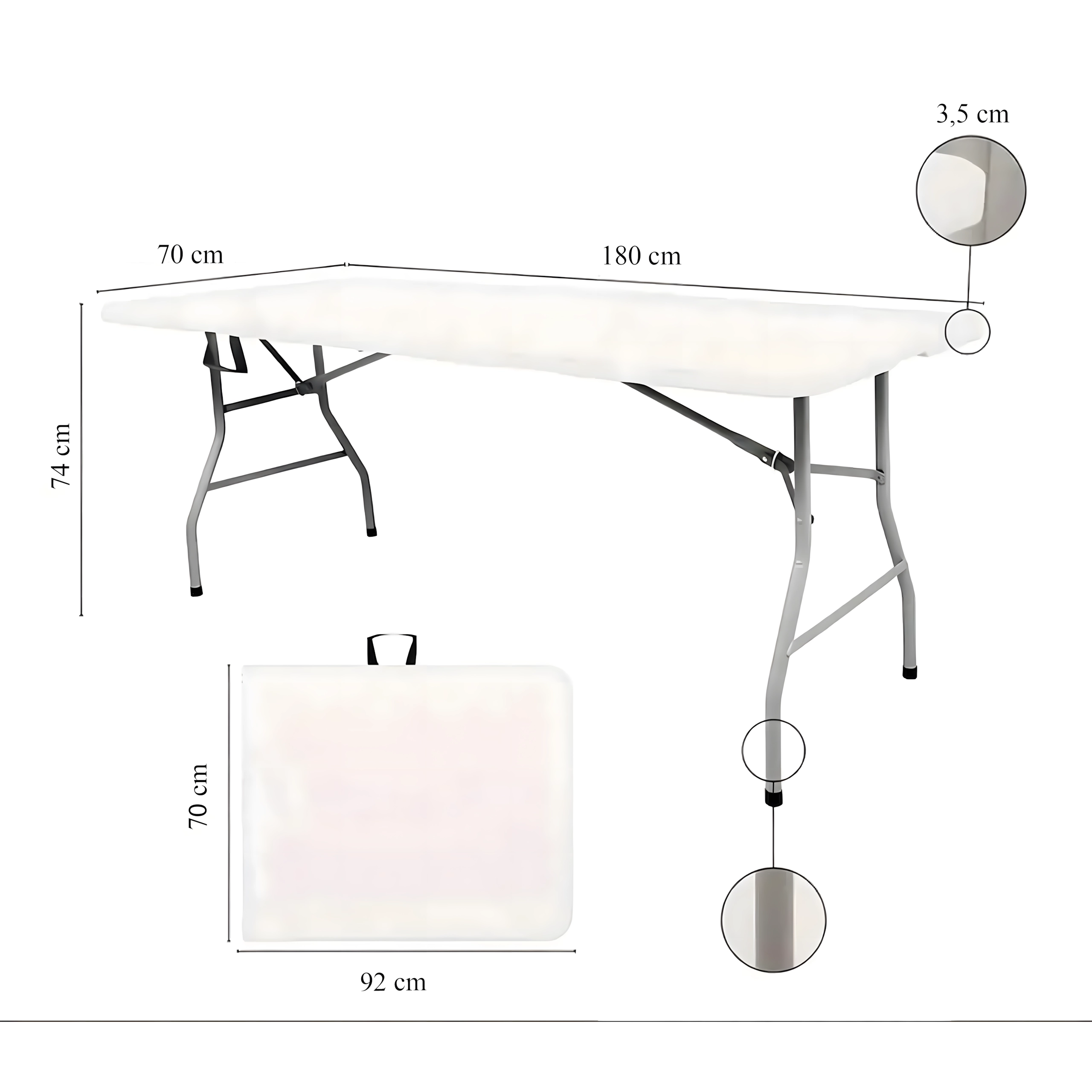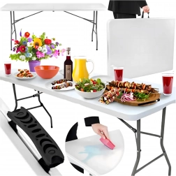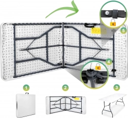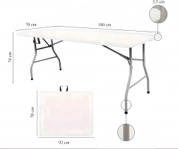 Praktický a prenosný skladací stôl s rozmermi 180 × 70 × 74 cm je ideálny na záhradné párty, catering aj kempovanie. Má odolnú plastovú dosku na jednoduché čistenie, stabilné oceľové nohy so zámkom proti samovoľnému zloženiu a po zložení sa zmení na kufrík s rukoväťou pre pohodlné prenášanie.