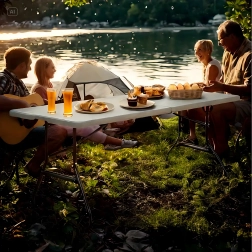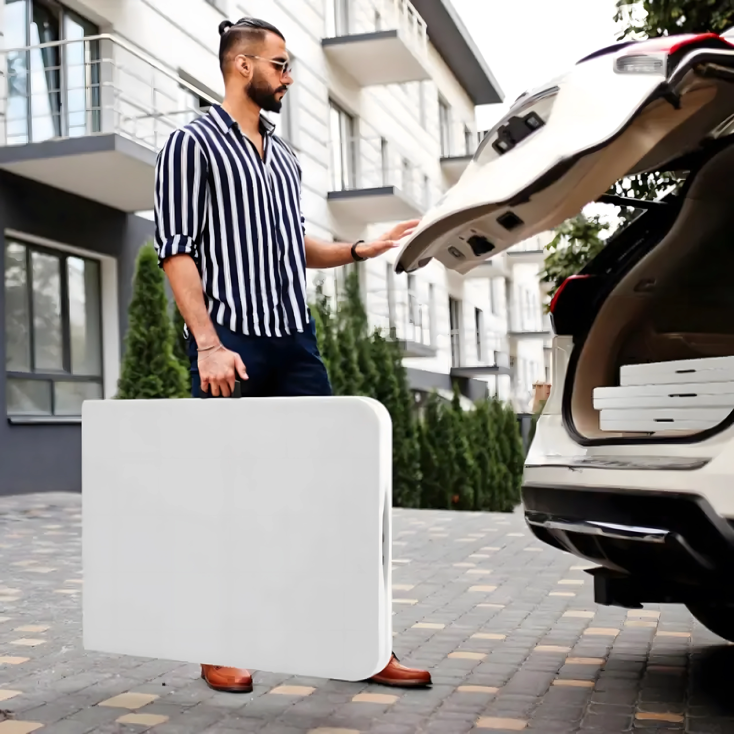 Stôl sa preloží napoly do kompaktného tvaru a vďaka integrovanej rukoväti ho ľahko prenesiete v jednej ruke.