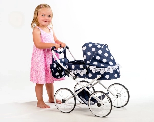 Štýlový kočík pre bábiky v retro dizajne poteší každú malú mamičku. Ponúka čierne prevedenie s bodkami a elegantnou čipkou, nastaviteľnú rukoväť 55 cm pre pohodlné vedenie a sklopnú striešku pre jednoduchú manipuláciu. Súčasťou je taška cez rukoväť a praktický spodný košík na drobnosti.