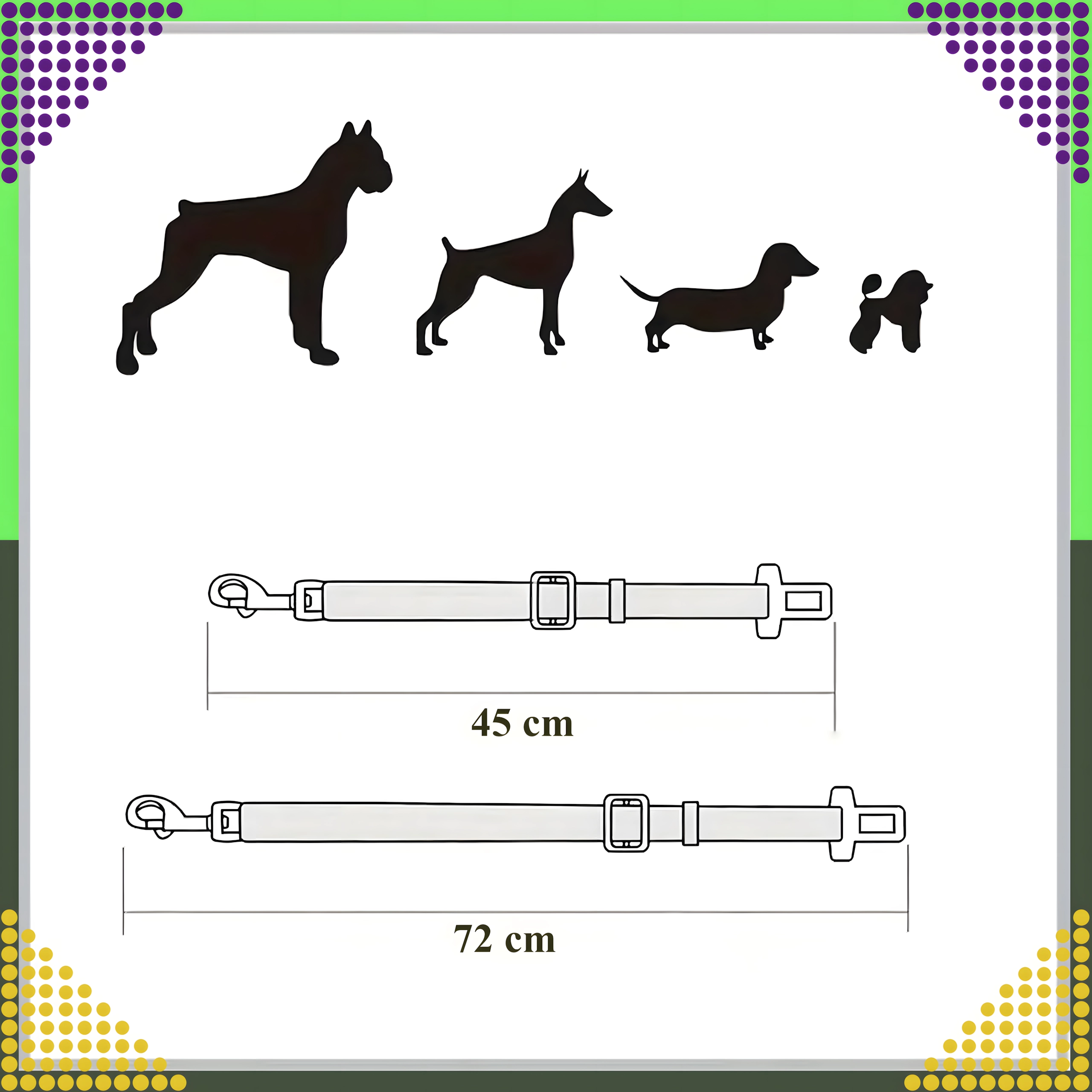 Praktický pás na zaistenie psa či mačky počas jazdy autom. Jednoducho ho zasuniete do štandardnej zásuvky bezpečnostného pásu a druhý koniec otočnou karabínou pripnete k postroju (odporúčané namiesto obojka). Nastaviteľná dĺžka 45–72 cm umožňuje zvieraťu sedieť alebo ležať, no zároveň bráni nebezpečnému pohybu po vozidle.