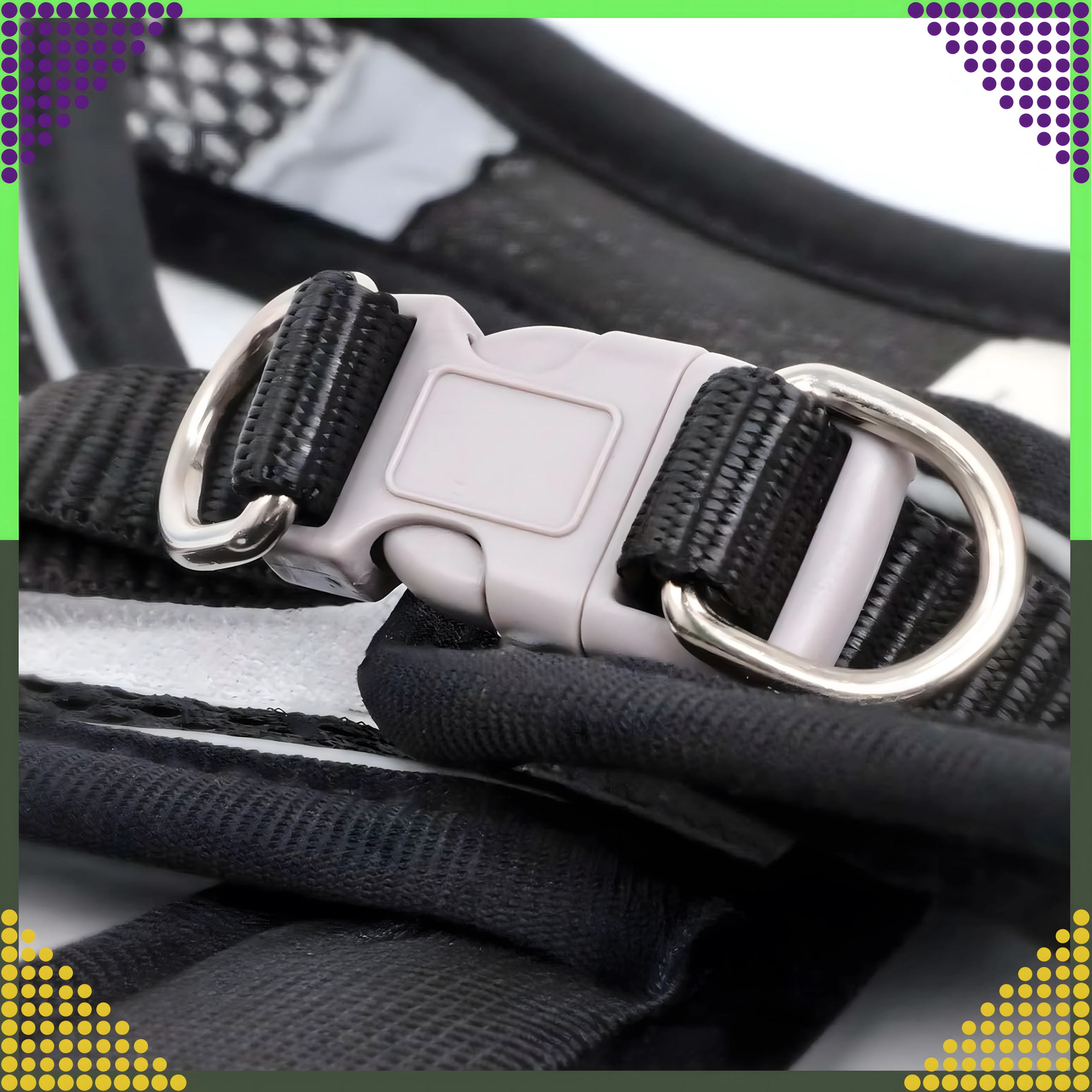 Dvojité kovové D-krúžky a nastaviteľné popruhy so sponami držia postroj pevne na mieste a uľahčujú prispôsobenie veľkosti.