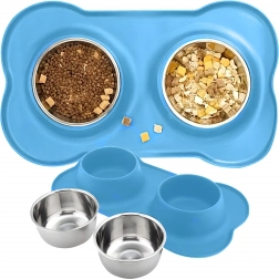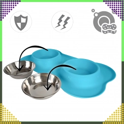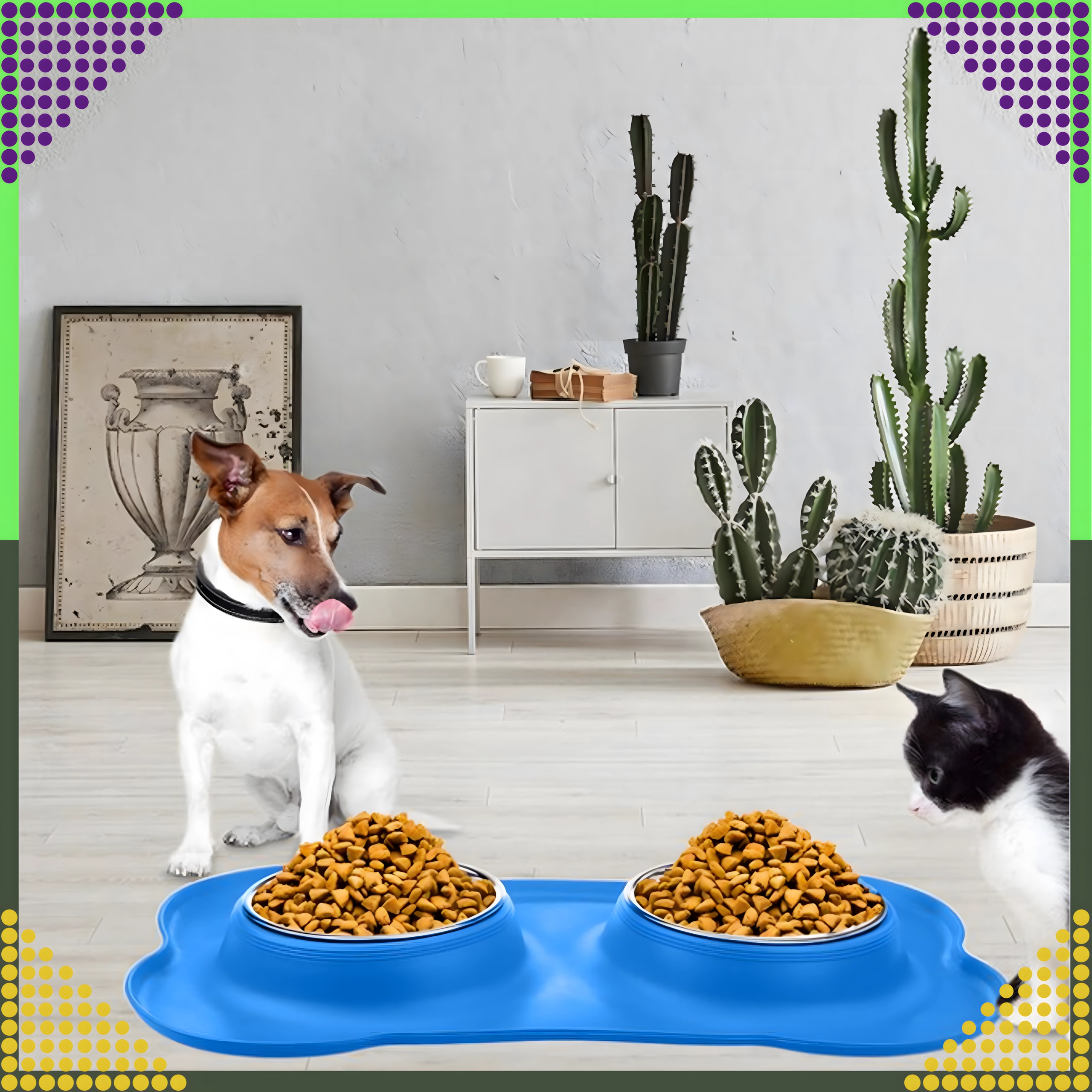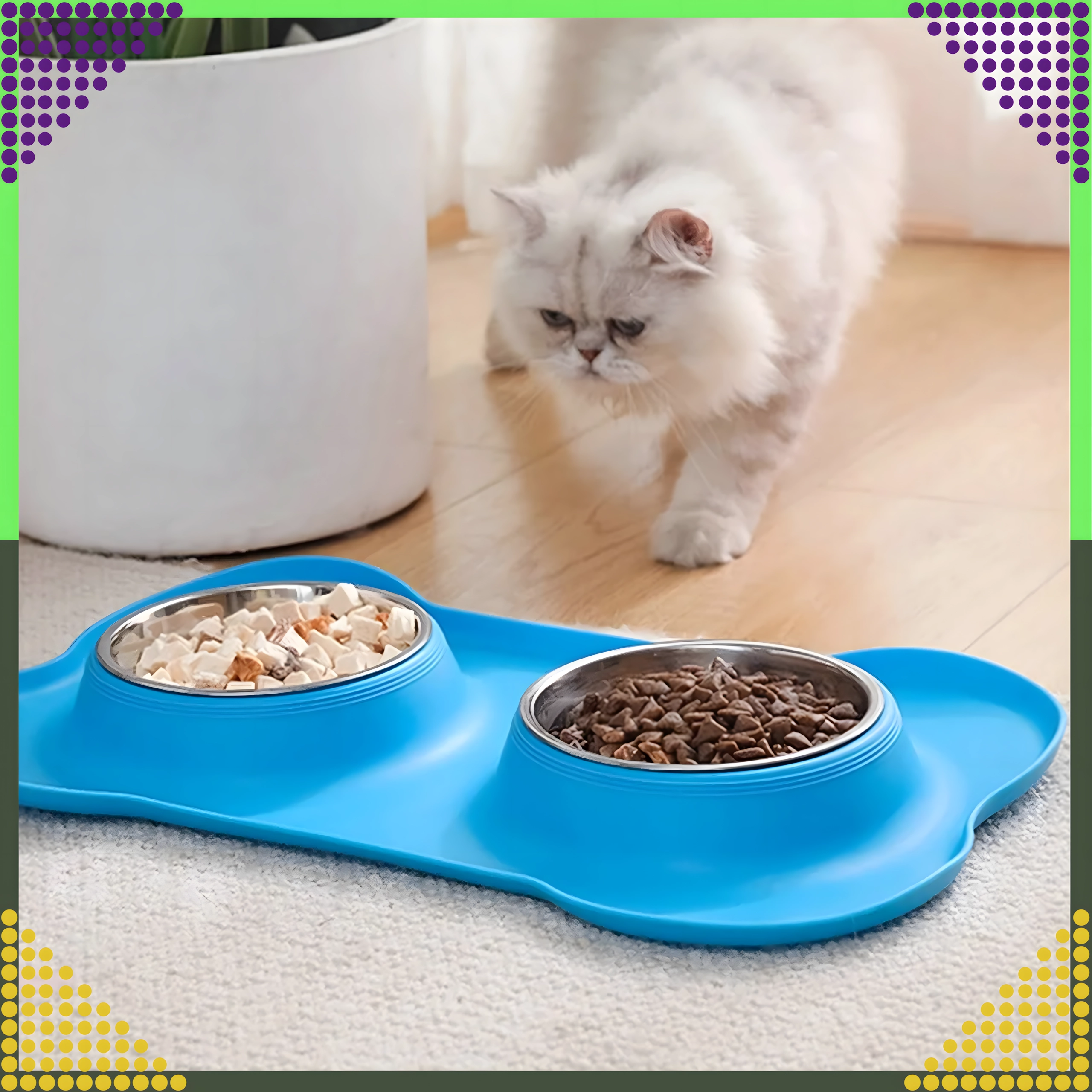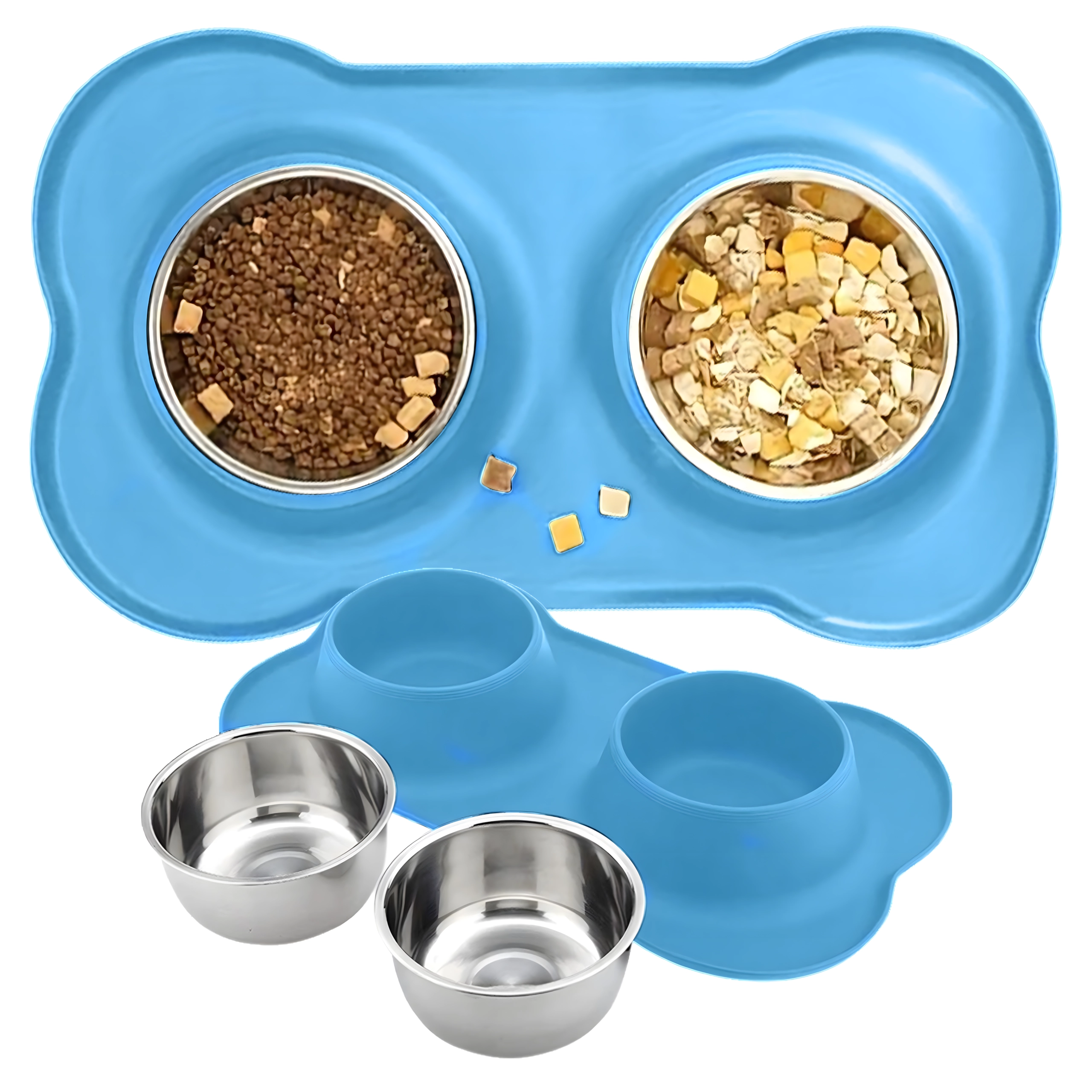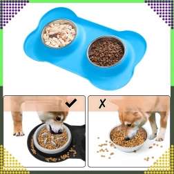 Praktická dvojitá miska pre psov aj mačky kombinuje dve nerezové misky 2 × 450 ml a protišmykovú silikónovú podložku v tvare kosti. Ideálna na krmivo aj vodu, s jednoduchým čistením a obmedzením neporiadku okolo kŕmenia.