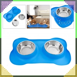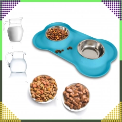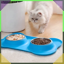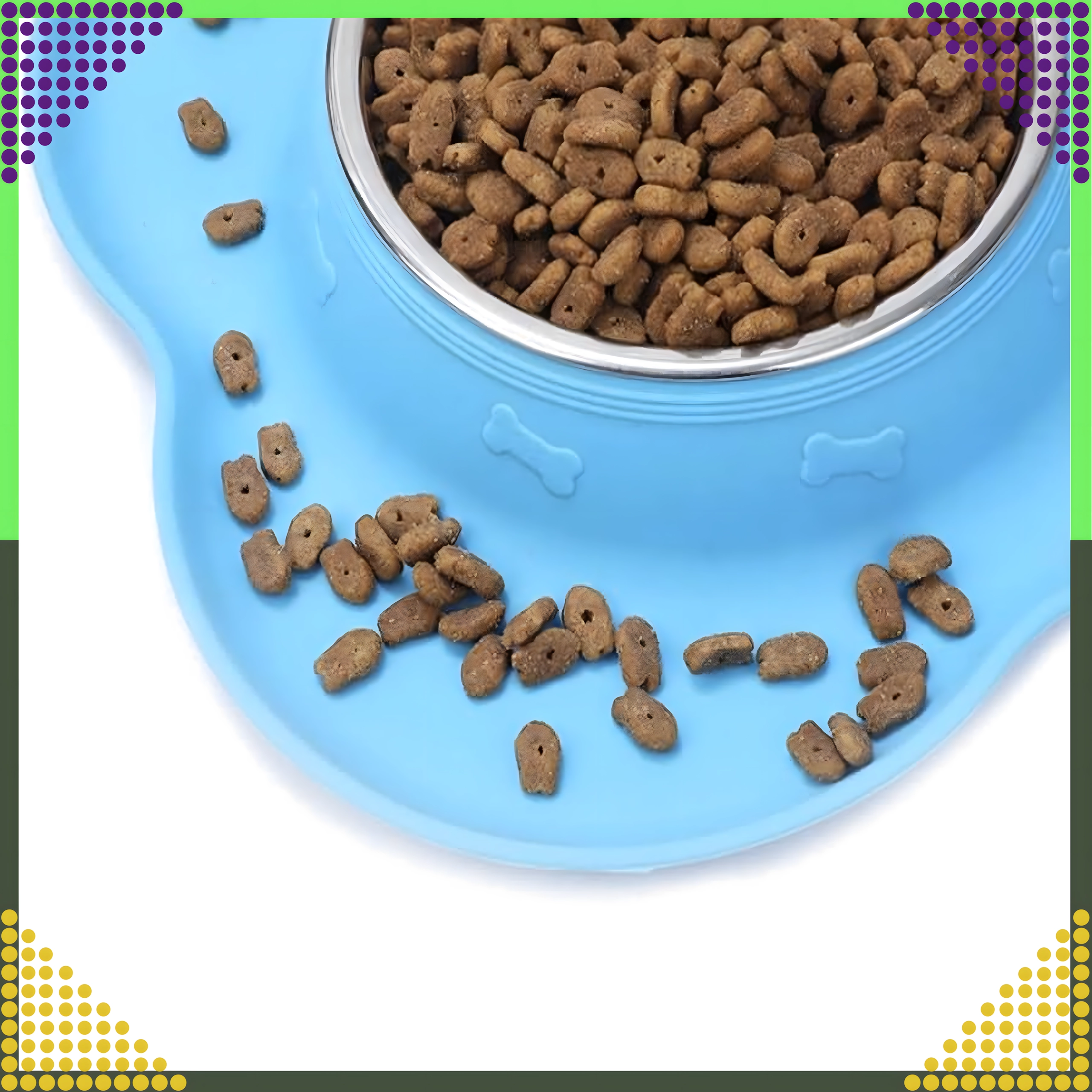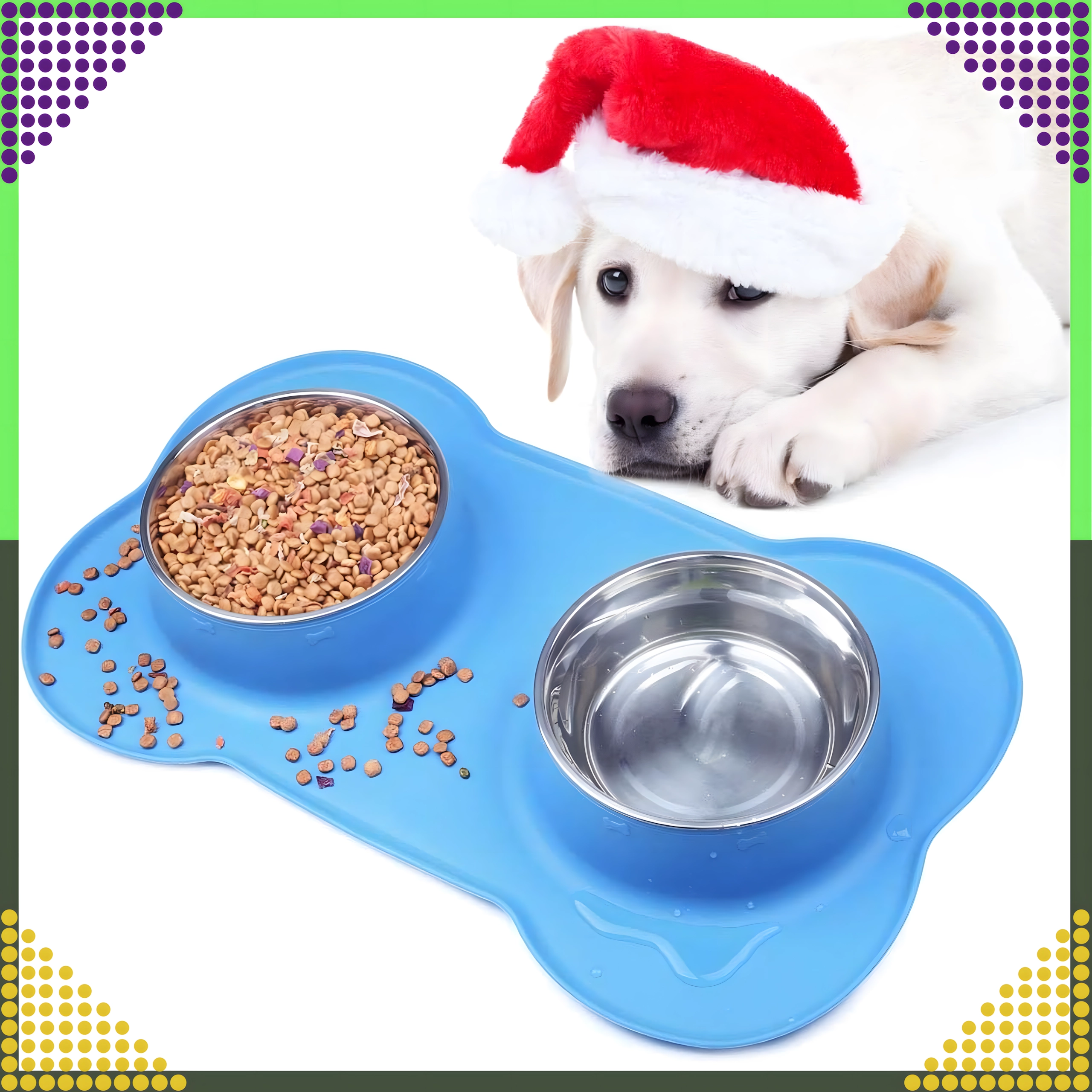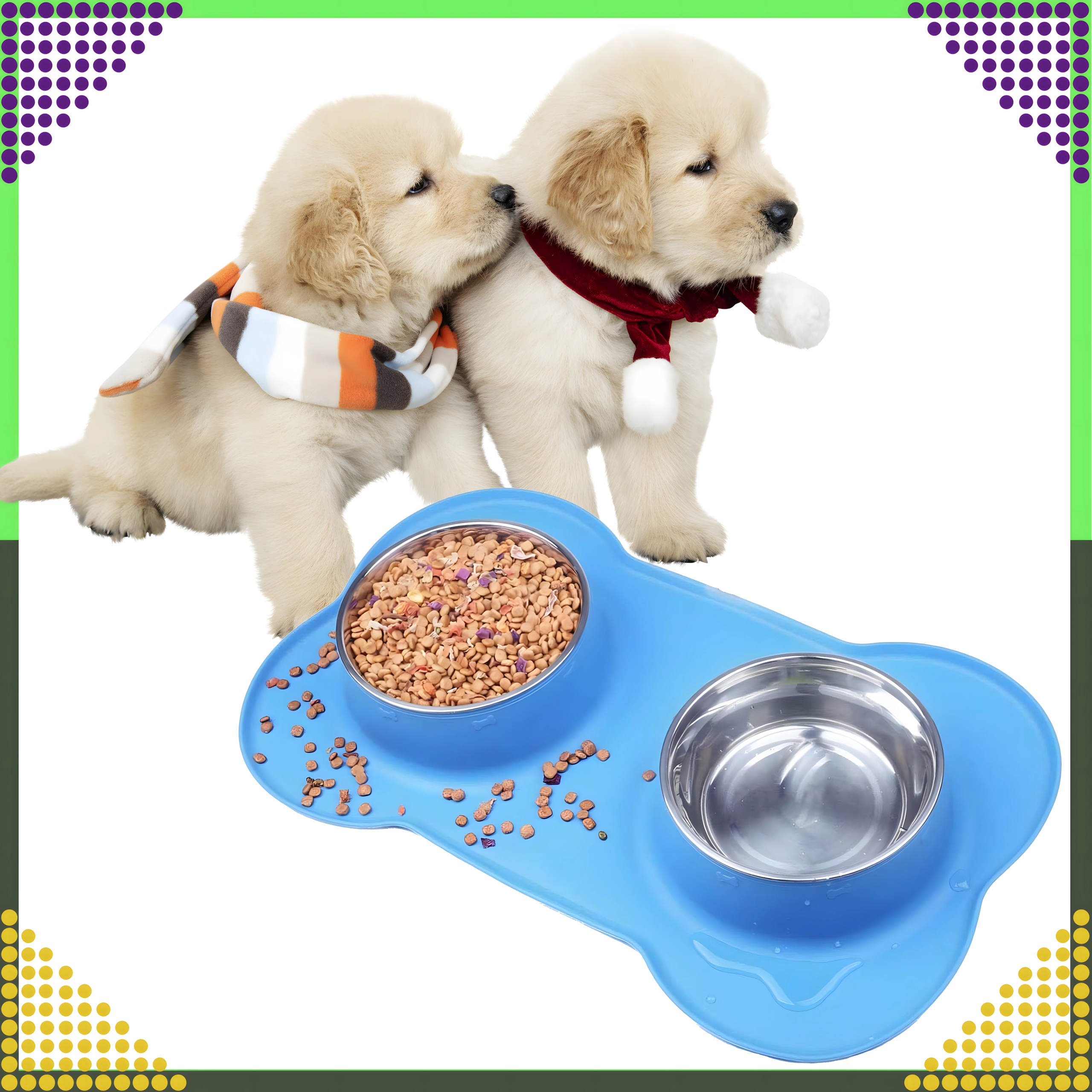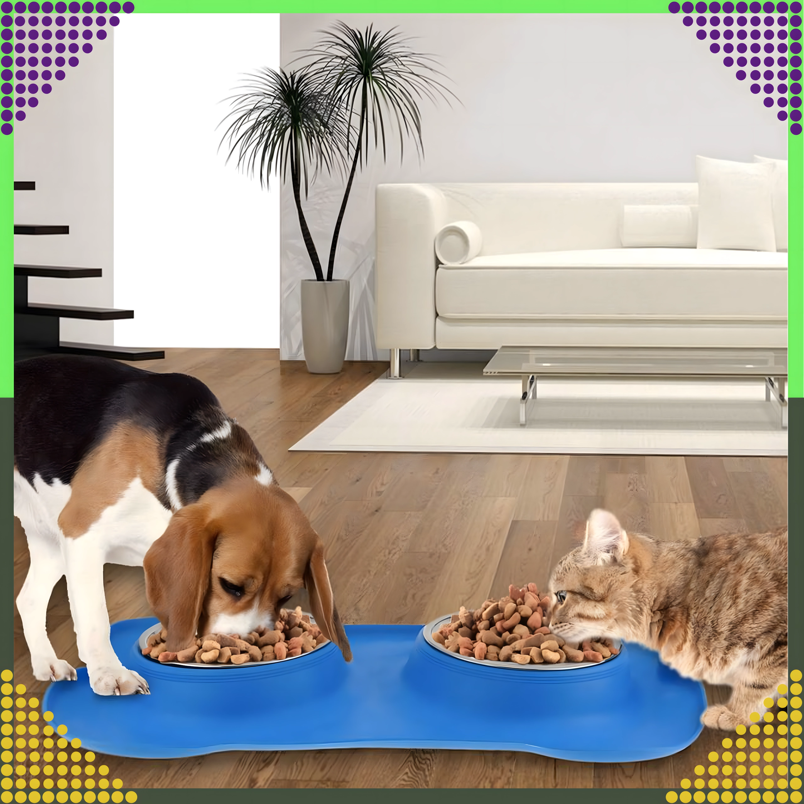Praktická dvojitá miska pre psov aj mačky kombinuje dve nerezové misky 2 × 450 ml a protišmykovú silikónovú podložku v tvare kosti. Ideálna na krmivo aj vodu, s jednoduchým čistením a obmedzením neporiadku okolo kŕmenia.