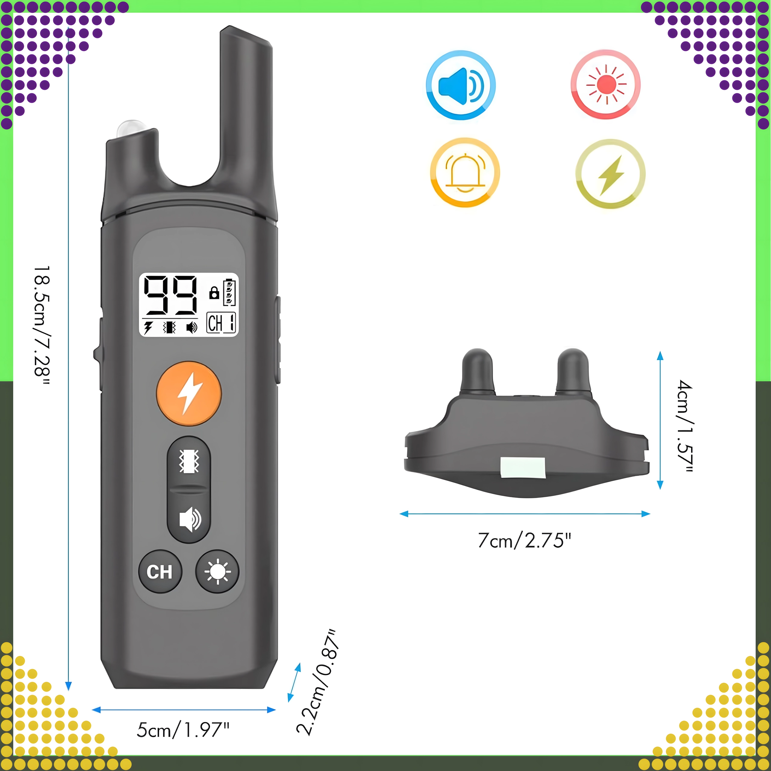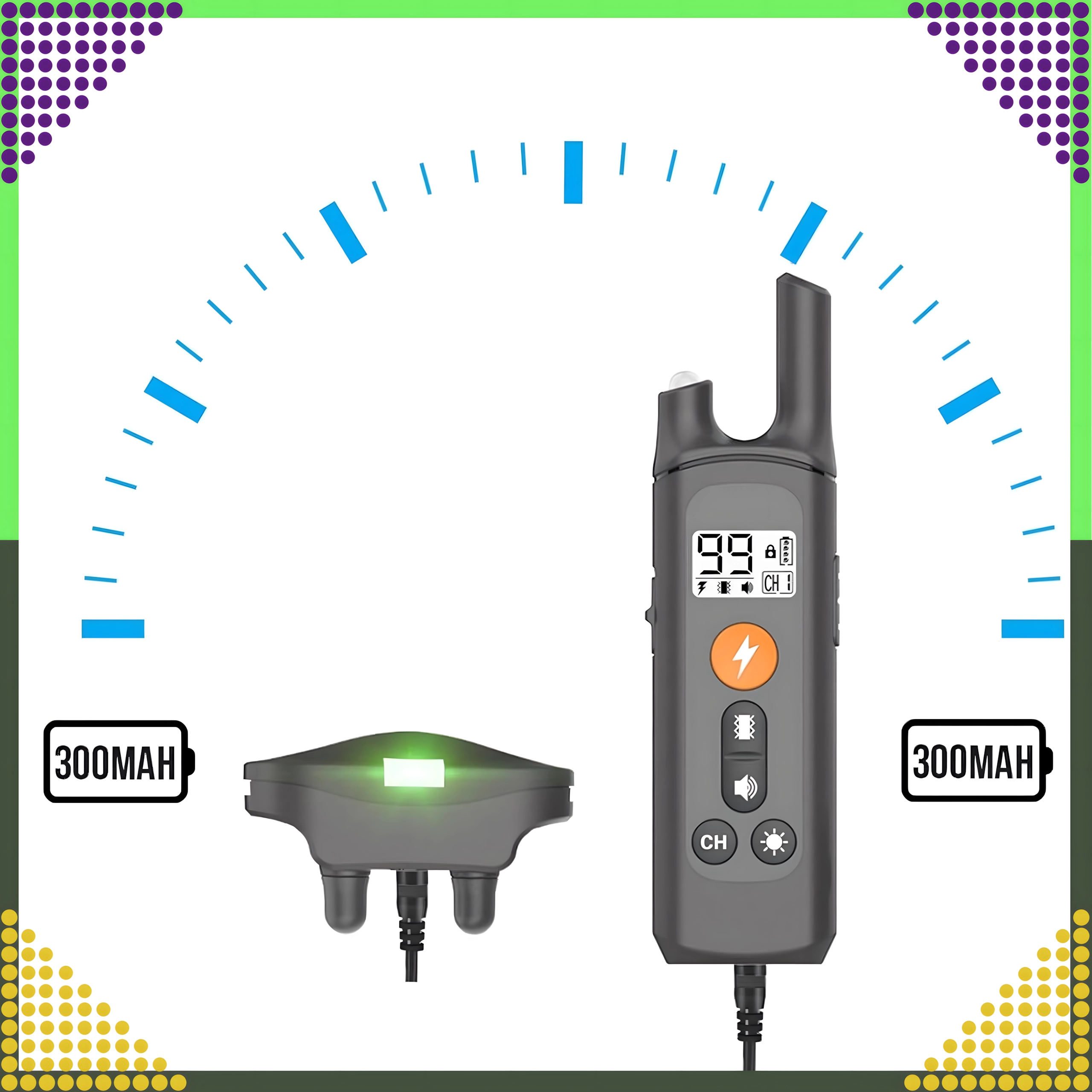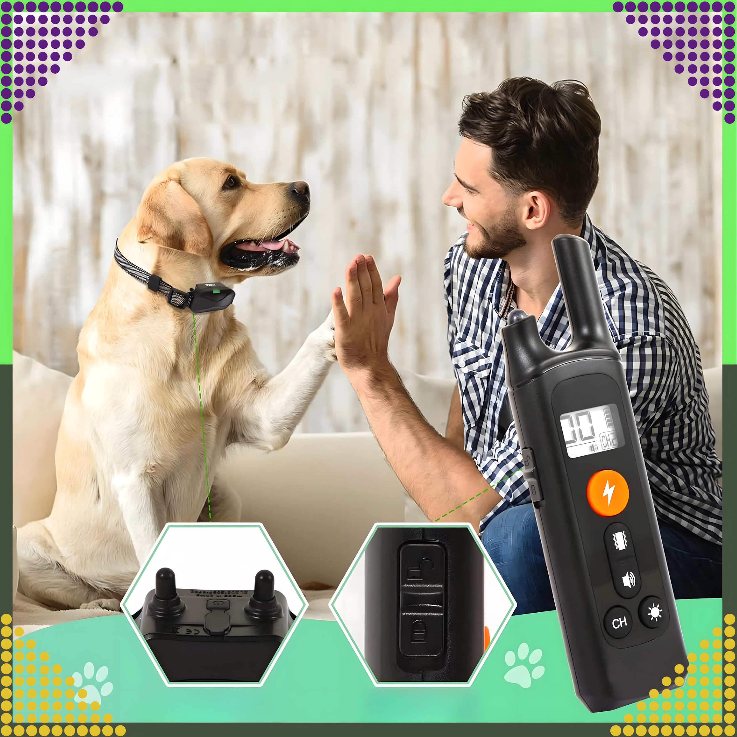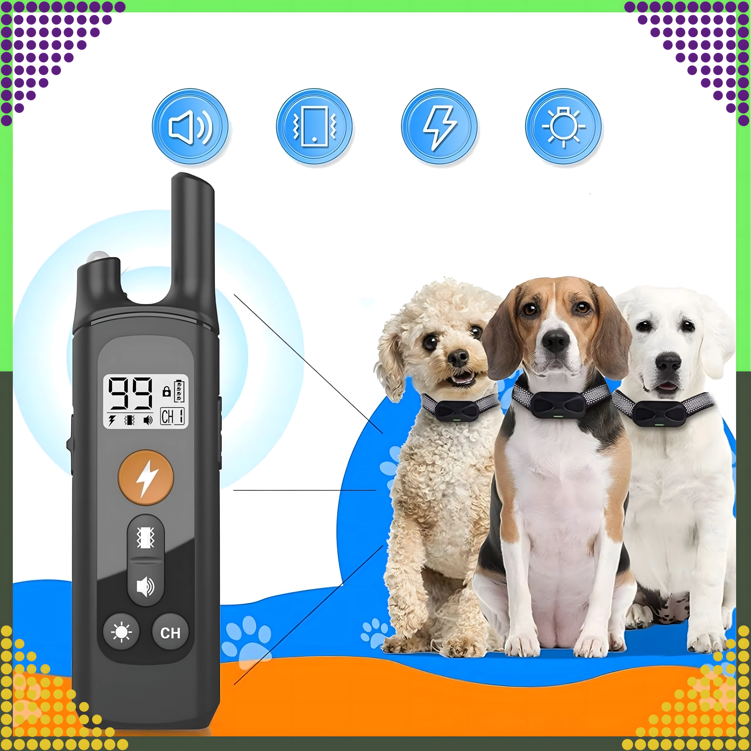 Štyri režimy – impulz, vibrácie, svetlo a zvuk – pomáhajú jemne korigovať neželané správanie, obmedziť štekanie či utiekanie a posilniť každodennú poslušnosť. Regulovateľný popruh (až cca 70 cm) sadne väčšine plemien.
