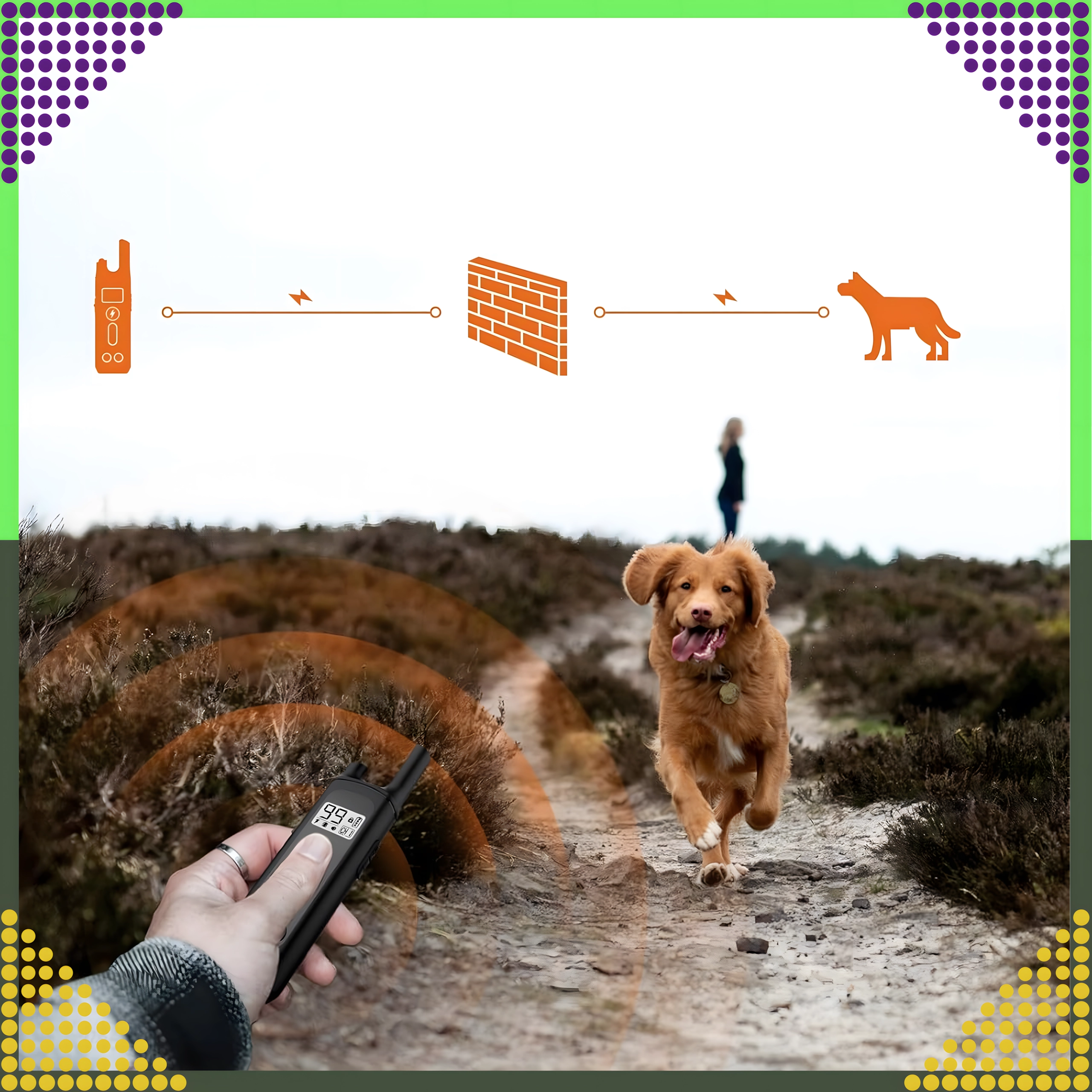 Učte psa povely ako „sadni“, „zostaň“ alebo „ku mne“ na dlhú vzdialenosť vďaka stabilnému dosahu až 800 m. Prehľadné ovládanie, voľba intenzity a vstavaná baterka zabezpečujú pohodlný a bezpečný tréning cez deň aj za šera. Obojok je vodoodolný a má úsporný režim pre dlhšiu výdrž.