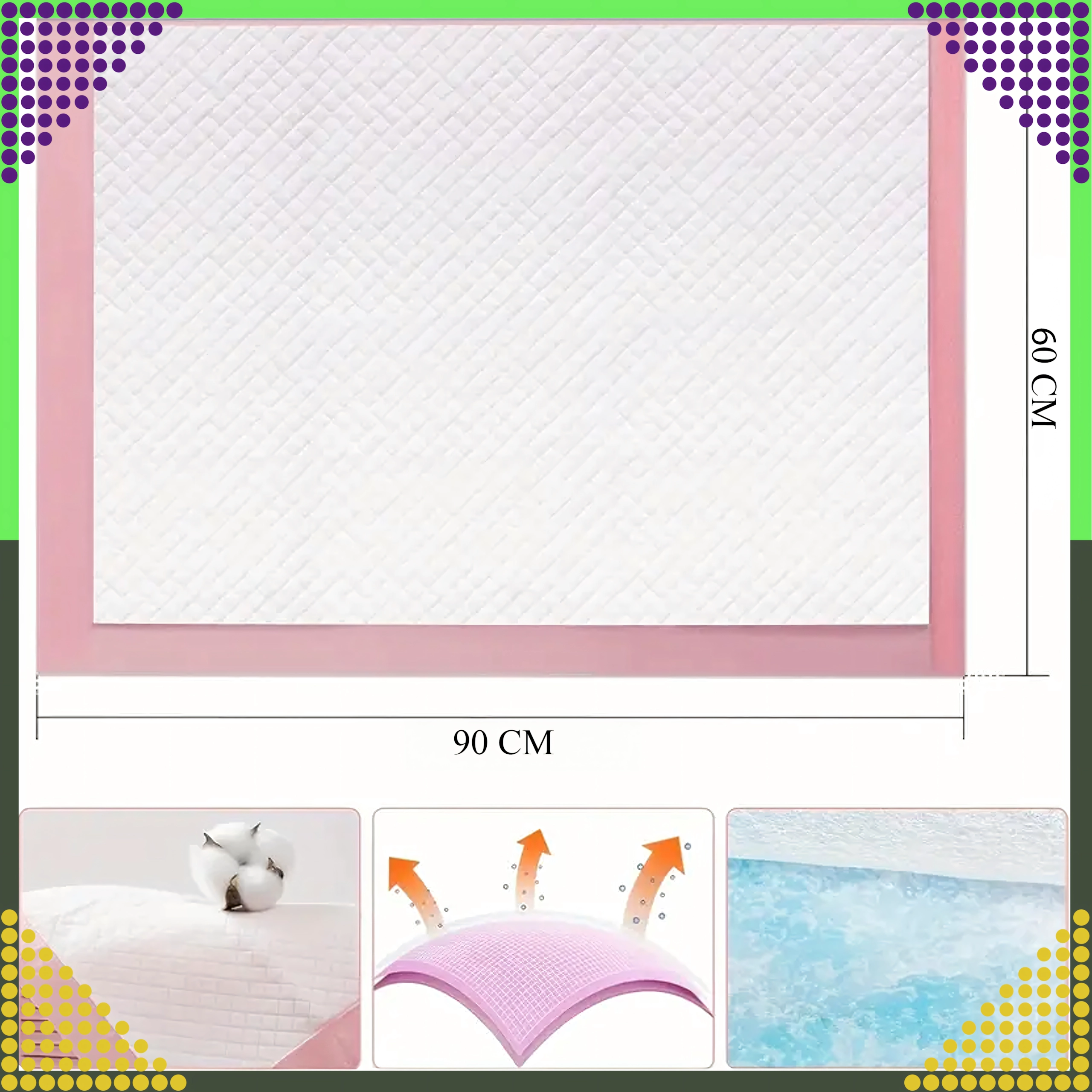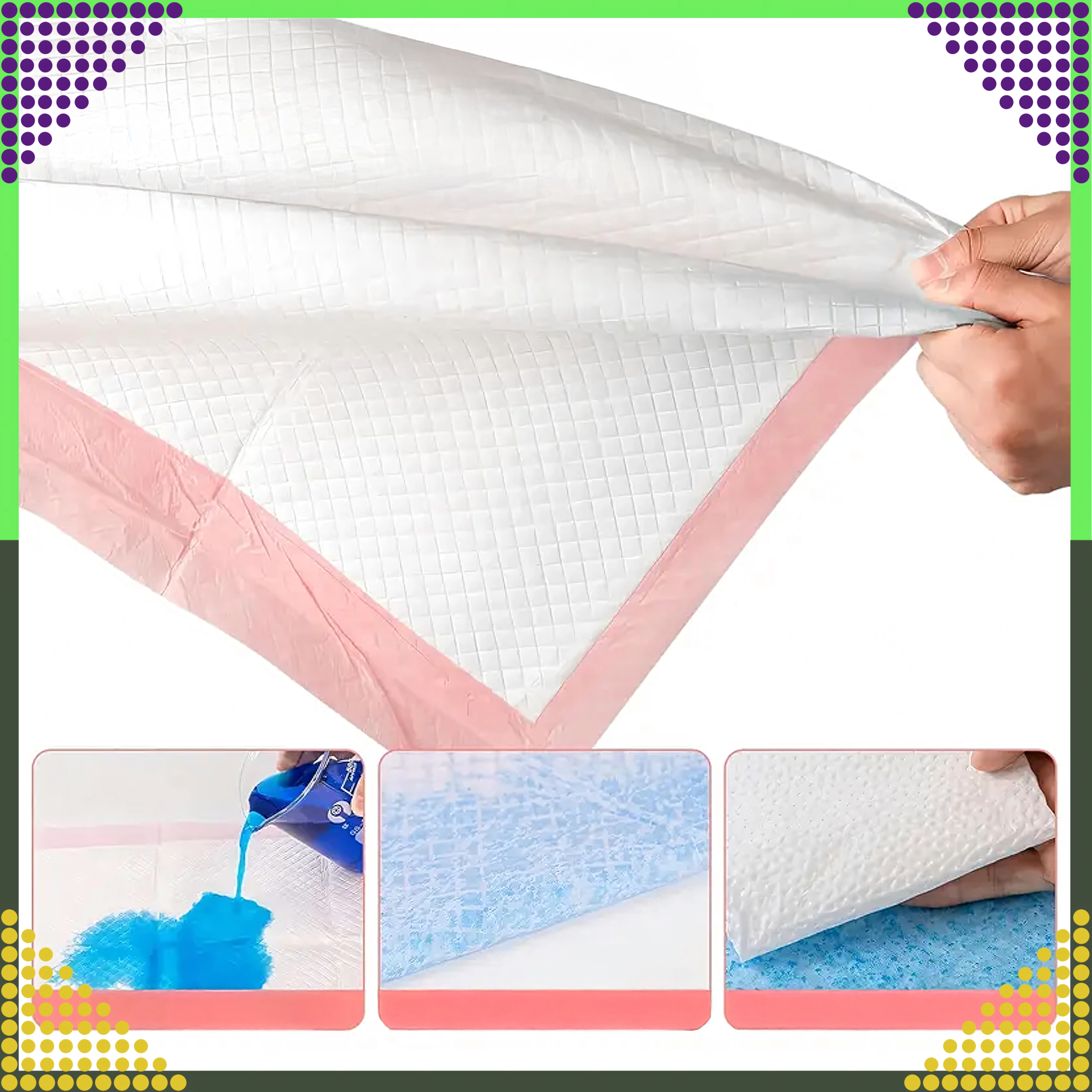 Tieto silné a savé tréningové podložky sú navrhnuté na každodenné použitie v domácnosti. Viacvrstvová konštrukcia účinne pohlcuje tekutiny a uzamyká vlhkosť vo vnútri, zatiaľ čo nepriepustná spodná vrstva chráni podlahy, koberce aj nábytok.