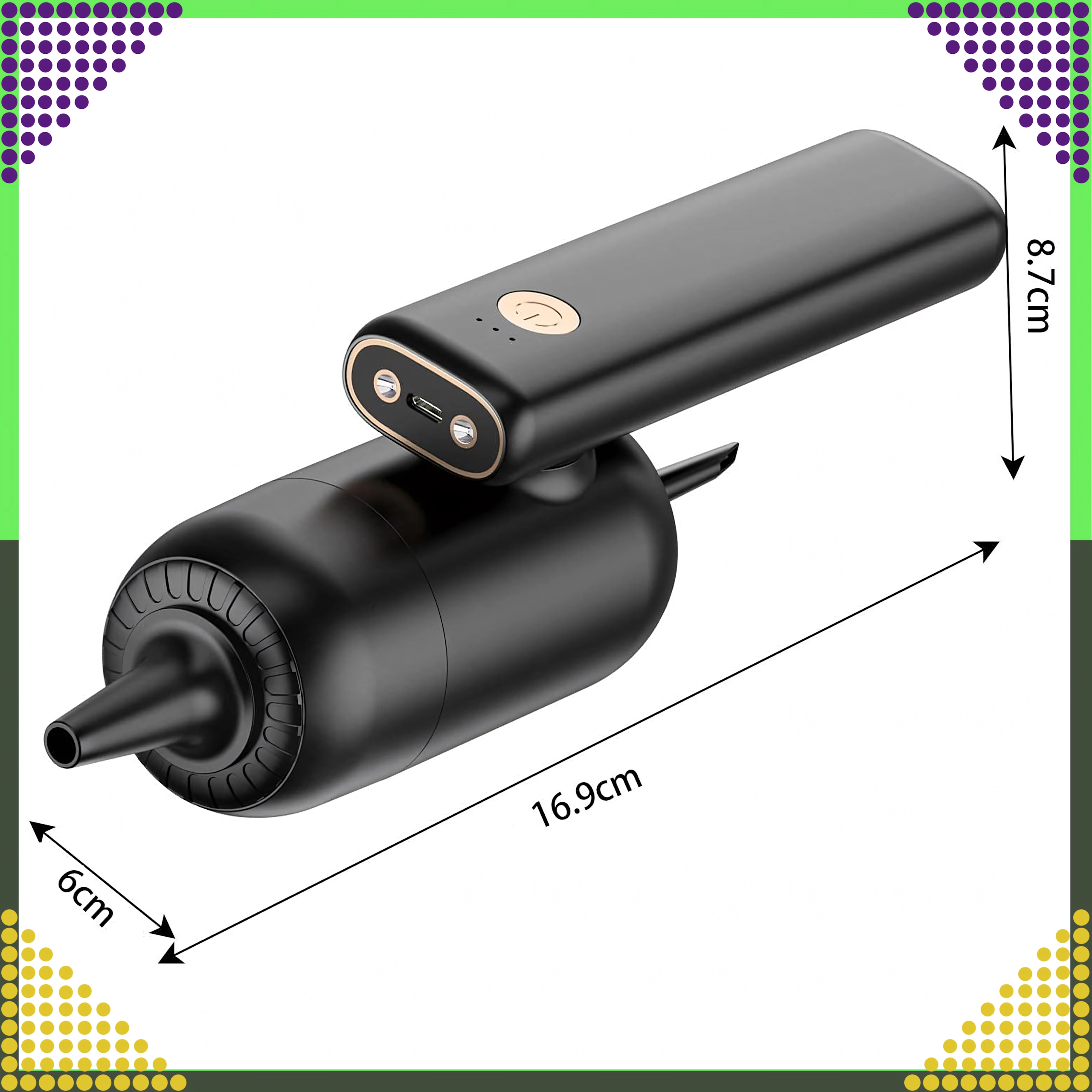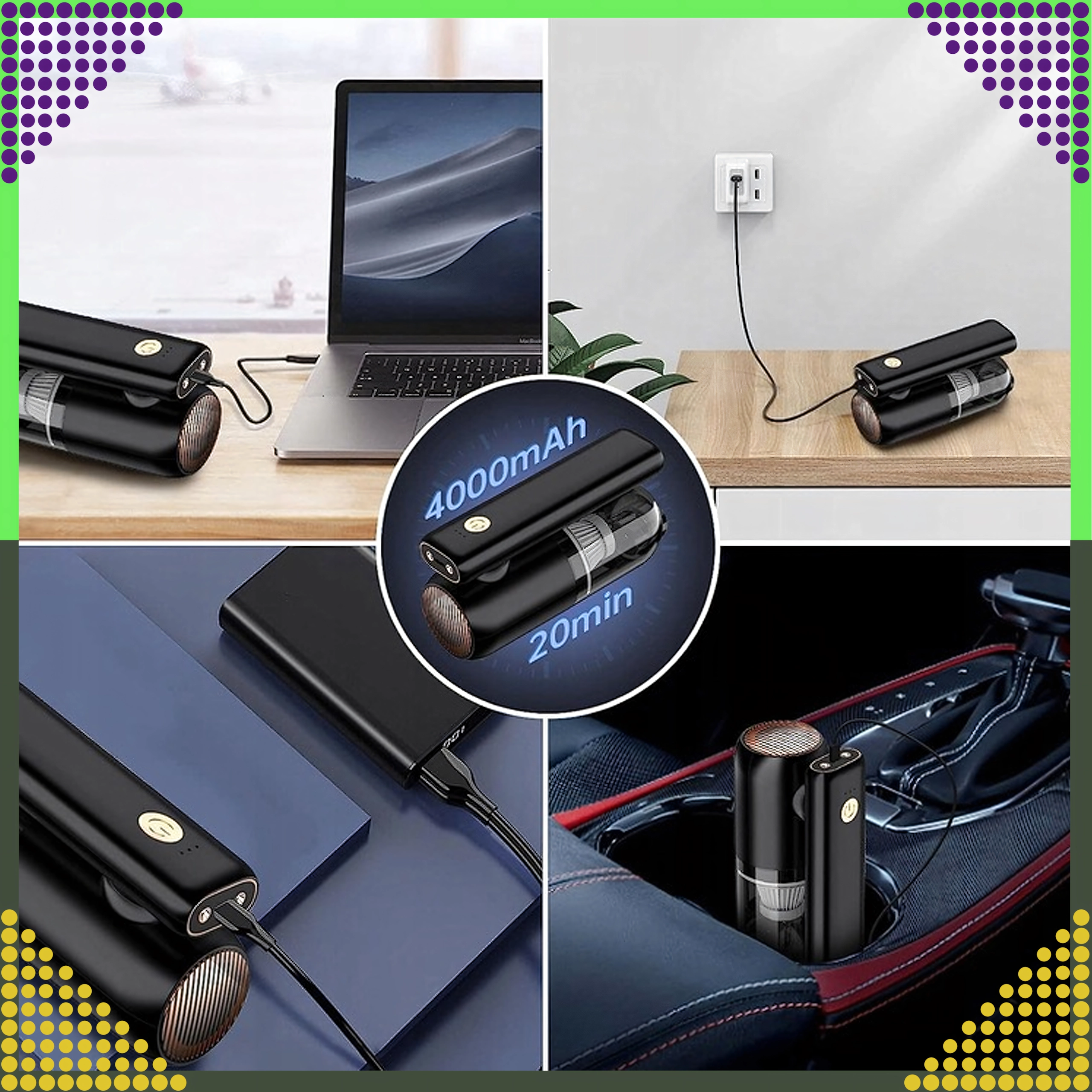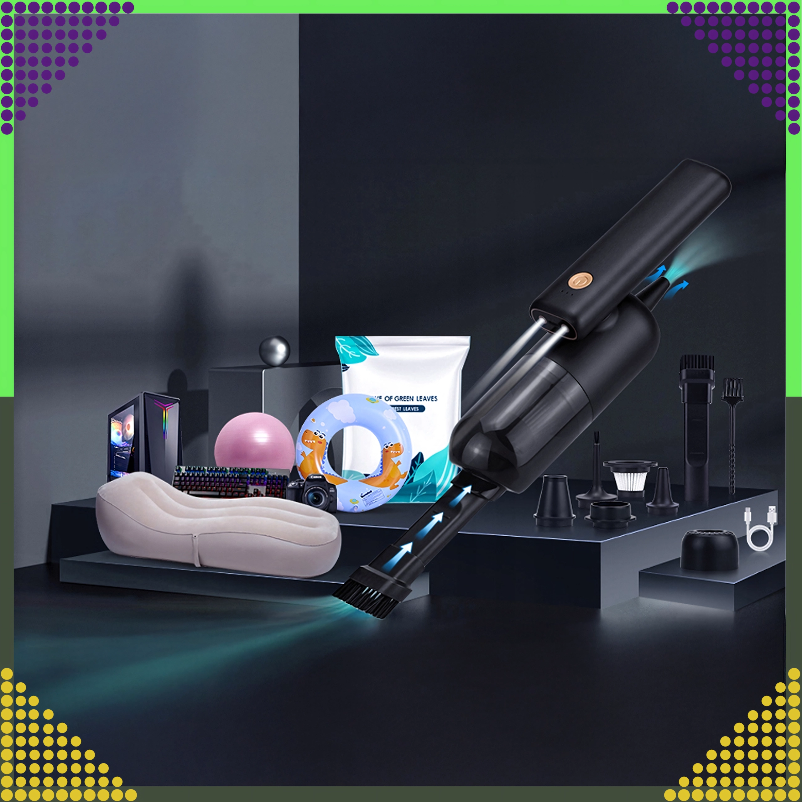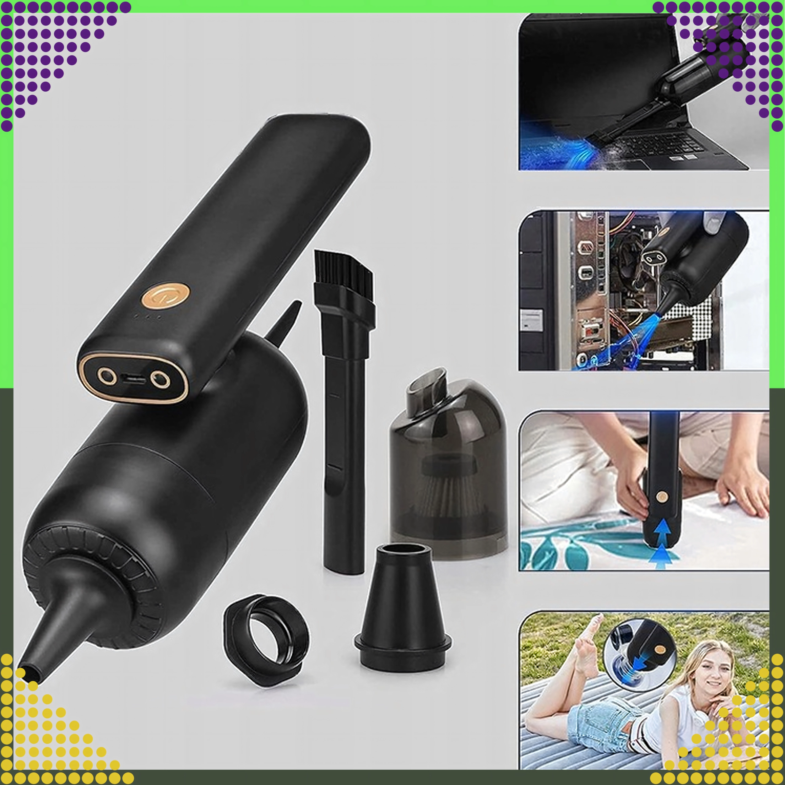 Kompaktný a výkonný ručný vysávač 2v1 pre auto aj domácnosť spája bezdrôtové používanie, silný sací výkon a funkciu ofuku v jednom zariadení. Vďaka HEPA filtru účinne zachytí prach, peľ aj drobné častice, zatiaľ čo LED osvetlenie pomôže vidieť aj na tmavých miestach. Ideálny na rýchle upratovanie piesku, prachu, omrviniek aj zvieracích chlpov v aute, na stole či okolo klávesnice.