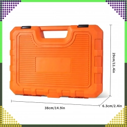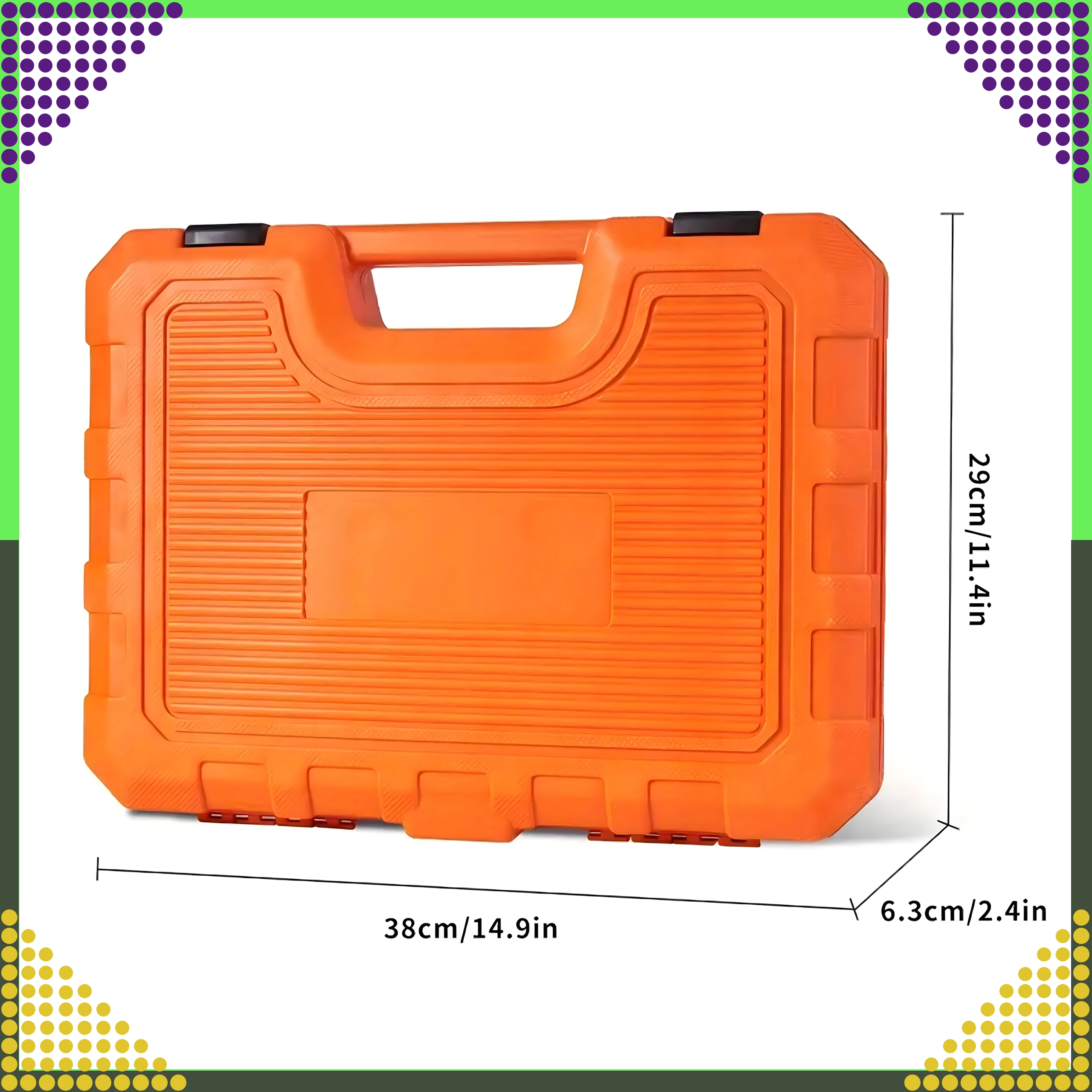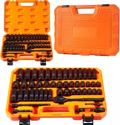 Prehľadne usporiadané metrické aj SAE hlavice, račňa, predĺženia a adaptéry v odolnom oranžovom kufri pre ľahký transport.