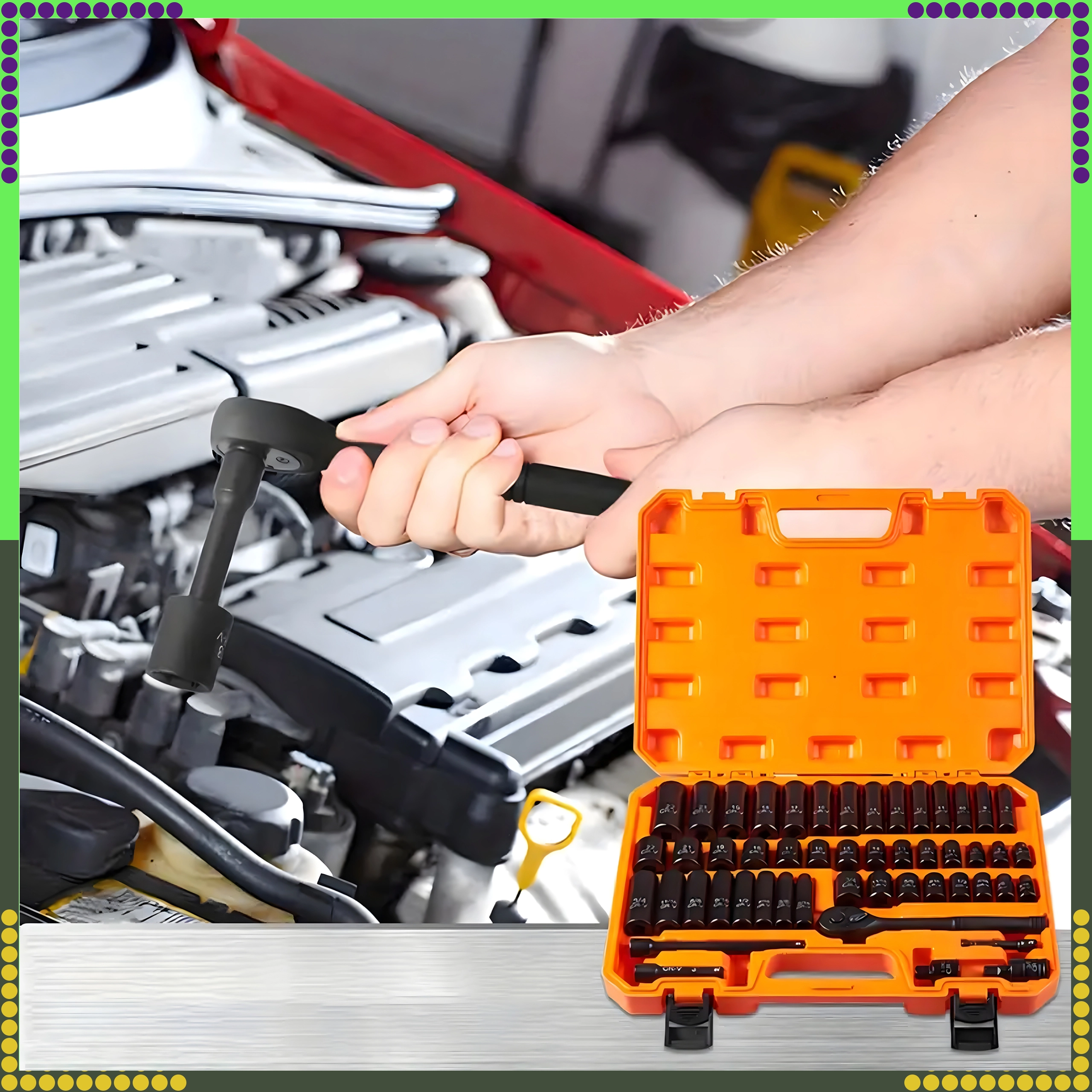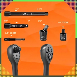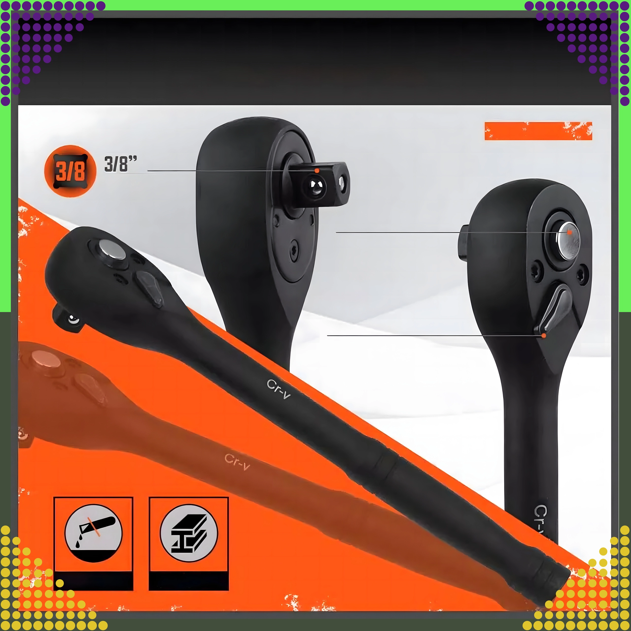 Precízna račňa s ergonomickou rukoväťou zrýchľuje prácu, predĺženia a kĺb pridajú dosah v stiesnených priestoroch. Odolná chróm-vanádiová oceľ Cr‑V poskytuje vysokú životnosť a spoľahlivosť pri rázovom zaťažení, zatiaľ čo robustný kufor udrží všetko prehľadne usporiadané a pripravené na prenášanie.