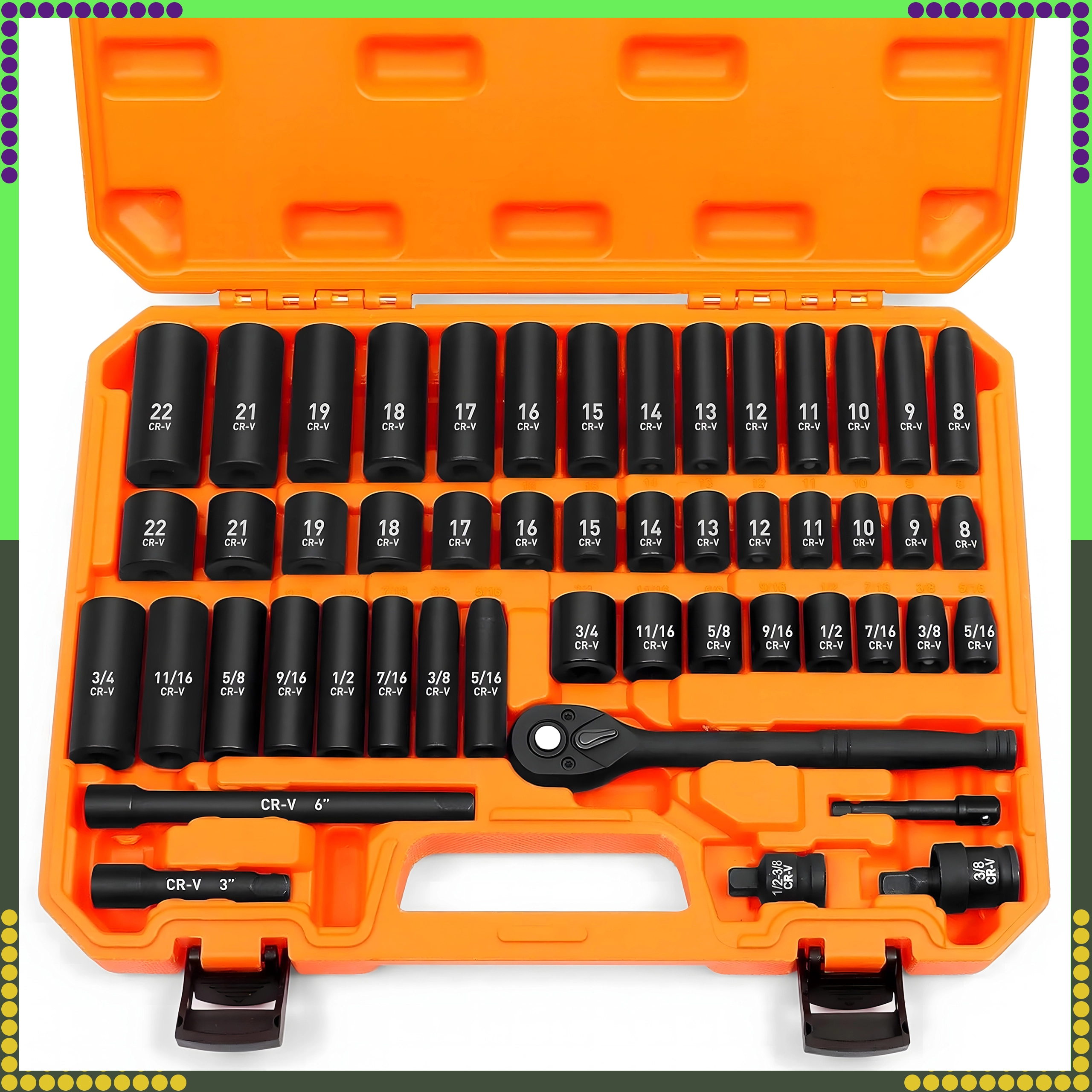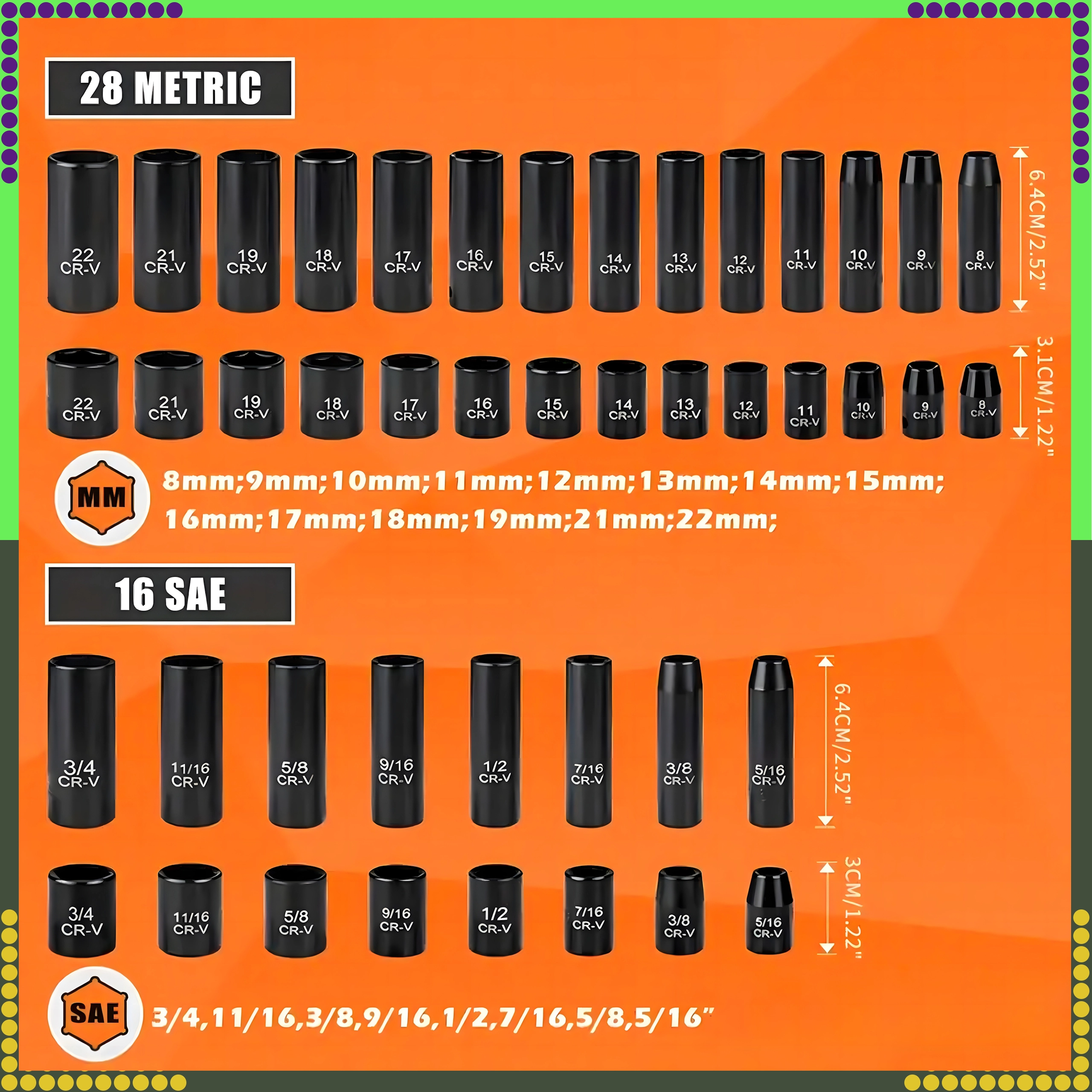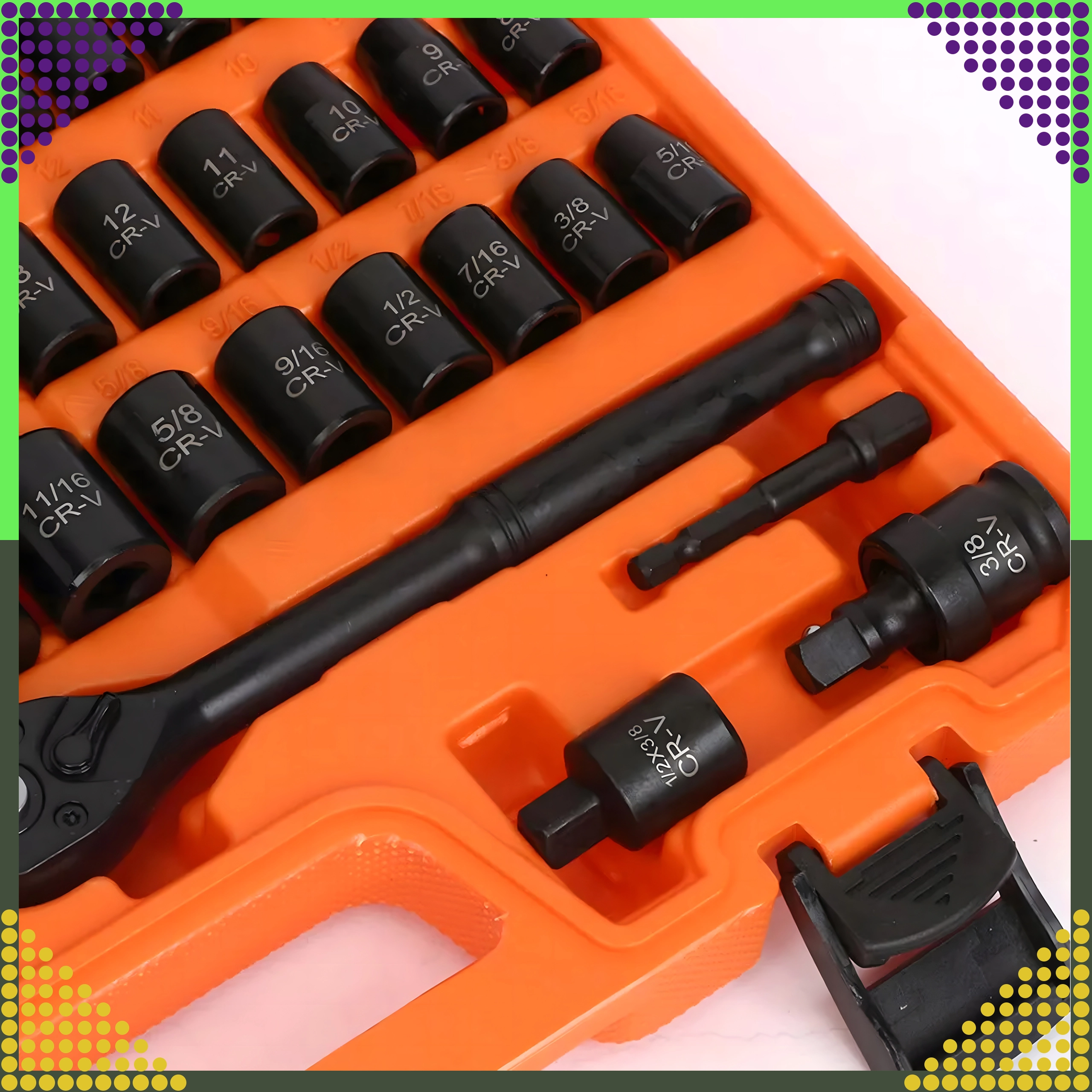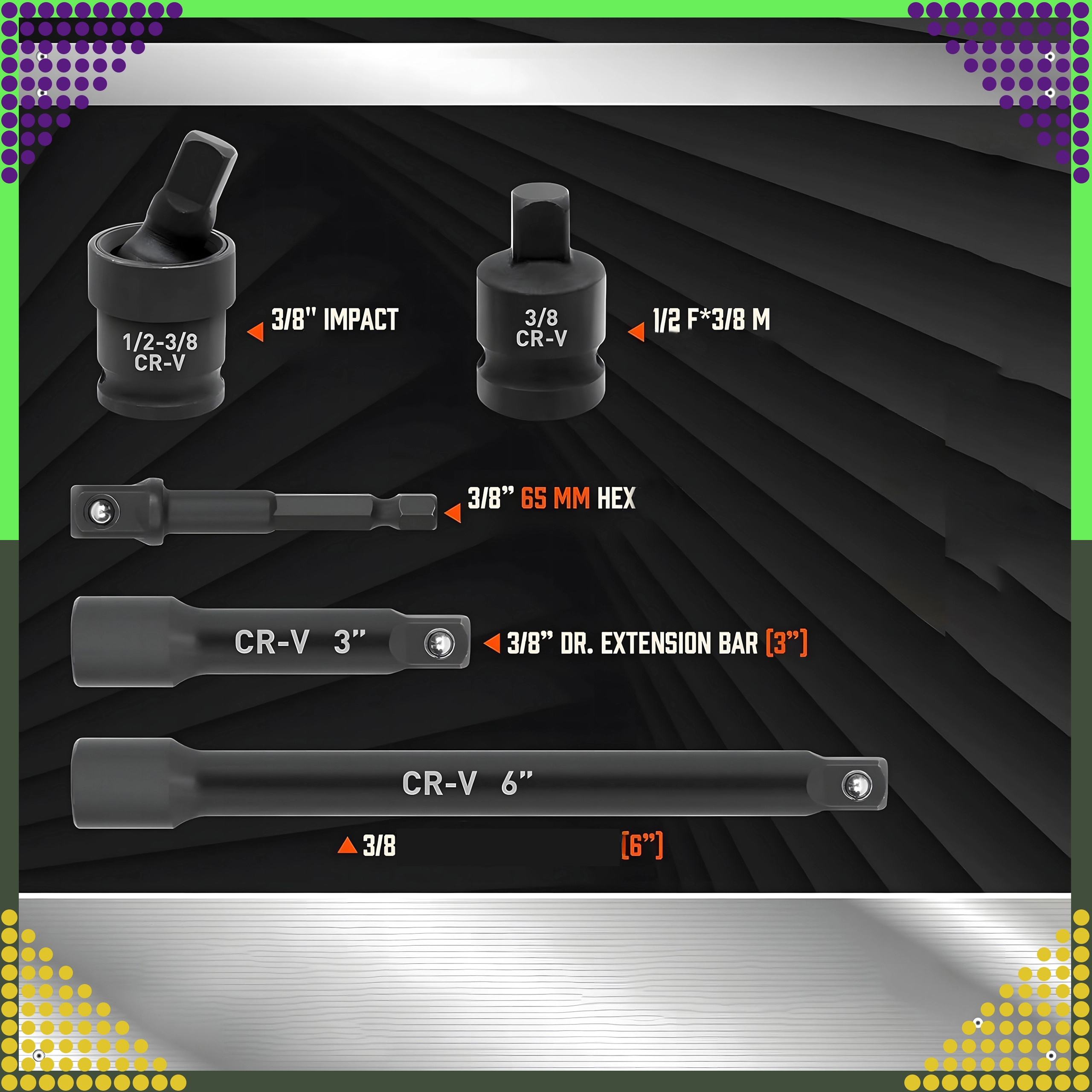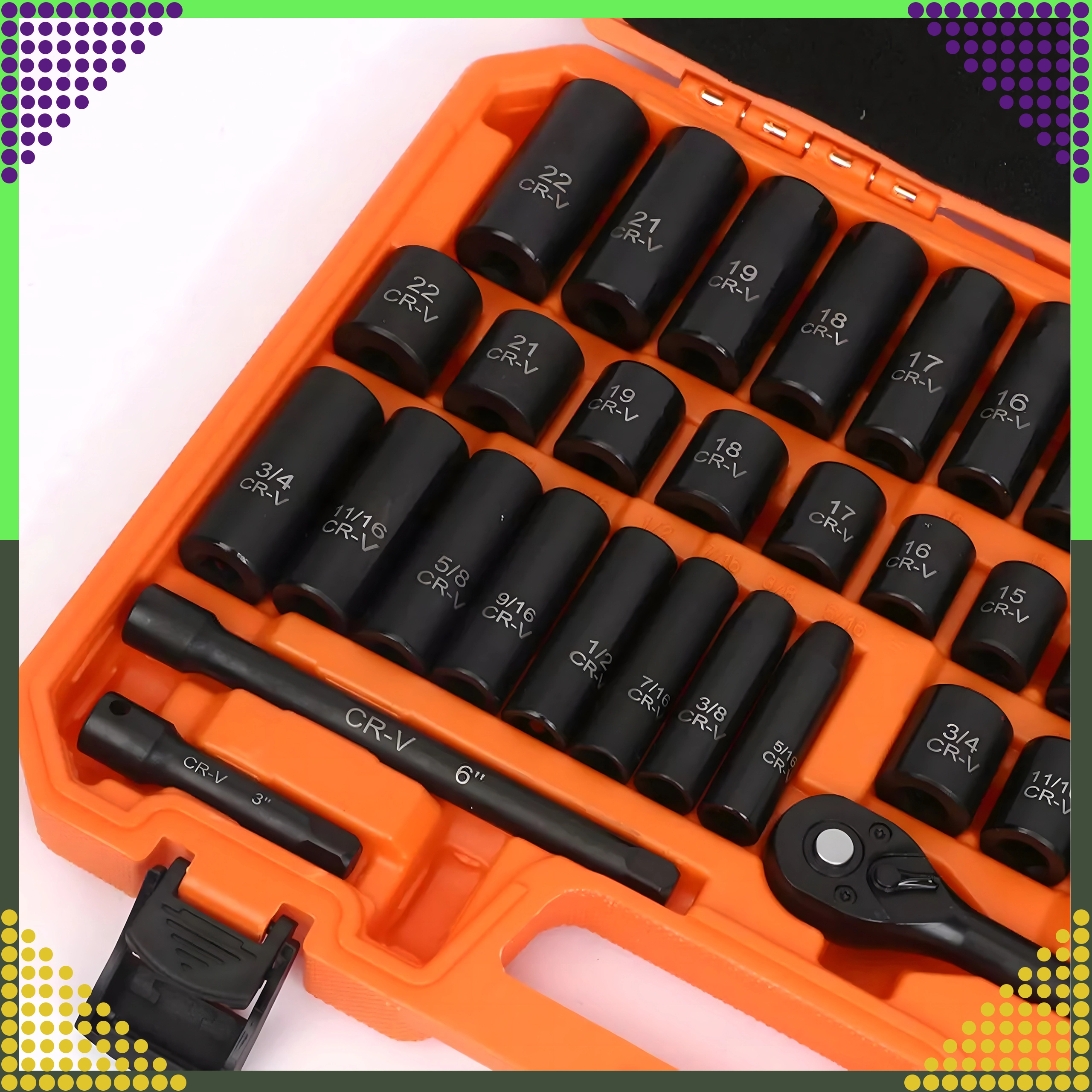 Táto univerzálna sada rázových nástrčných hlavíc 3/8'' je navrhnutá pre mechanikov, opravárov aj náročných hobby používateľov. Kombinuje metrické aj SAE rozmery, takže ľahko zvládnete servis európskych aj amerických strojov. 6-hranný profil zabezpečuje pevný kontakt so skrutkou a znižuje riziko strhnutia hrán.
