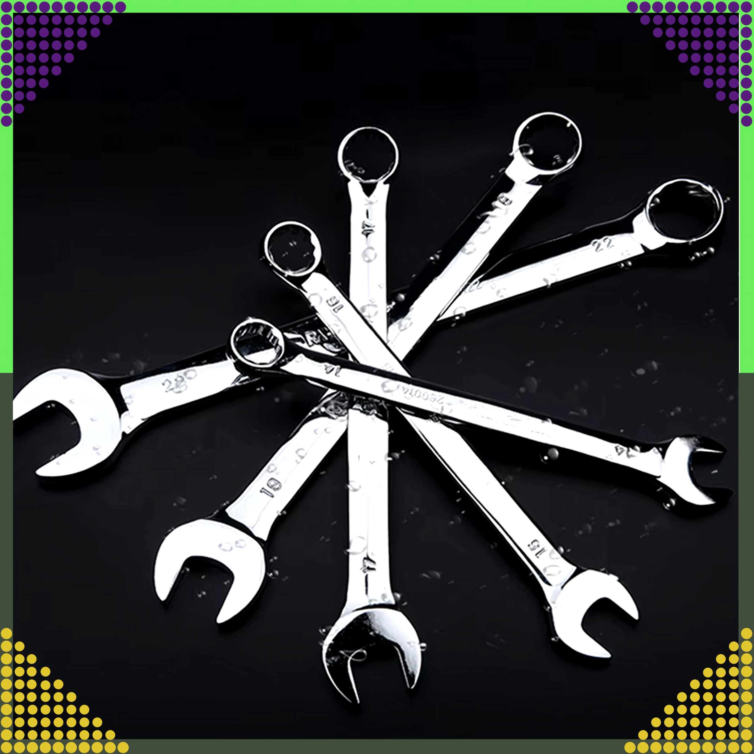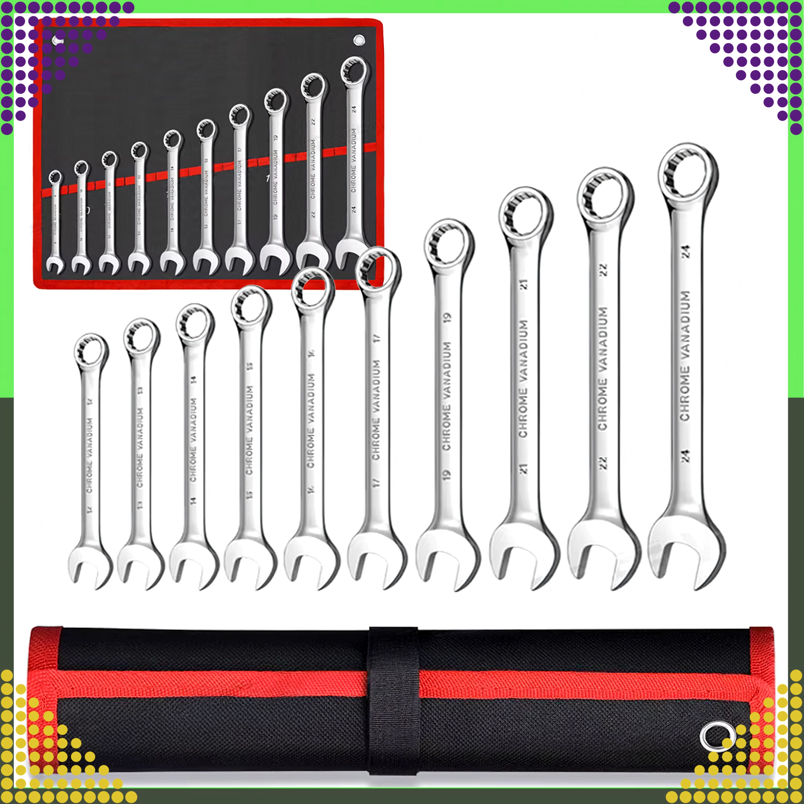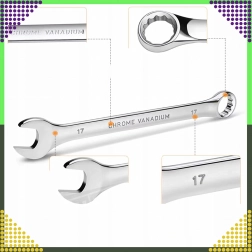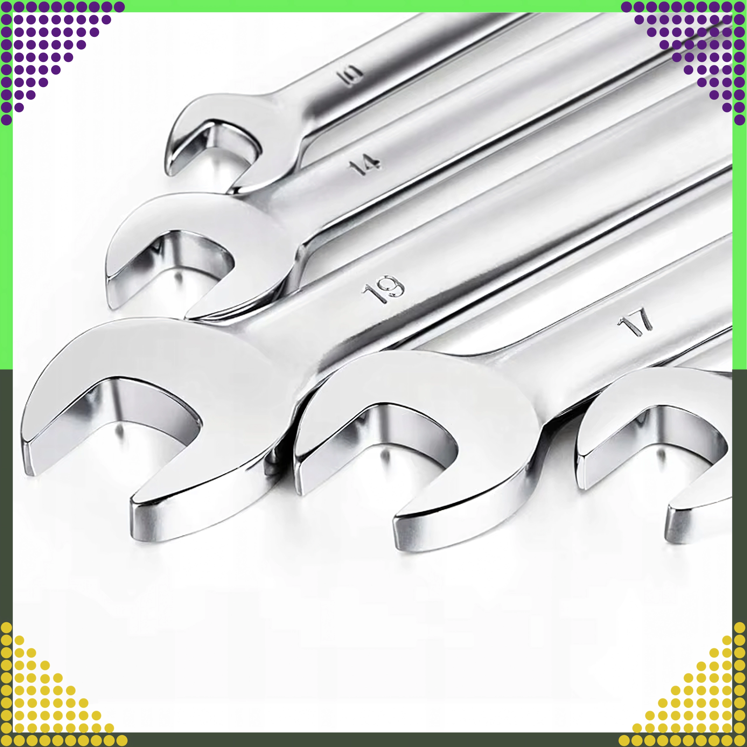 Táto profesionálna sada kľúčov zahŕňa najpoužívanejšie rozmery od 8 do 24 mm. Každý kľúč kombinuje otvorený (plochý) koniec na rýchle práce v úzkych miestach a očkový koniec na bezpečné a pevné uchopenie skrutiek a matíc. Oceľ chróm-vanádium (CR‑V) poskytuje vysokú odolnosť proti opotrebovaniu aj korózii.