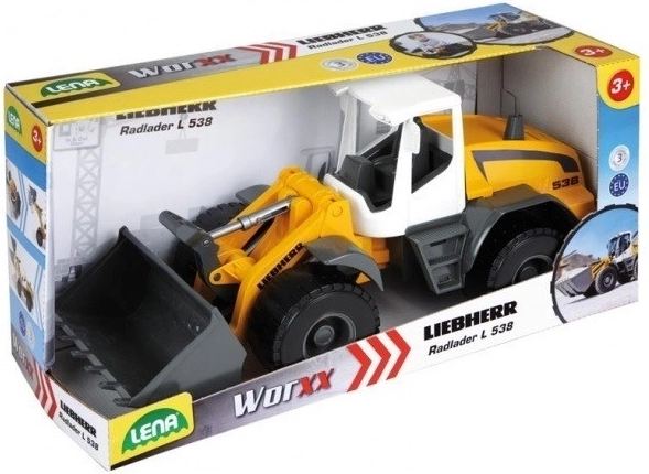 Robustný detský kolesový nakladač LIEBHERR od LENA nadchne malých staviteľov od 3 rokov. Má pohyblivú lyžicu a predné kolesá, kovové osi kolies 6 mm a je vyrobený z kvalitného, odolného plastu. Ideálny na pieskovisko aj do detskej izby. Rozmery 49 × 18 × 22 cm.