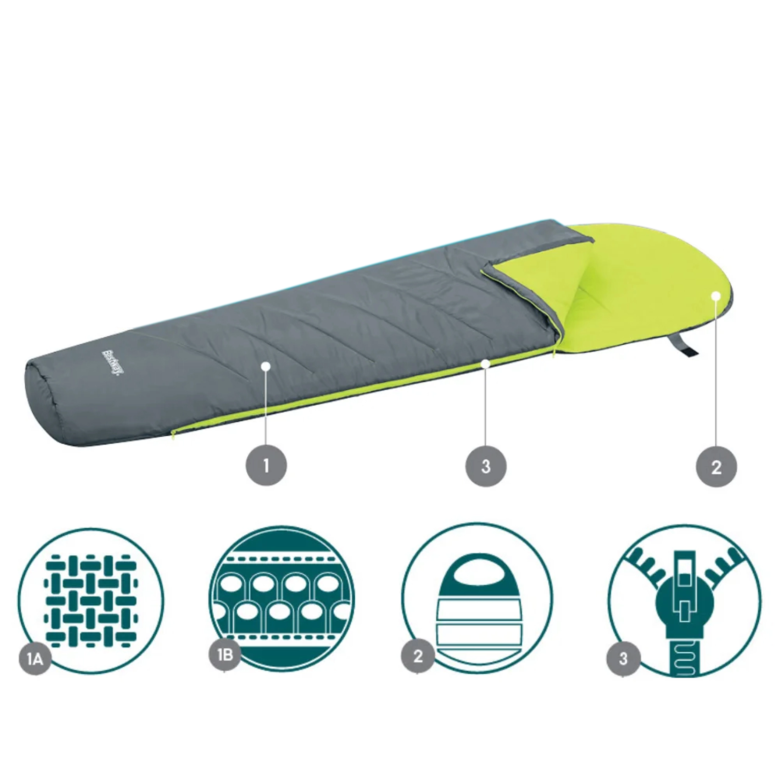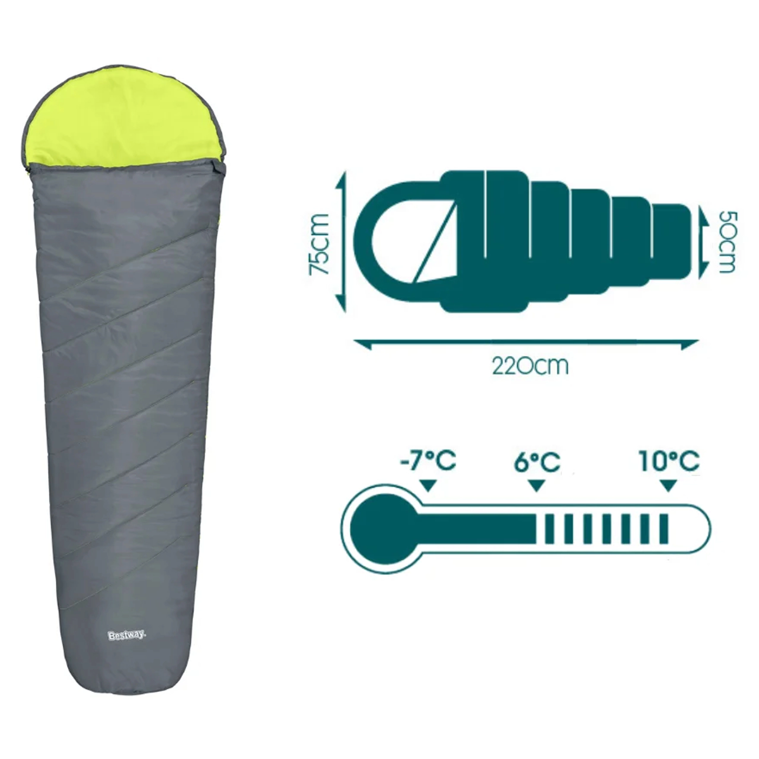Užite si pokojný spánok v prírode so spacím vakom Bestway typu múmia, ktorý kombinuje nízku hmotnosť, odolné materiály a spoľahlivú tepelnú izoláciu. Polkruhová kapucňa chráni hlavu a krk pred chladom, zatiaľ čo pevný vonkajší materiál z polyesteru 170T odolá vlhkosti aj opotrebovaniu.