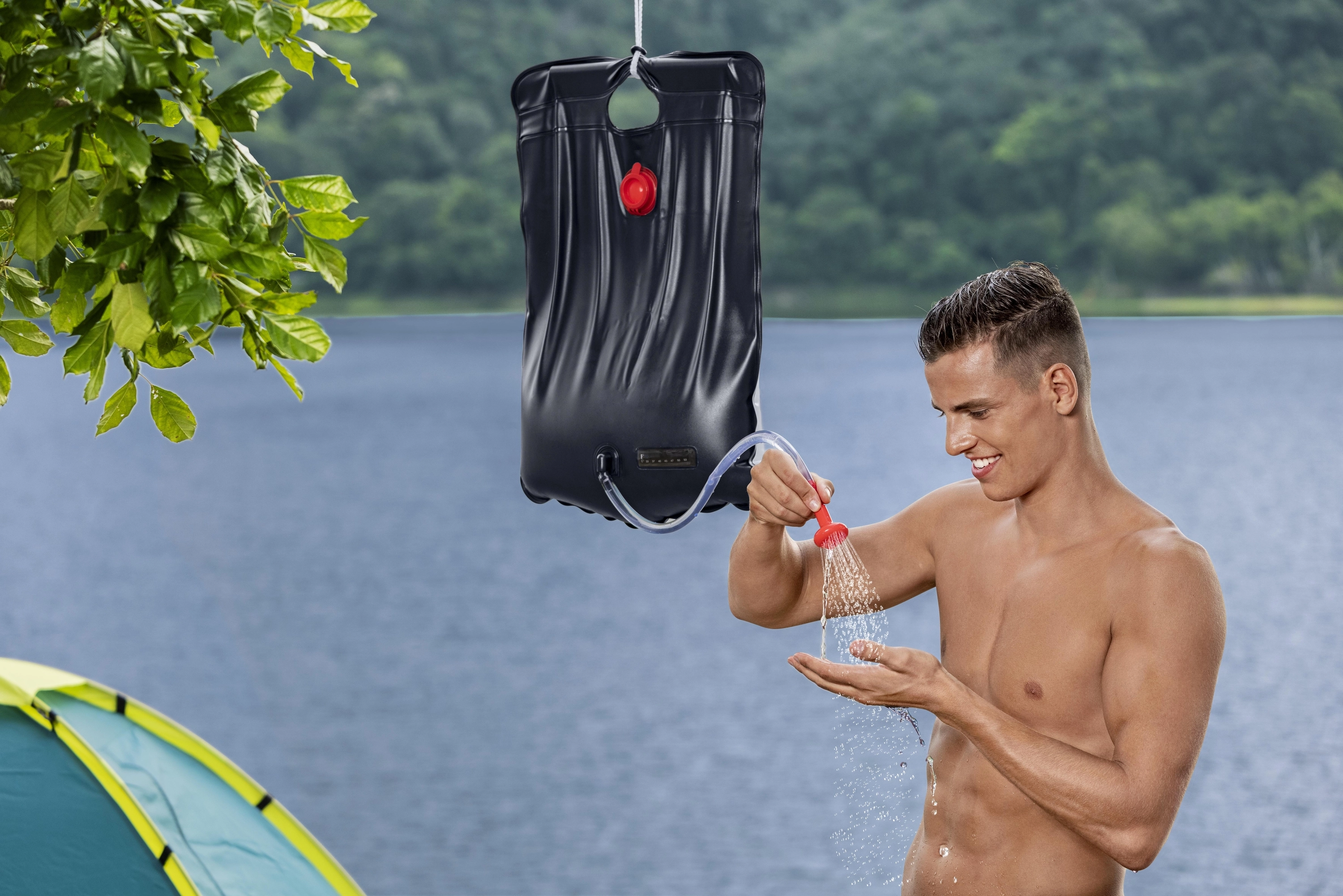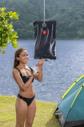 Vďaka objemu 20 litrov poskytne dostatok vody na viac krátkych sprch. Sprcha má zosilnený záves na bezpečné upevnenie na vetvu, hák či lano a sprchovú hadicu s koncovkou pre pohodlné ovládanie prietoku. Po vypustení sa zloží naplocho a nezaberá miesto v batohu.