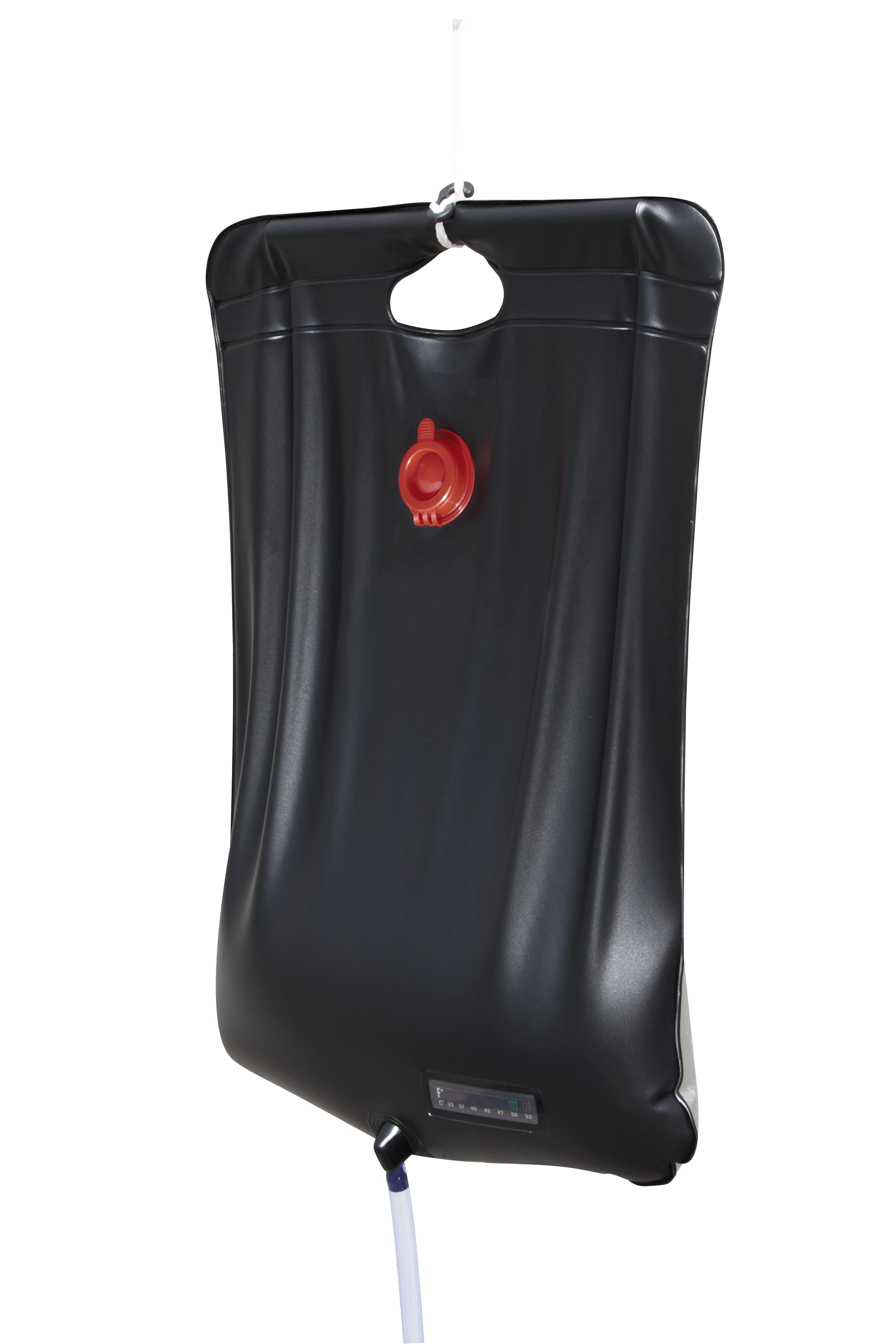 Čierny povrch efektívne absorbuje slnečné žiarenie a ohrieva až 20 l vody na približne 40 °C – ideálne pre komfortnú sprchu v kempe či pri vode.