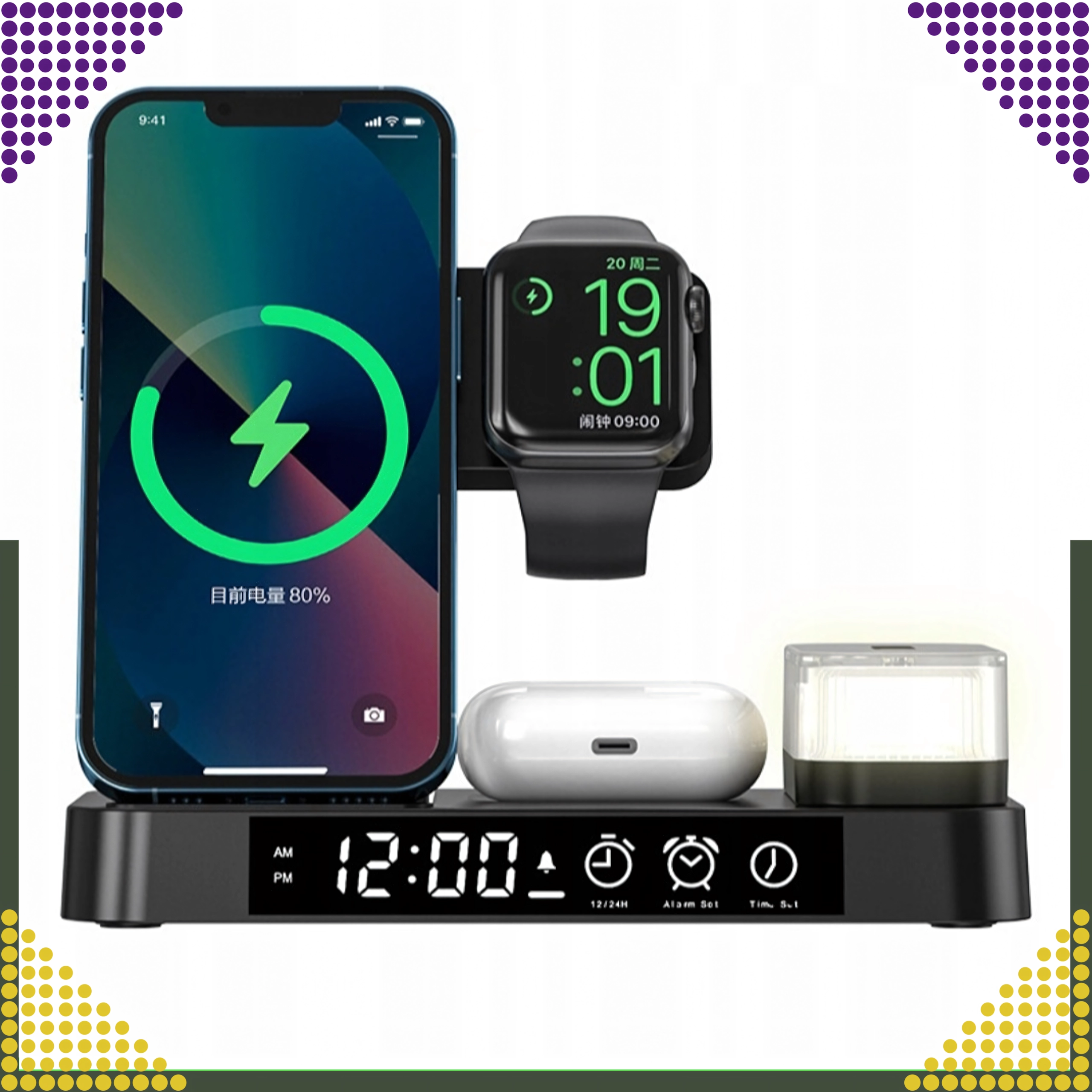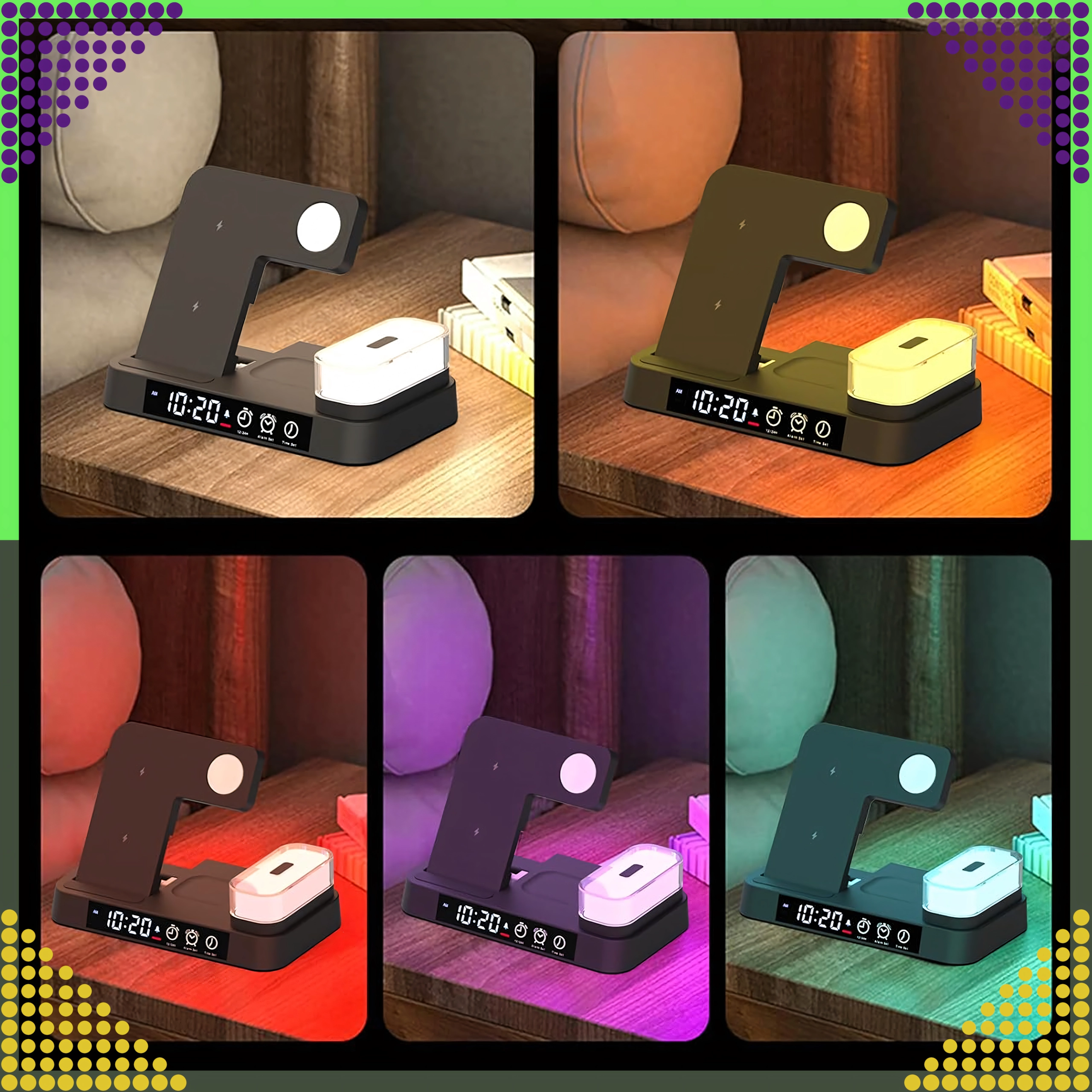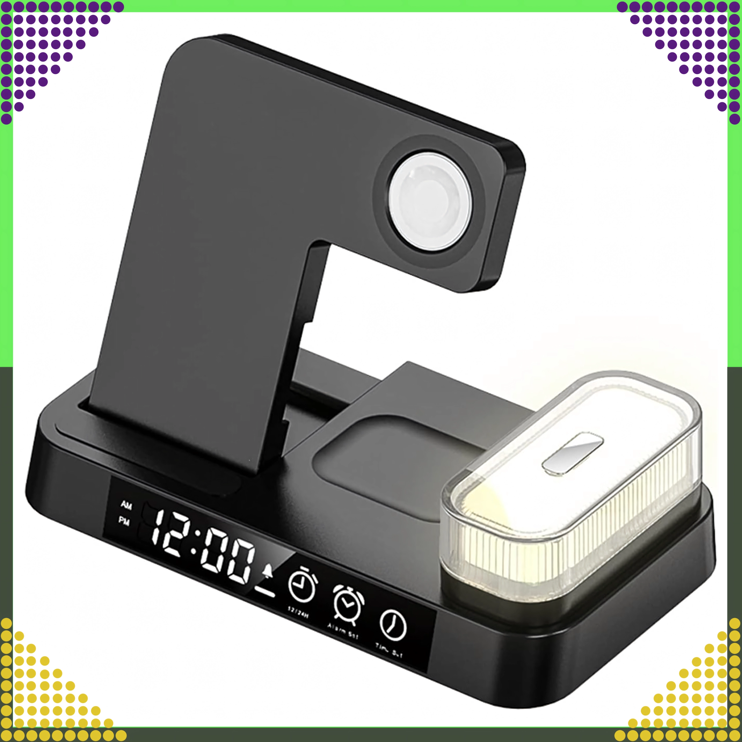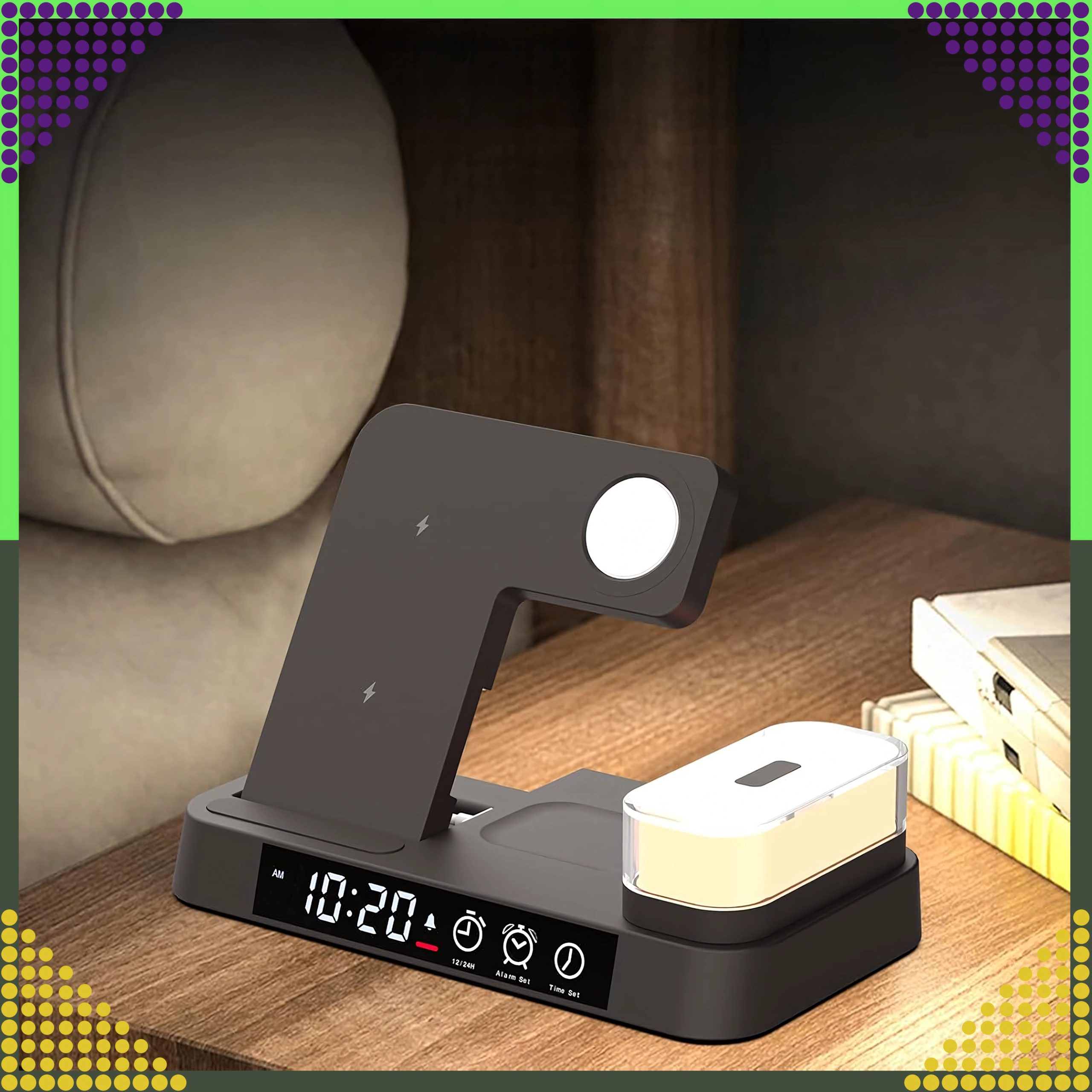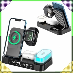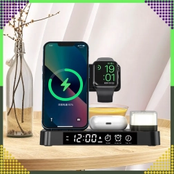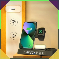 Univerzálna bezdrôtová stanica 4v1 kombinuje rýchle nabíjanie 15 W, stojan na telefón, nabíjanie Apple Watch a AirPods a navyše LED hodiny s nočnou lampičkou. Elegantný skladací dizajn šetrí miesto a je kompatibilný so všetkými zariadeniami podporujúcimi Qi.
