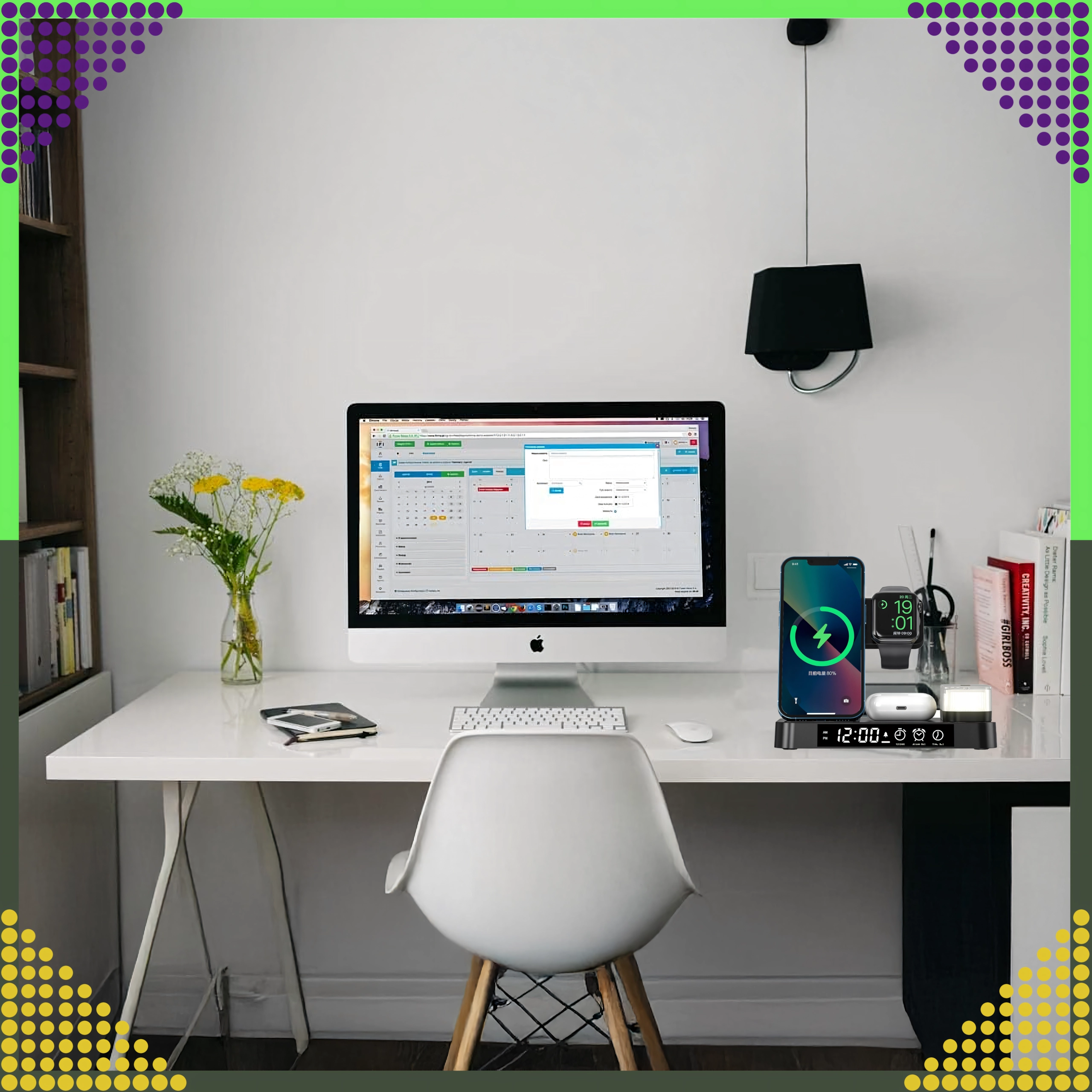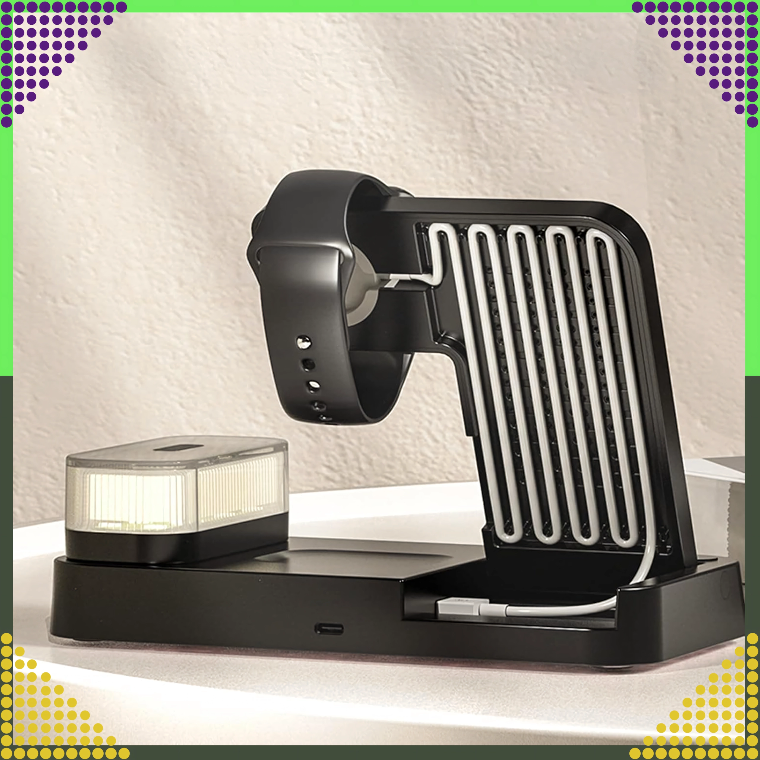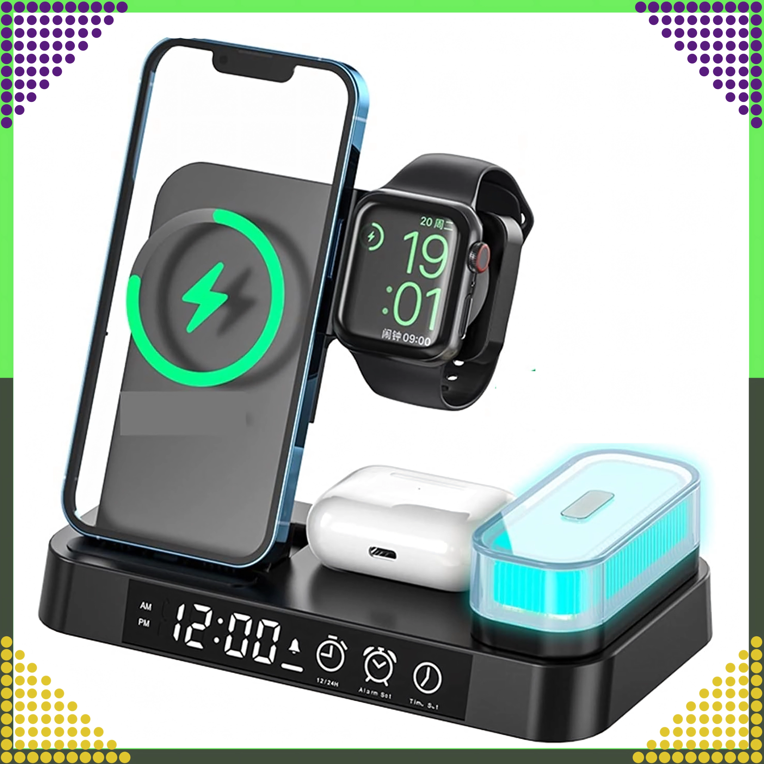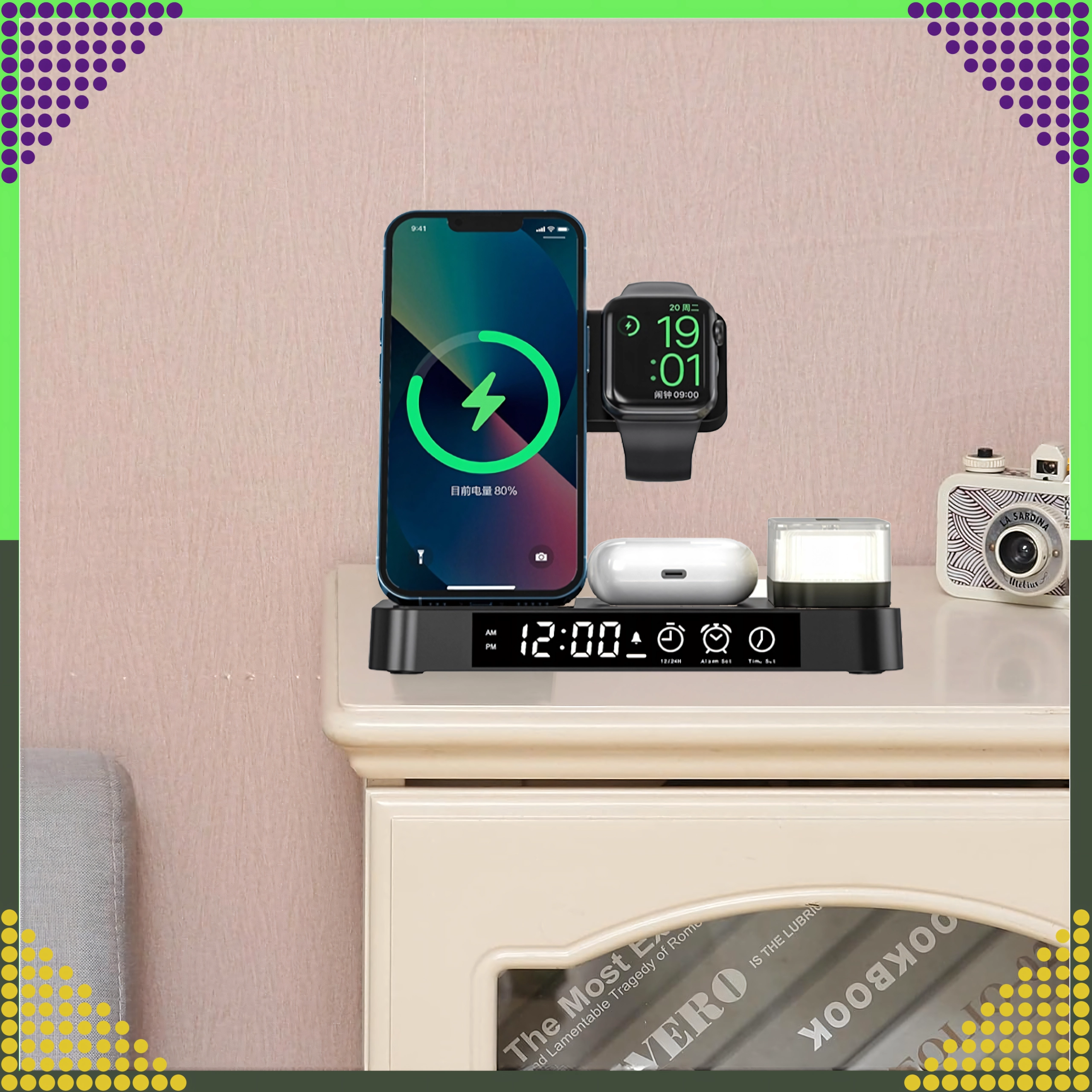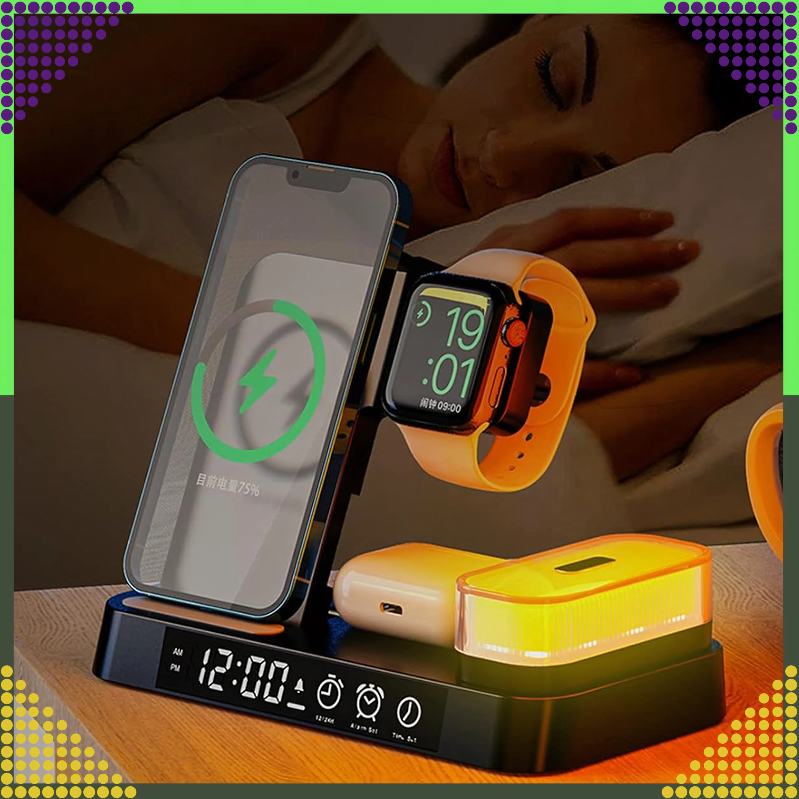 Univerzálna bezdrôtová stanica 4v1 kombinuje rýchle nabíjanie 15 W, stojan na telefón, nabíjanie Apple Watch a AirPods a navyše LED hodiny s nočnou lampičkou. Elegantný skladací dizajn šetrí miesto a je kompatibilný so všetkými zariadeniami podporujúcimi Qi.