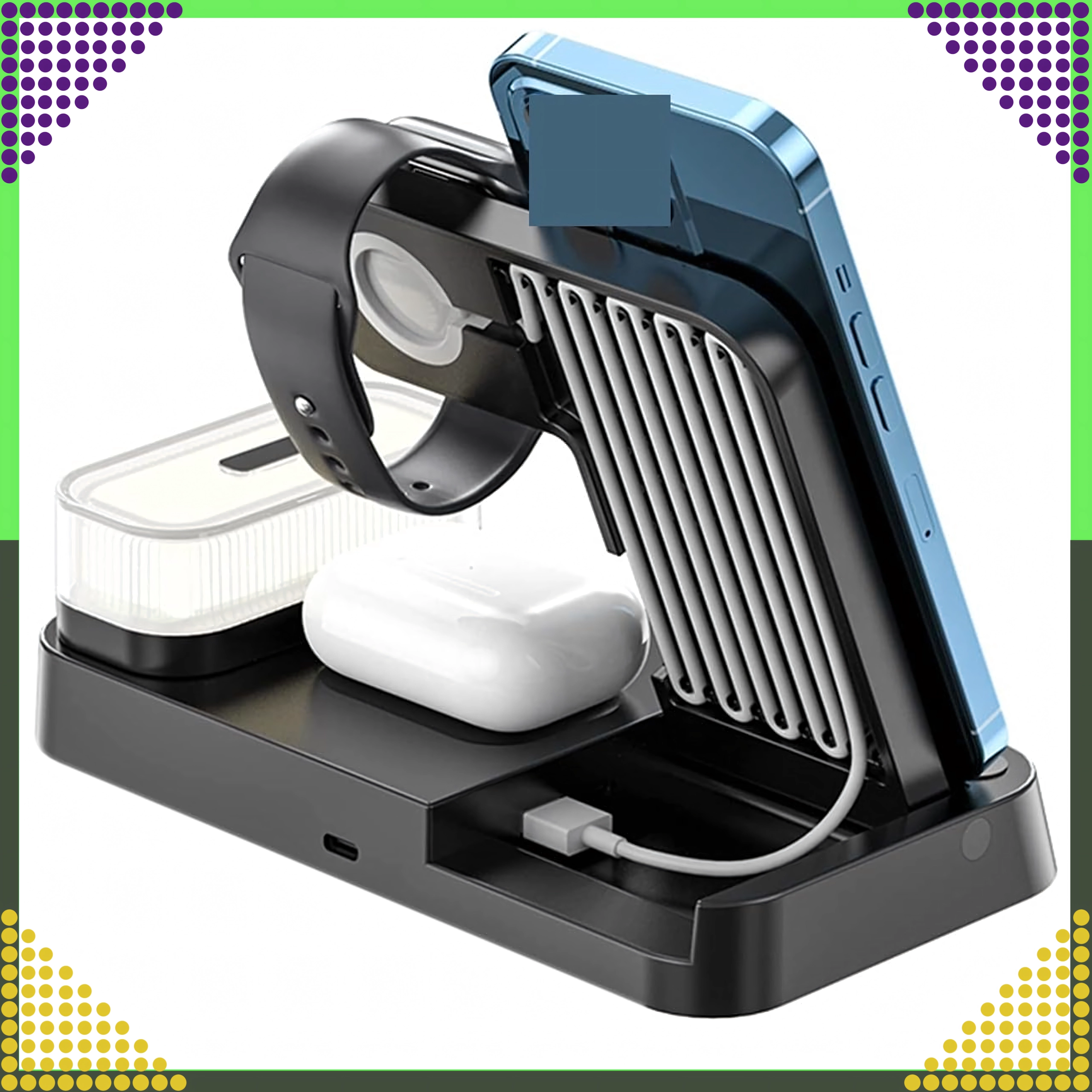 Táto moderná bezdrôtová nabíjačka 4v1 umožňuje pohodlne dobíjať telefón, inteligentné hodinky a bezdrôtové slúchadlá súčasne. Podporuje štandard Qi až 15 W pre rýchle a bezpečné nabíjanie a vďaka magnetickému držaniu udrží kompatibilný smartfón pevne vo zvislej polohe.