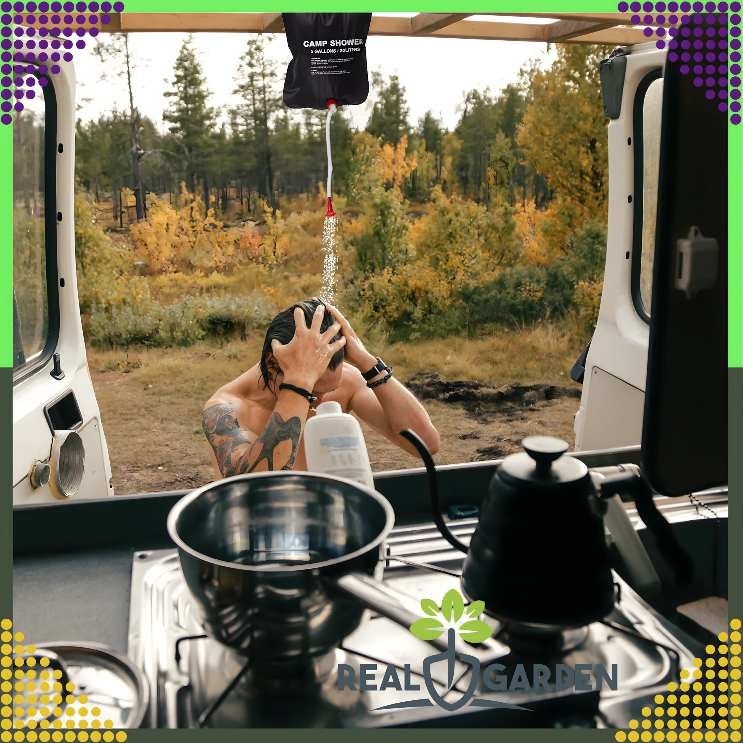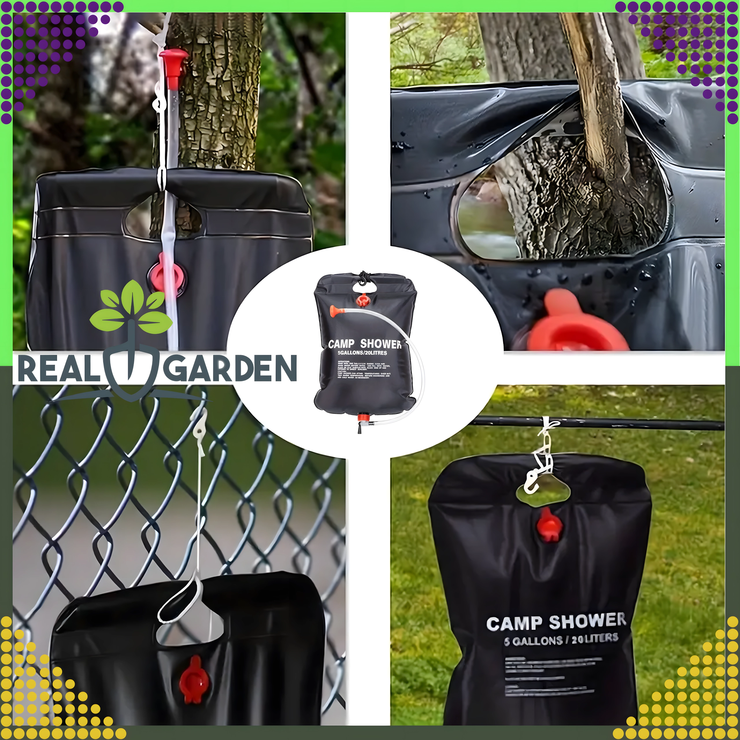 Sprcha je vybavená pevným úchytom na zavesenie a praktickou sprchovou hlavicou, čo zaručuje pohodlné použitie v kempe, pri vode aj na záhrade.