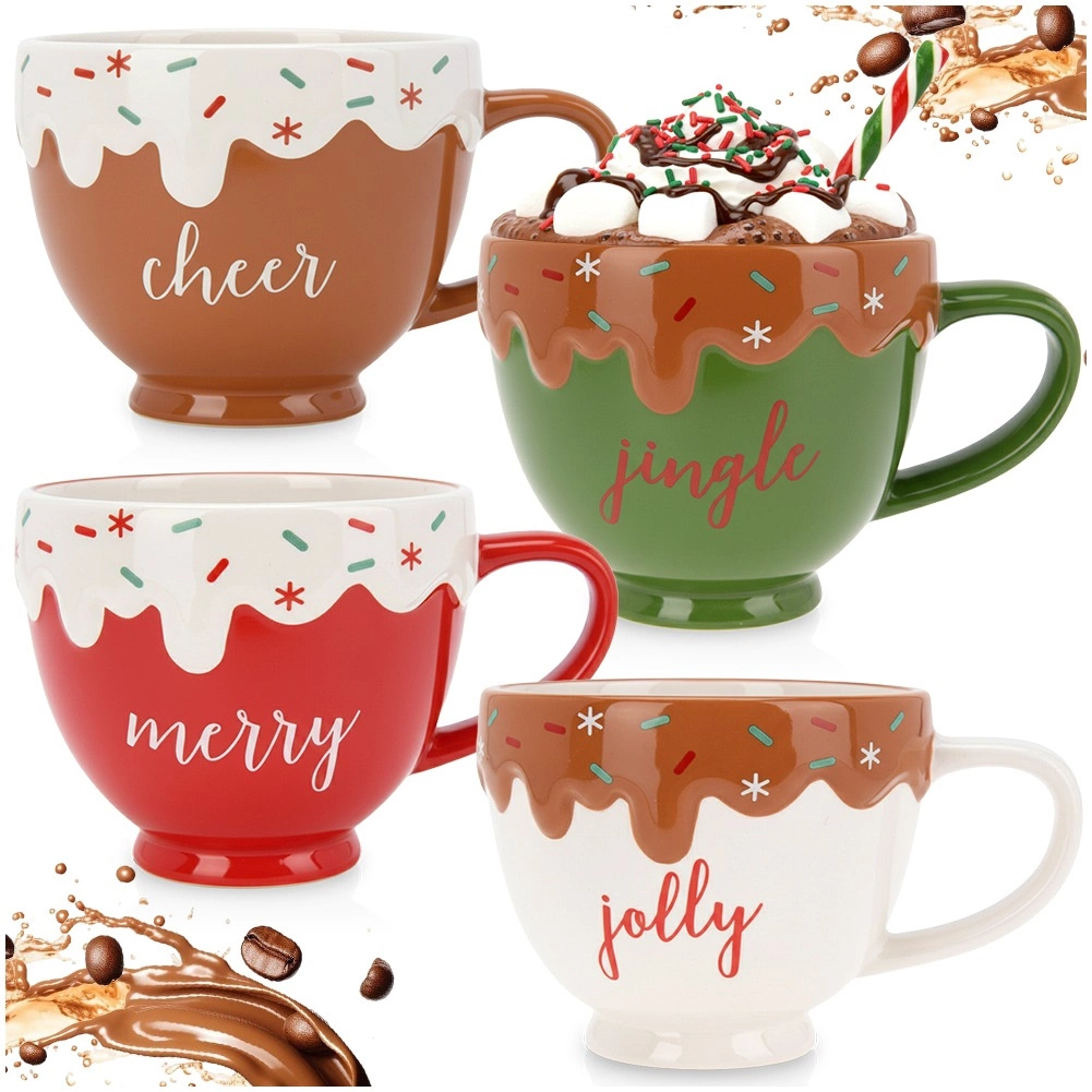 Táto sada štyroch sviatočných hrnčekov vnesie do vašej kuchyne radostnú atmosféru Vianoc. Každý hrnček zdobí efekt „kvapkajúcej polevy“ s farebným posypom a veselý nápis, vďaka čomu sú nielen praktickým, ale aj dekoratívnym doplnkom.