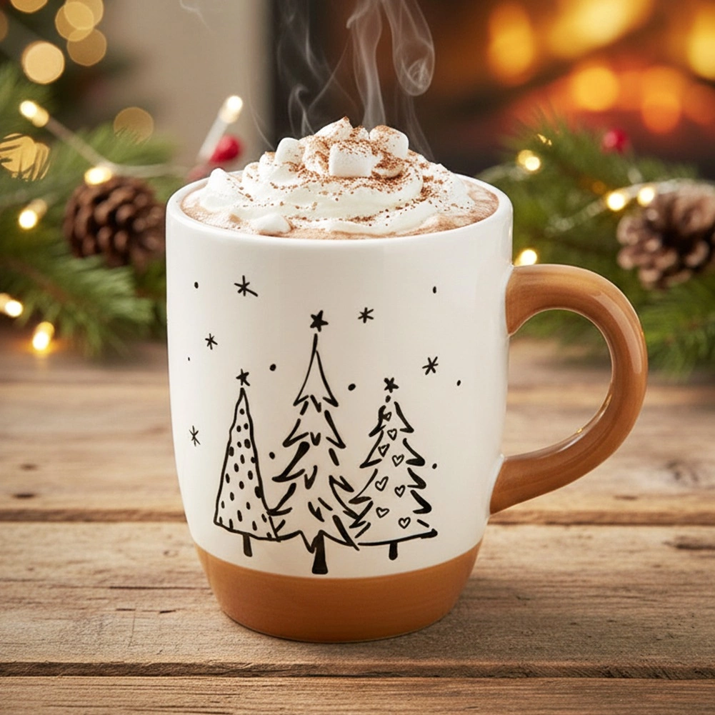 Štýlový keramický hrnček s minimalistickým motívom vianočných stromčekov v bielej a béžovej farbe. Má pohodlné ucho, objem 330 ml a je ideálny na čaj, káva aj horúce kakao. Vďaka kvalitnej keramike a pohodlnému držaniu je perfektný na zimné večery aj ako darček.