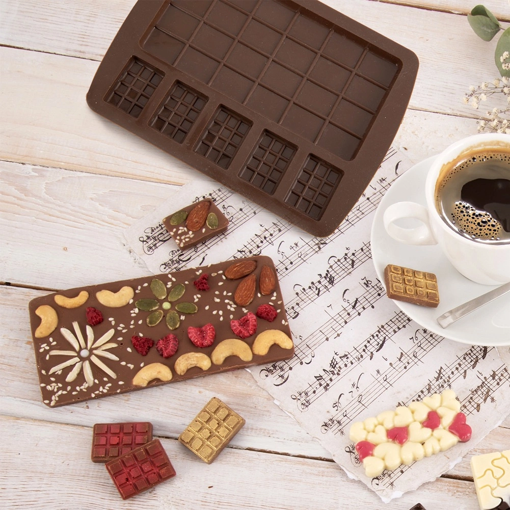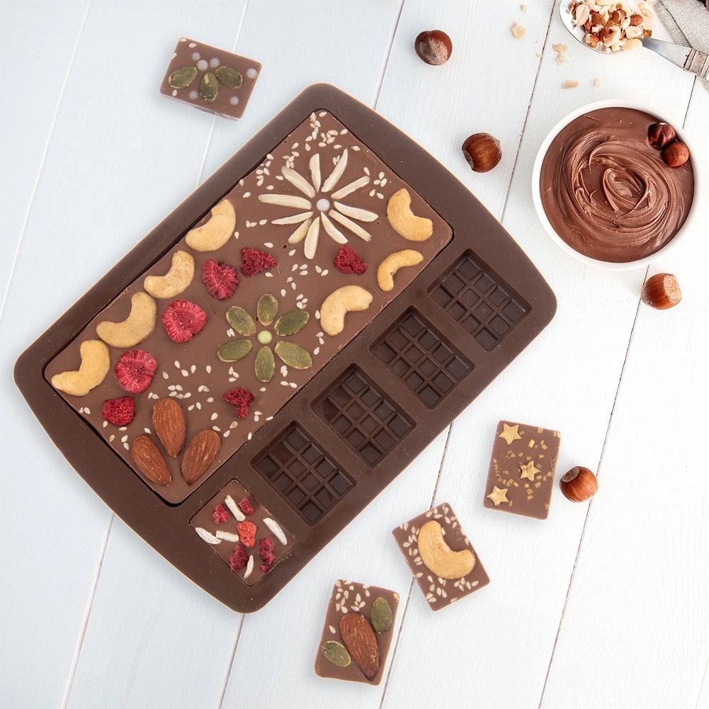 S touto univerzálnou formou z kvalitného silikónu pripravíte efektné tabuľky aj mini pralinky s orechmi, sušeným ovocím či sušienkami. Flexibilný materiál je pevný, odolný a nelepí, takže hotové kúsky vyklopíte bez poškodenia. Forma má celkové rozmery 18,5 × 13,5 × 1,5 cm.