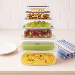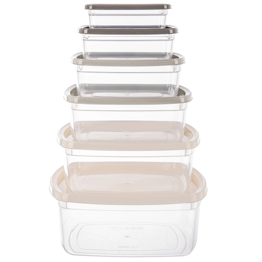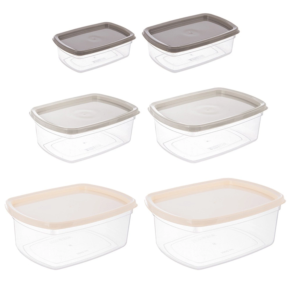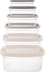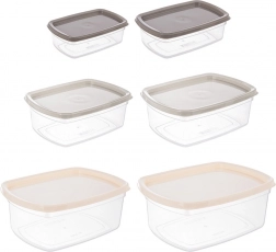Praktická sada šiestich priehľadných dóz s viečkami v rôznych veľkostiach na prehľadné skladovanie potravín doma aj na cestách. Vďaka dobre tesniacim viečkam udržia potraviny dlhšie čerstvé, sú vhodné do chladničky aj mrazničky a môžete ich umývať v umývačke. Dózy sa dajú vkladať do seba, takže šetria miesto v skrinke. 6 veľkostí, tesniace viečka, stohovateľný a vkladací dizajn, bezpečné pre styk s potravinami a odolnosť od -25 °C do +95 °C.