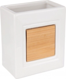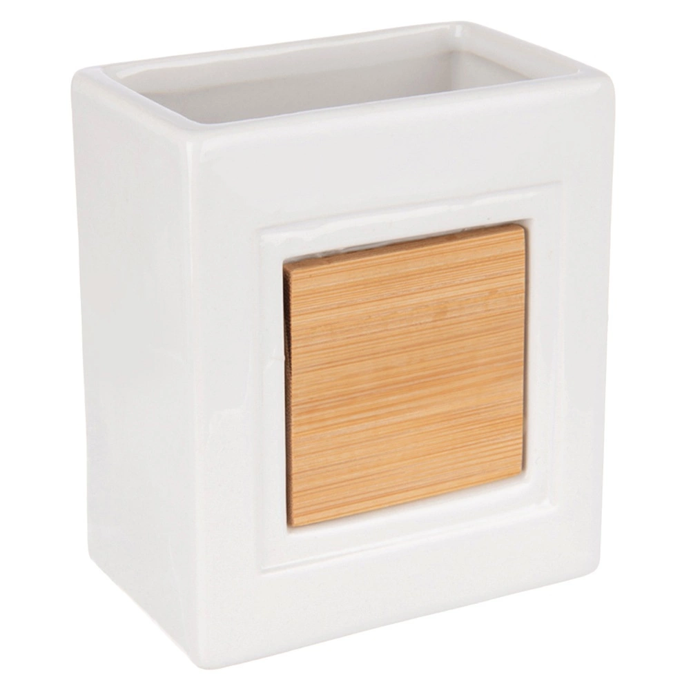 Lesklý biely povrch s bambusovým panelom pôsobí elegantne a udržiava kefky aj drobnosti poruke.