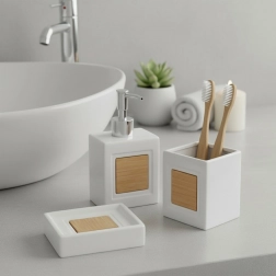 Elegantná 3-dielna kúpeľňová sada v bielom prevedení kombinuje odolný dolomit a prírodný bambus. Obsahuje dávkovač mydla 350 ml, kúpeľňový pohárik 330 ml a mydelničku. Minimalistický dizajn, jednoduchá údržba a univerzálny štýl pre moderné aj klasické kúpeľne.