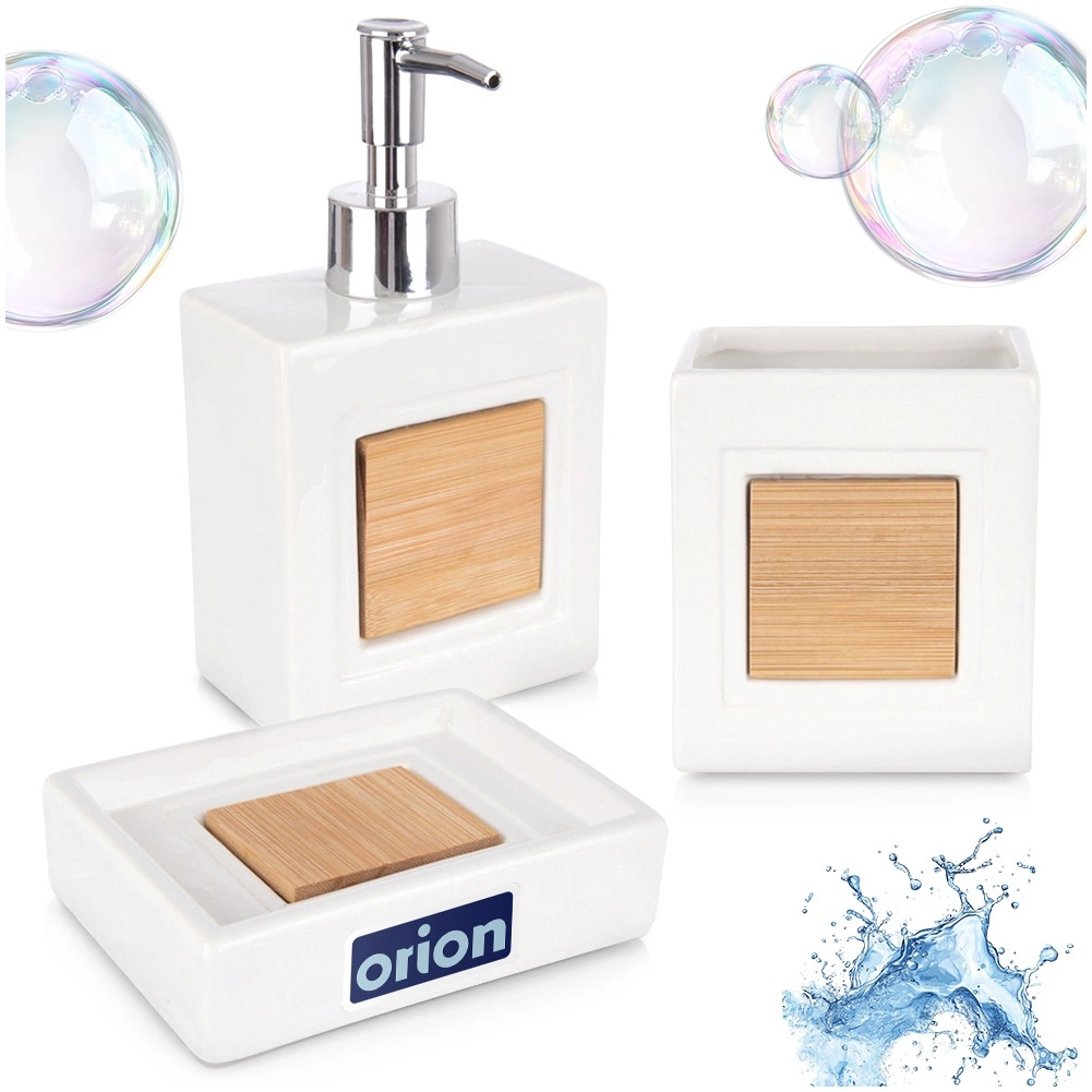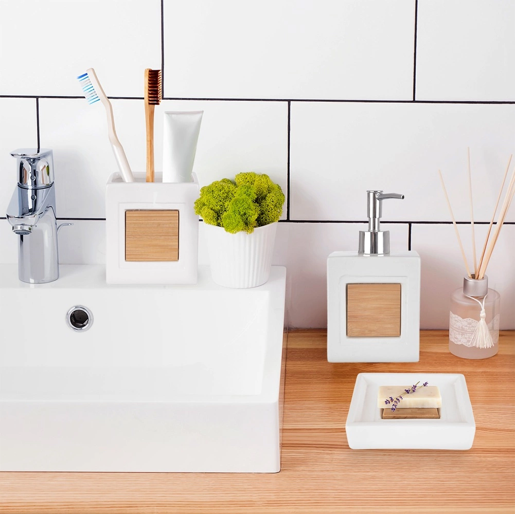 Súčasťou sady je dávkovač na tekuté mydlo s presným dávkovaním, pohárik na kefky alebo kozmetické doplnky a mydelnička na hygienické odkladanie tuhej kocky mydla. Ideálne do kúpeľne aj na toaletu – pomáha udržať poriadok a elegantný vzhľad.