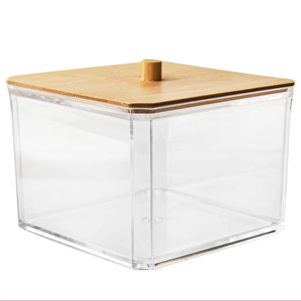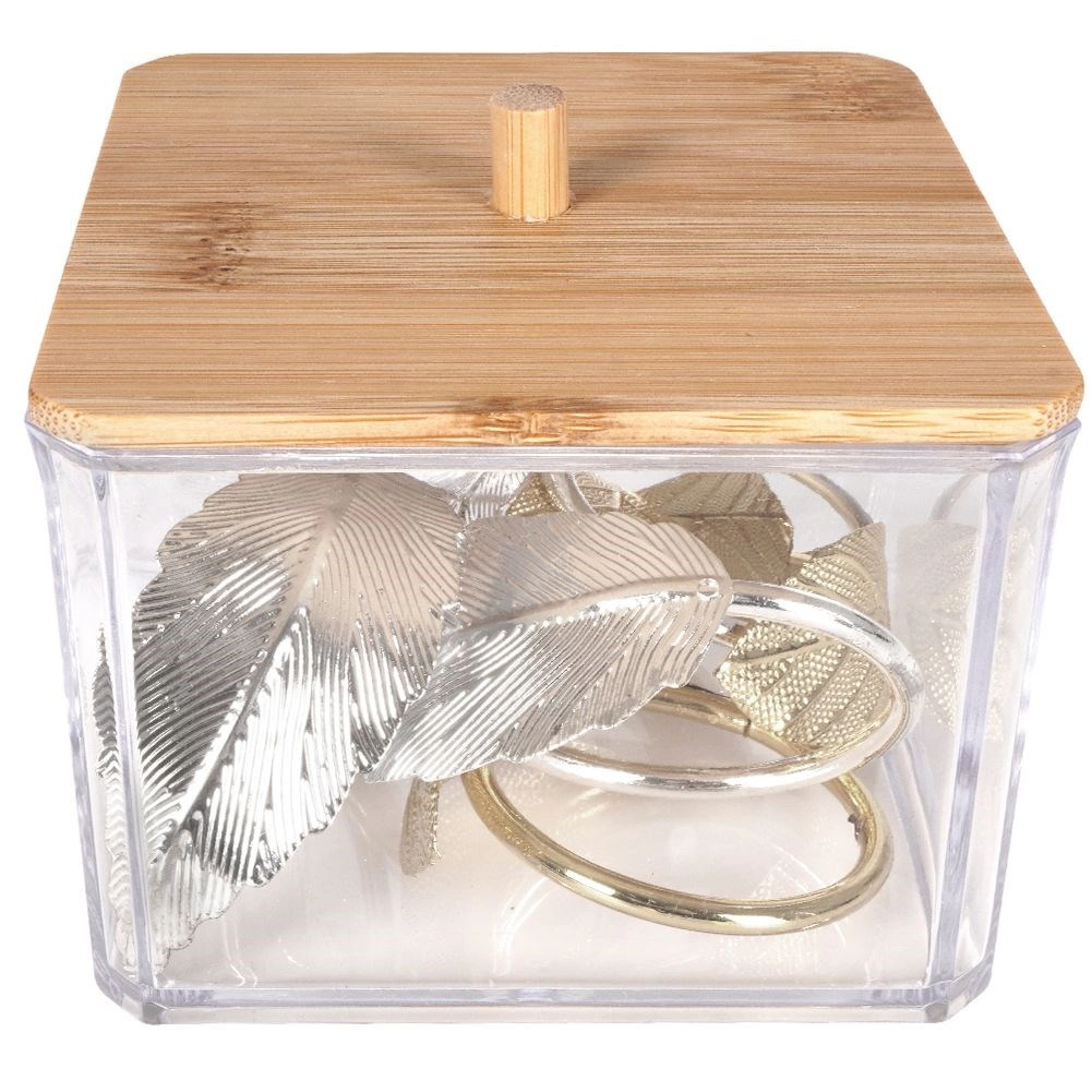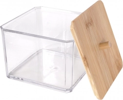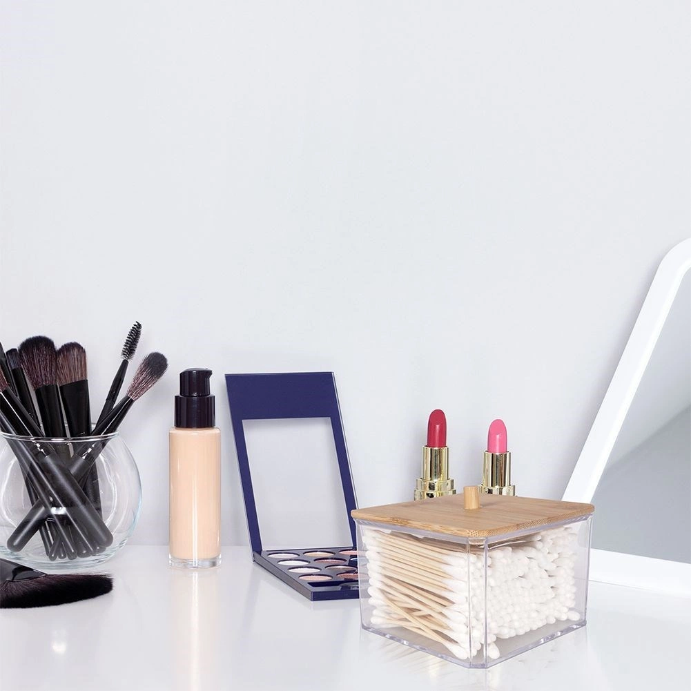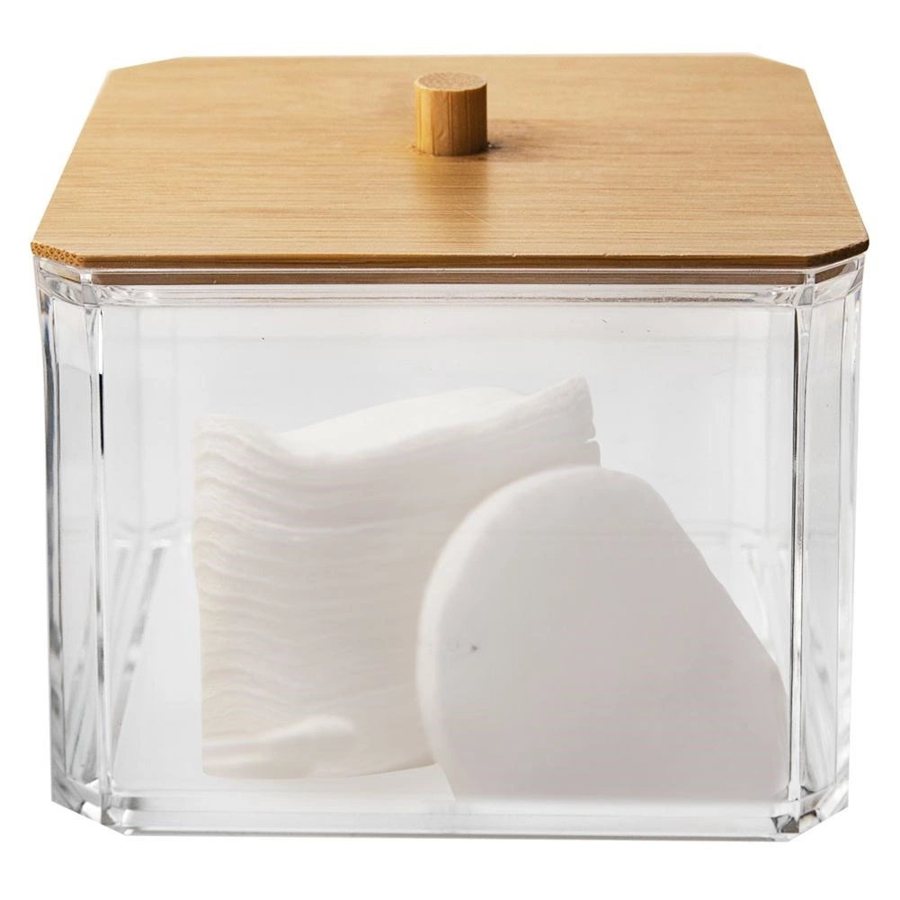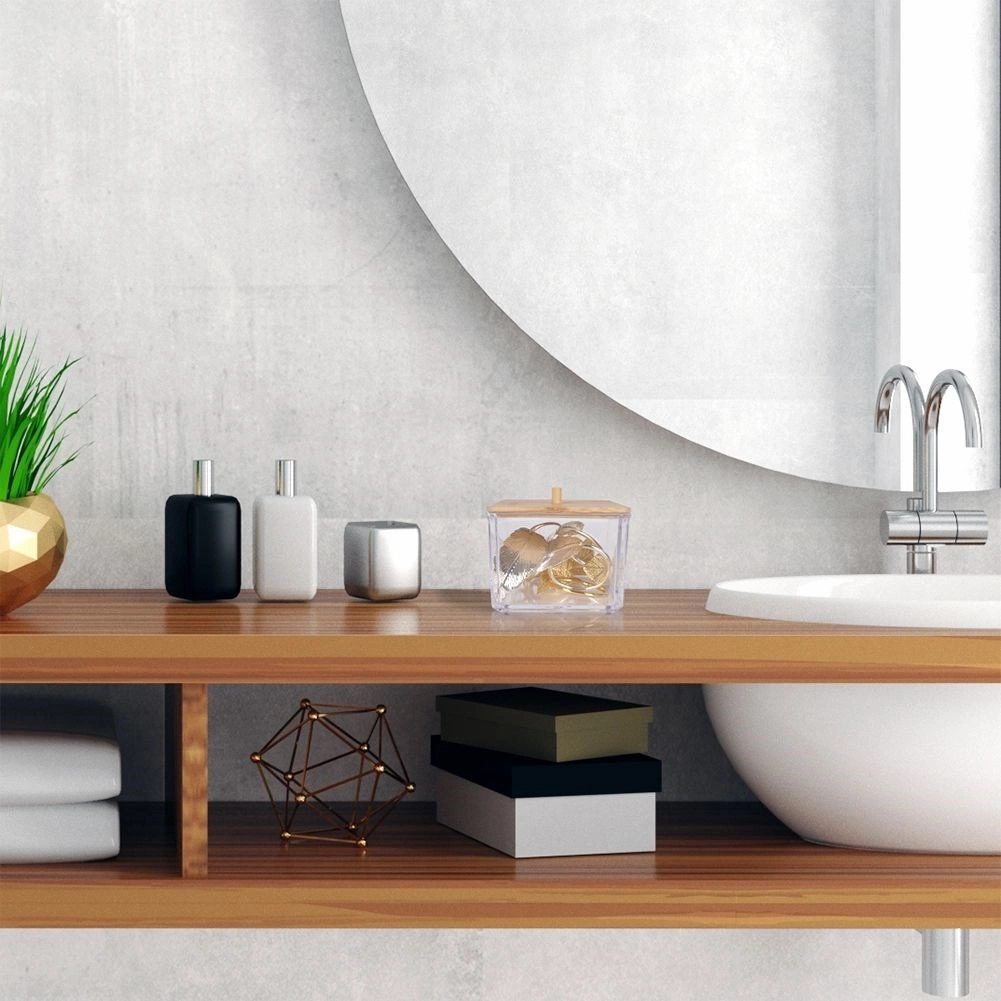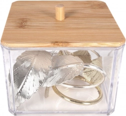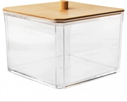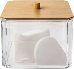 Tento elegantný box na vatové tyčinky kombinuje číre steny z odolného plastu a prírodný vzhľad bambusového viečka s praktickým gombíkom. Skvele sa hodí do kúpeľne, spálne aj na kozmetický kútik – udrží drobnosti prehľadne usporiadané a bez prachu.