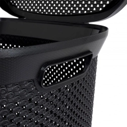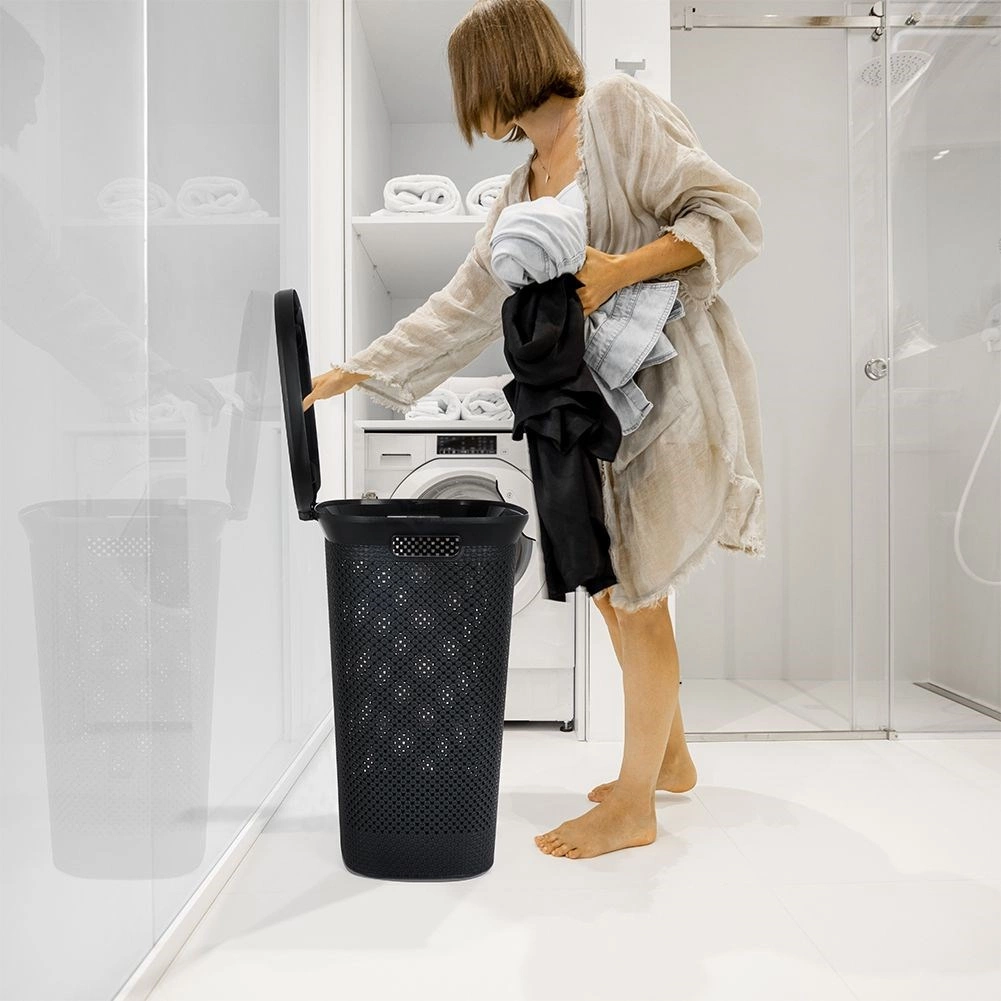 Praktický a štýlový plastový kôš na bielizeň s objemom 60 litrov s uzatvárateľným vekom a bočnými úchytmi. Vďaka vetranej perforácii obmedzuje vlhkosť a zápach, čierny klasický dizajn elegantne zapadne do každej kúpeľne či práčovne.