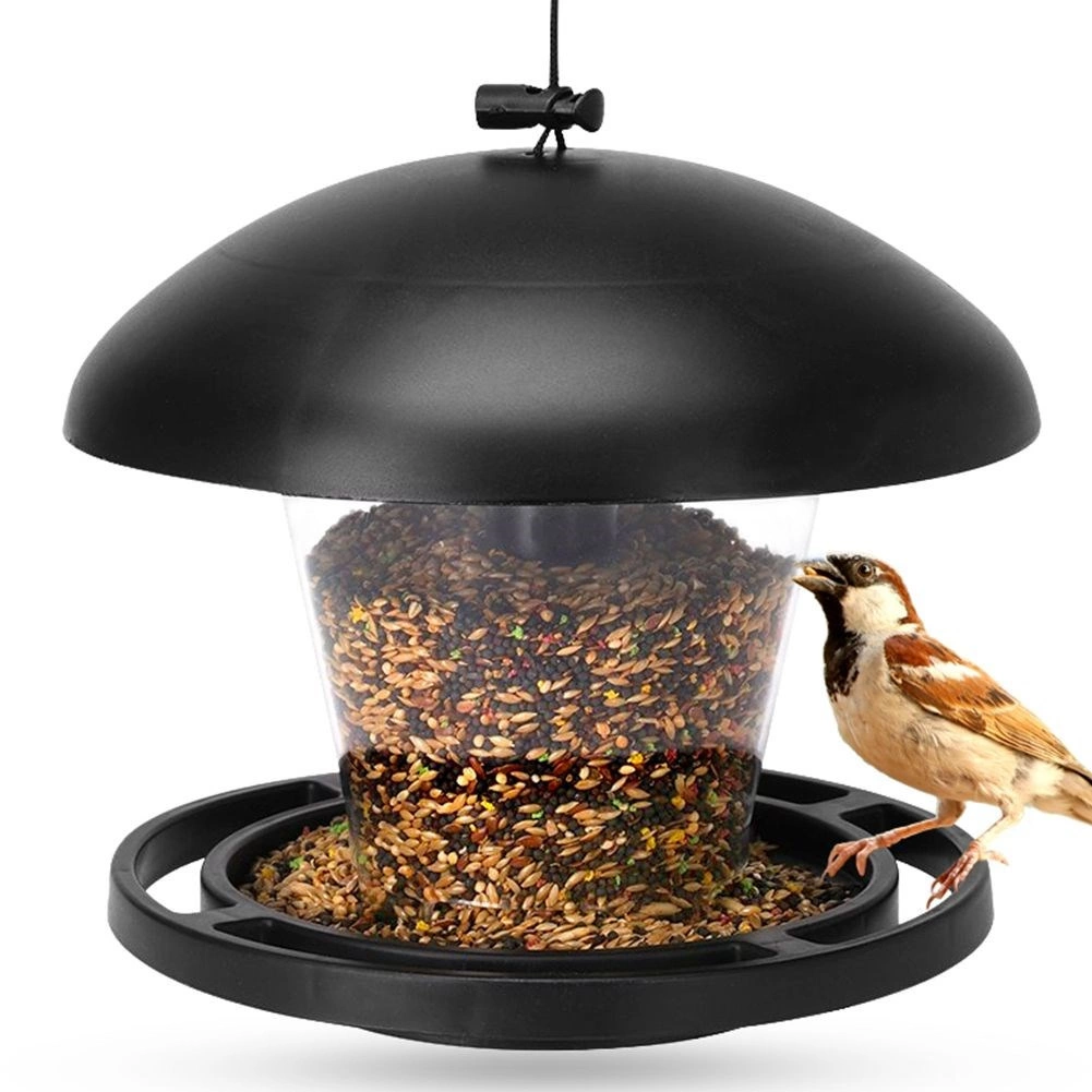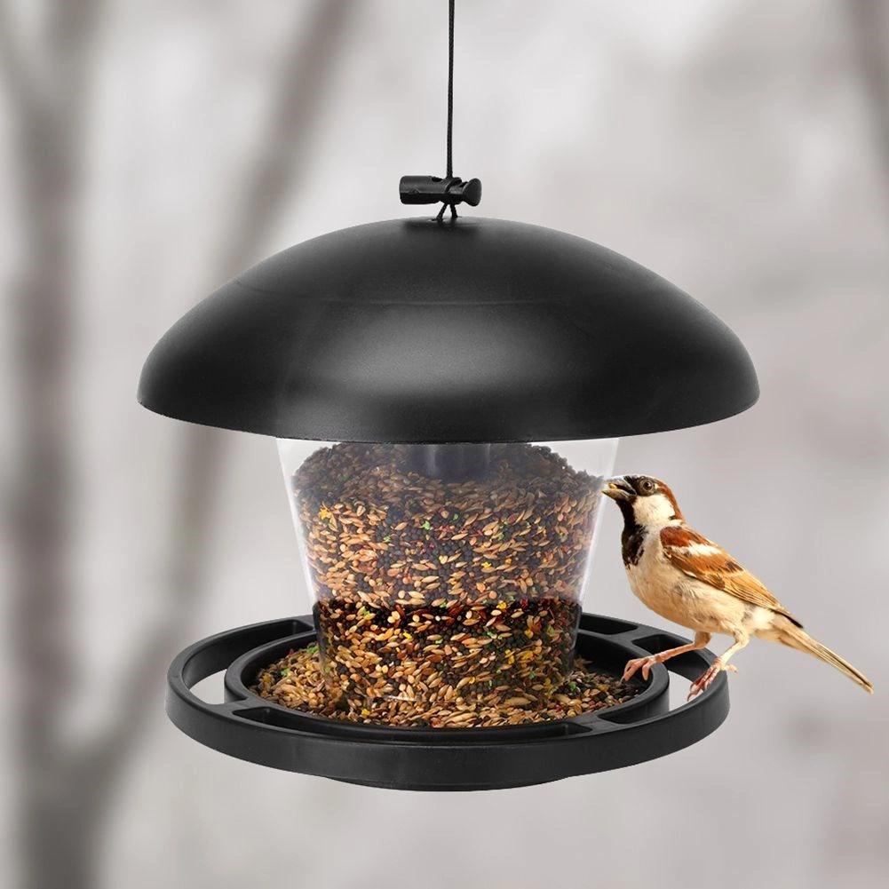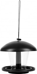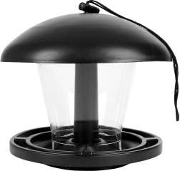 Štýlové závesné kŕmidlo pre vtáky s rozmermi 19 × 19 × 16,5 cm s priehľadným zásobníkom a čiernou strechou poskytuje spoľahlivú ochranu pred dažďom, jednoduchú kontrolu množstva krmiva a pohodlné prisadnutie vtákov. Vďaka pevnej šnúrke ho jednoducho zavesíte na strom či háčik na balkóne.