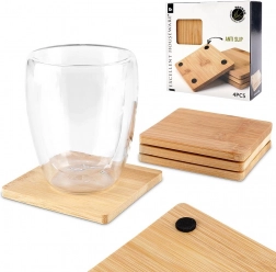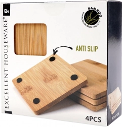 Štýlová sada štyroch štvorcových podtáckov z bambusového dreva chráni váš stôl pred teplom, vlhkosťou a škrabancami. Podtácky majú rozmery 9,7 × 10 × 0,7 cm, sú odolné, ekologické a vďaka nekĺzavým podložkám stabilne držia na mieste. Skvelé pre teplé aj studené nápoje a ako elegantná dekorácia stola.