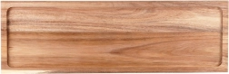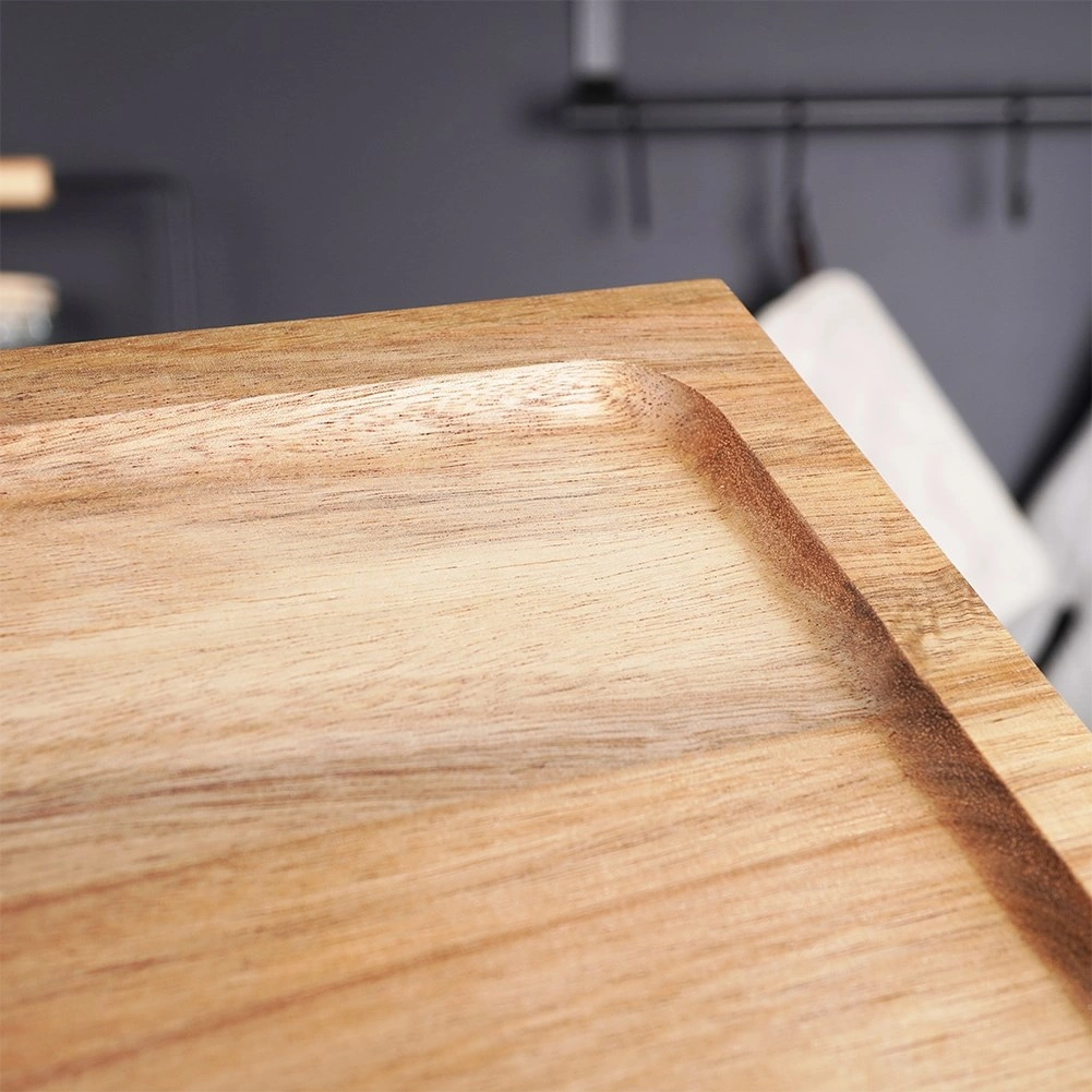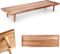 Elegantná drevená doska z akáciového dreva na stabilných nožičkách pre štýlové servírovanie aj krájanie. Ponúka zvýšenú konštrukciu pre ľahké naberanie, ochranný zvýšený okraj proti skĺznutiu potravín a prírodný, odolný materiál, ktorý nenasáva pachy a rýchlo schne.