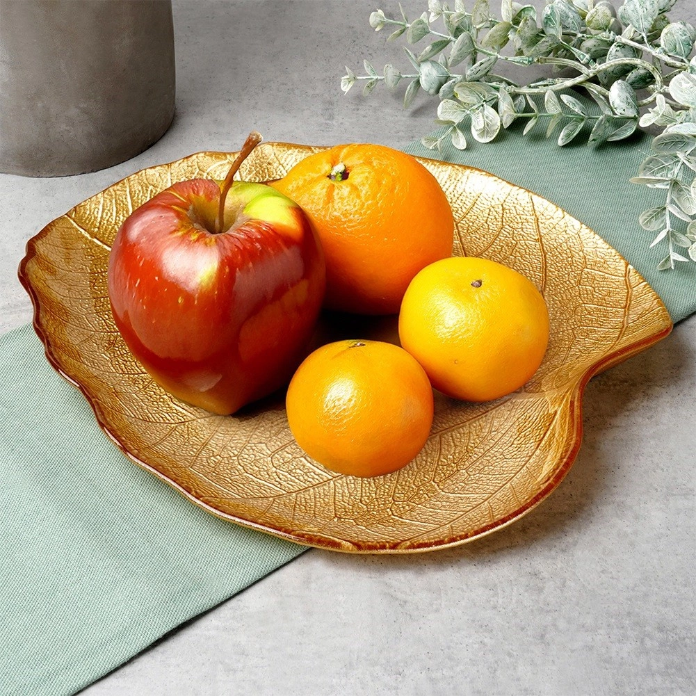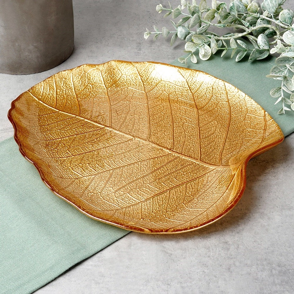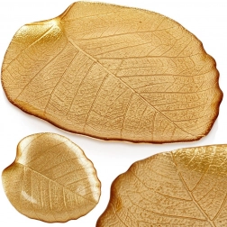 Elegantný servírovací tanier v tvare listu zo skla so zlatou povrchovou úpravou. Vďaka plastickej štruktúre žiliek pôsobí luxusne a na stole sa stane dekoratívnou dominantou. Ideálny na servírovanie dezertov a občerstvenia, ale aj ako štýlová odkladacia miska na šperky či ako tác pod sviečky. Rozmery 27,5 × 24 × 2,5 cm.